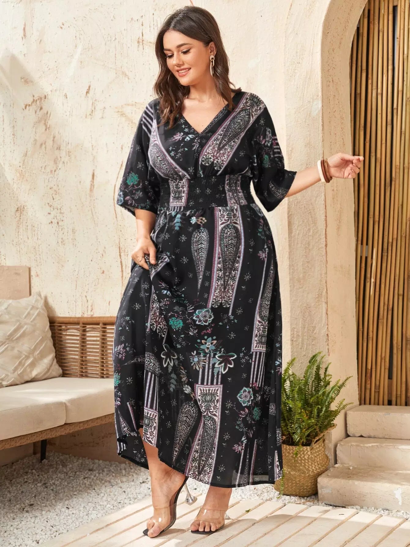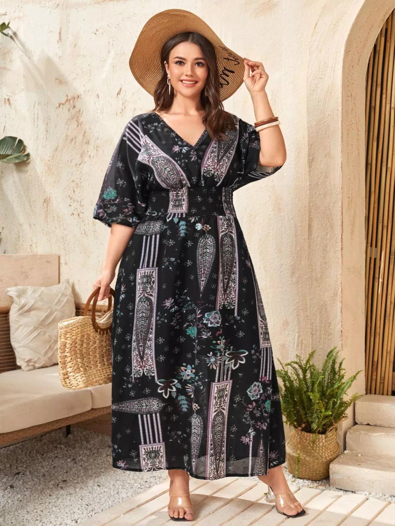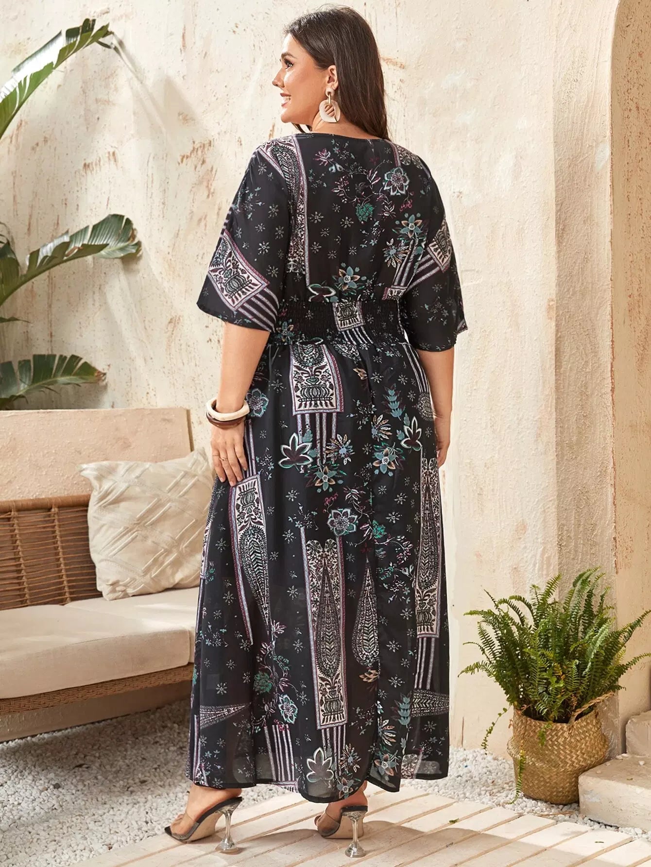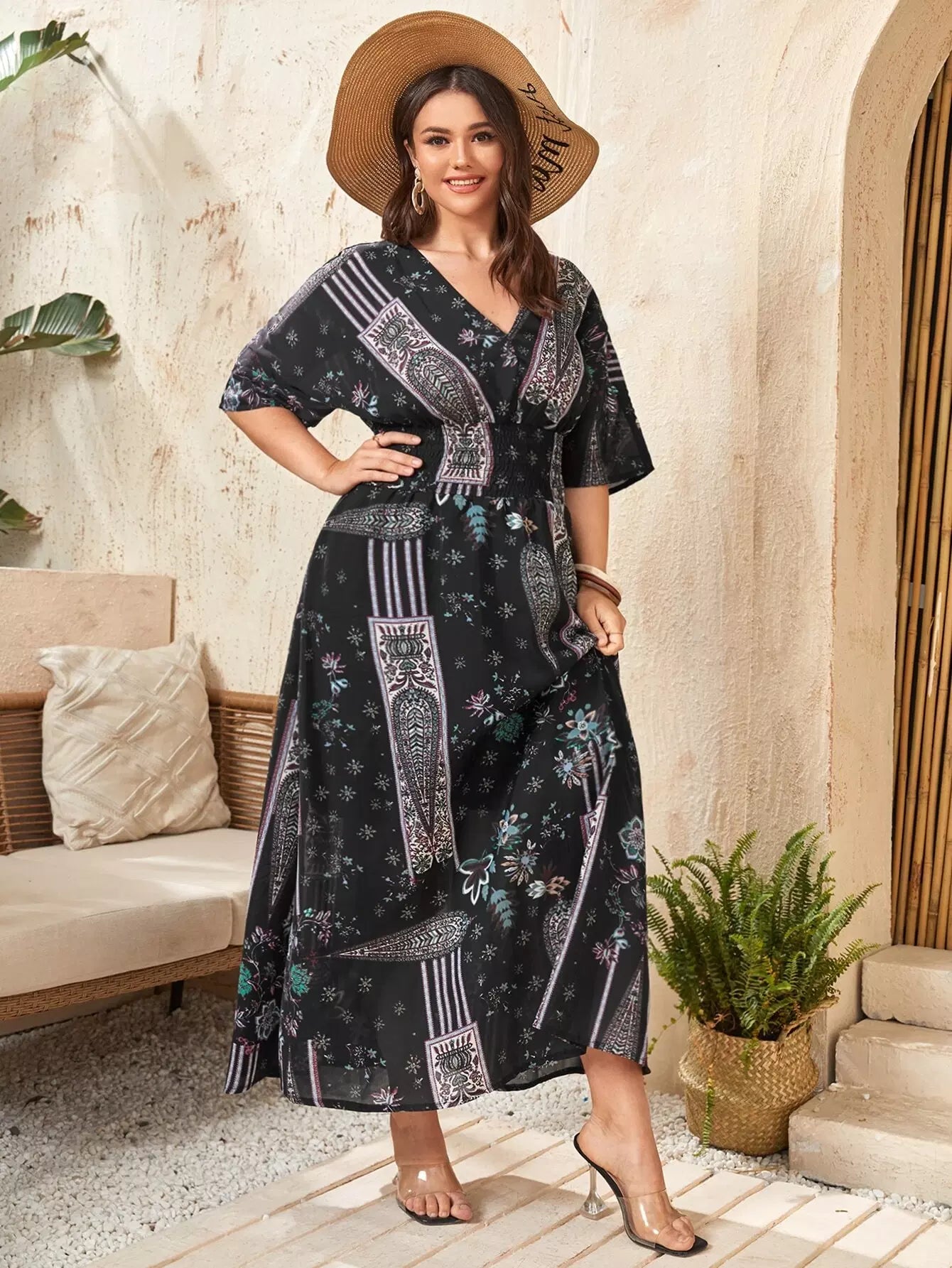فستان زائد بطبعة زهور مطبوع على الخصر بشيرد