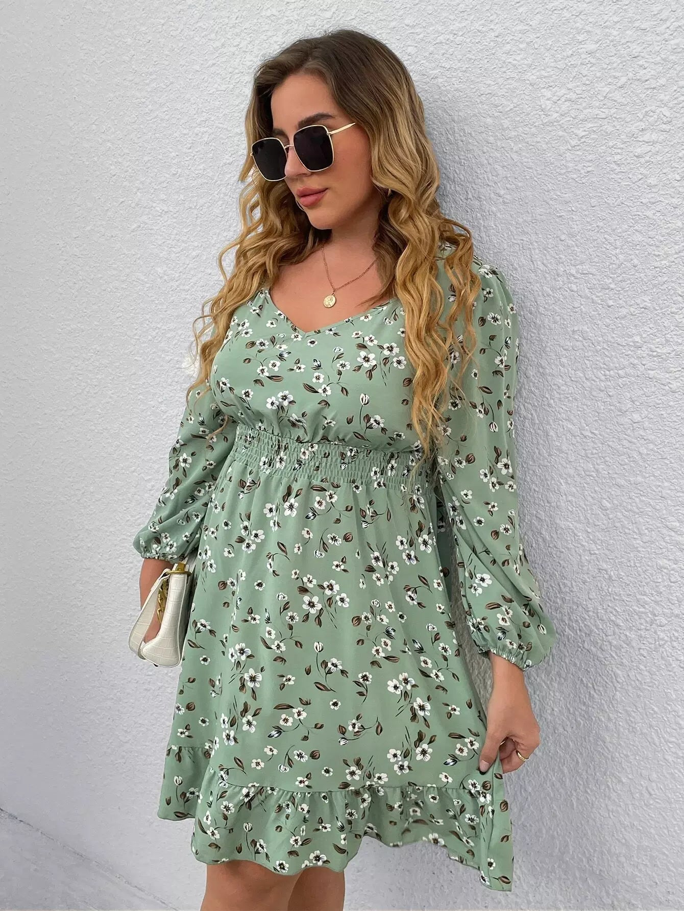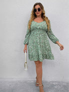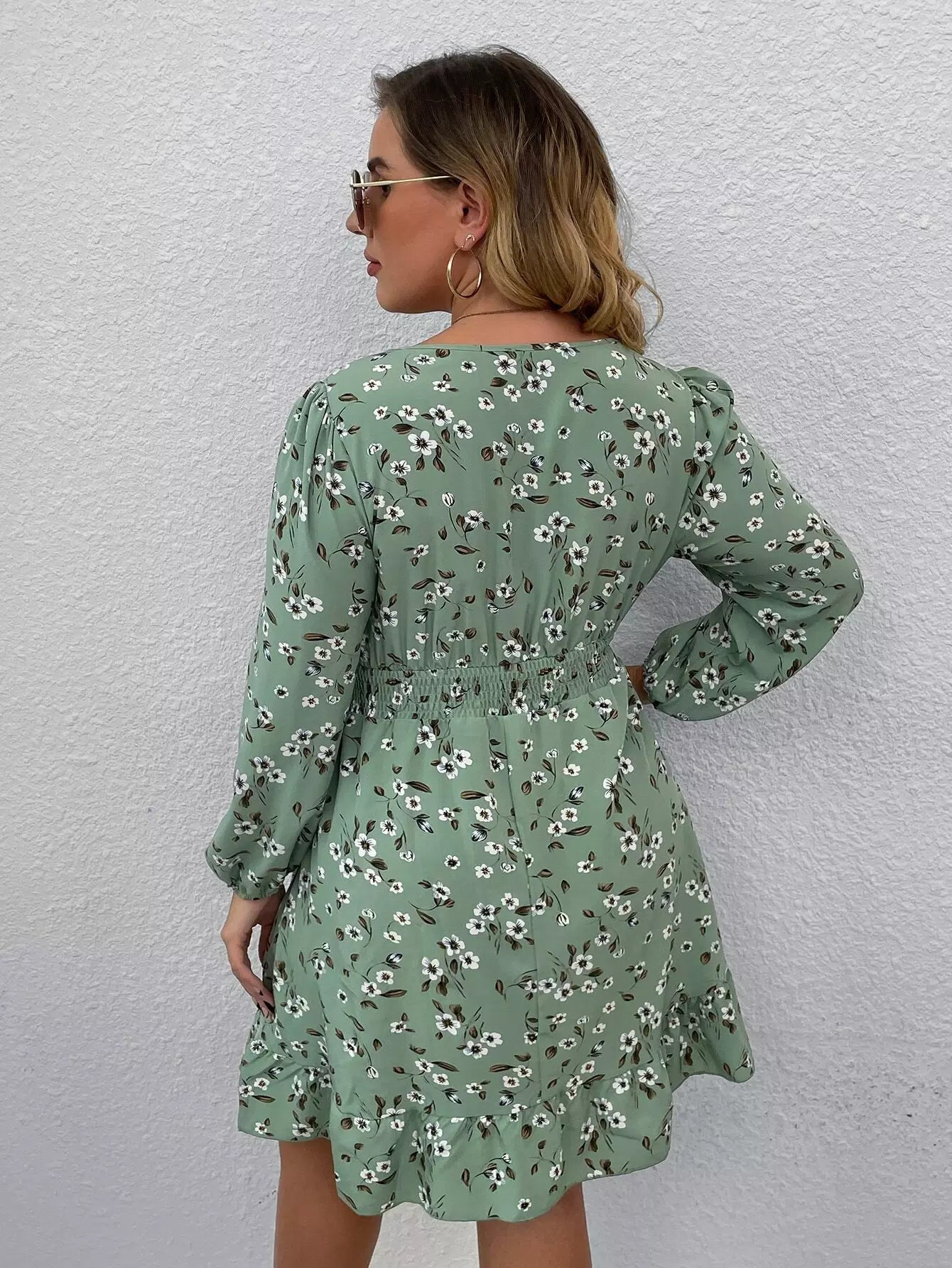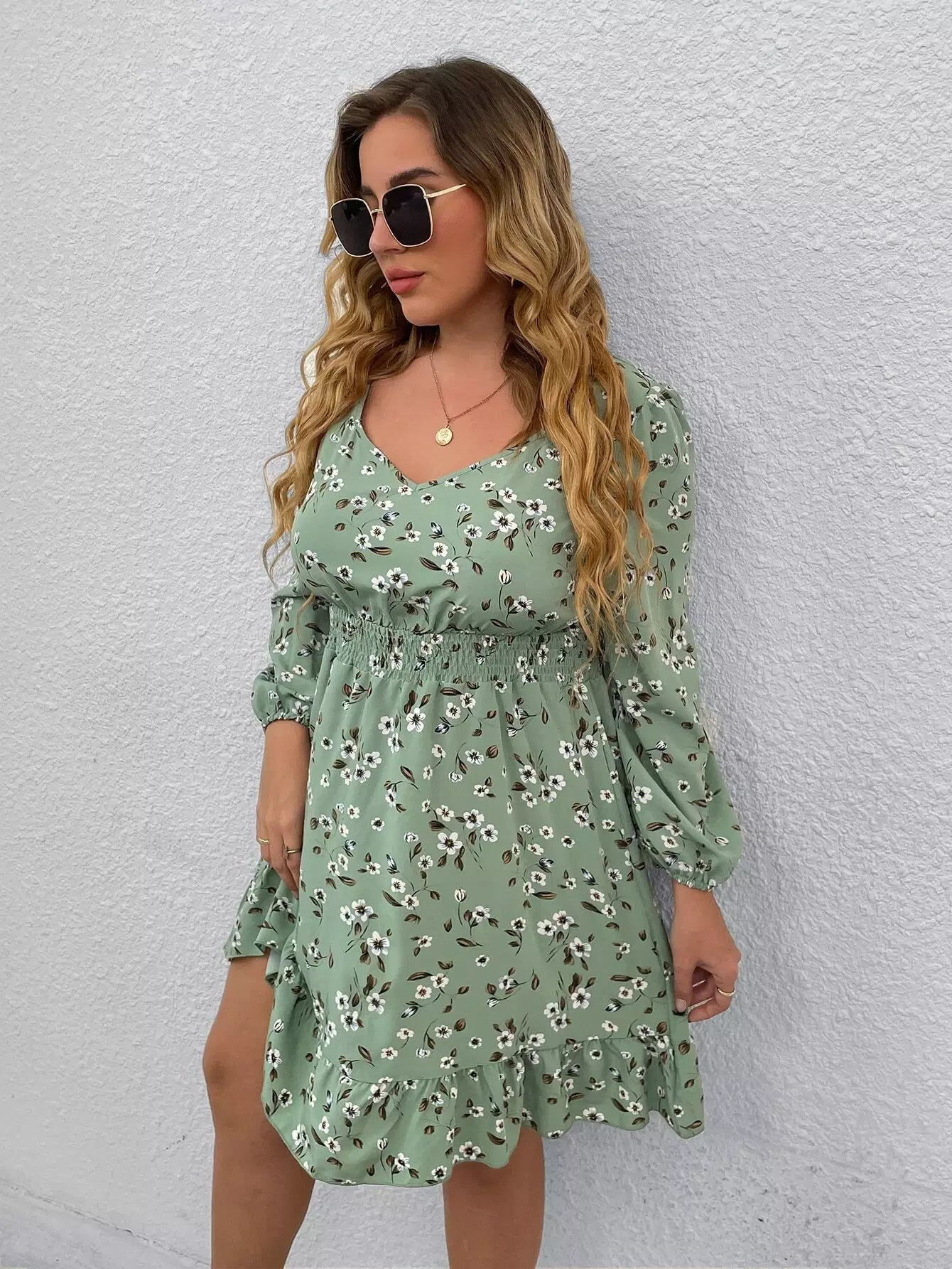 فستان كشكش بحافة كشكش مطبوع بنقشة زهور زائد برقبة على شكل قلب مفتوح