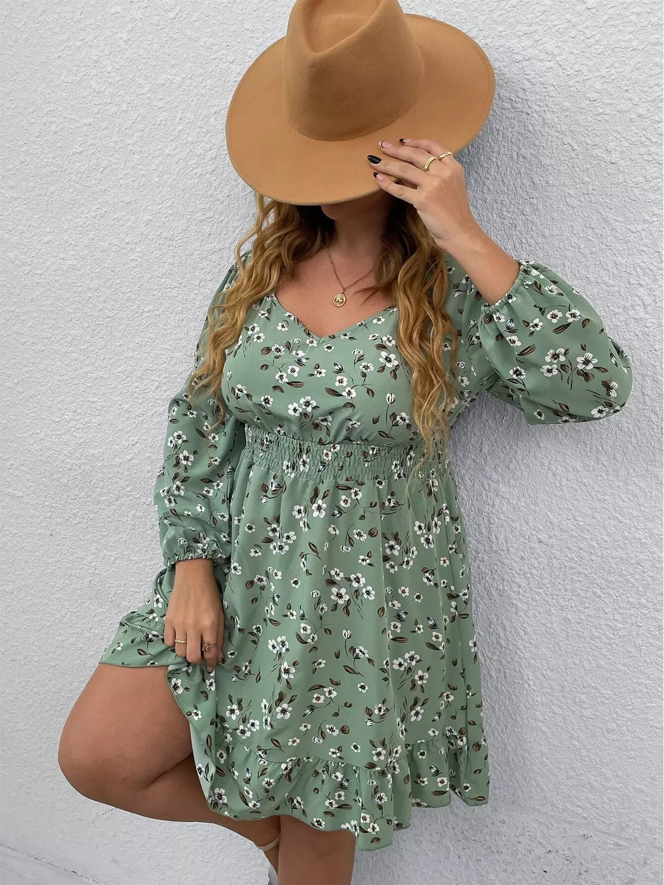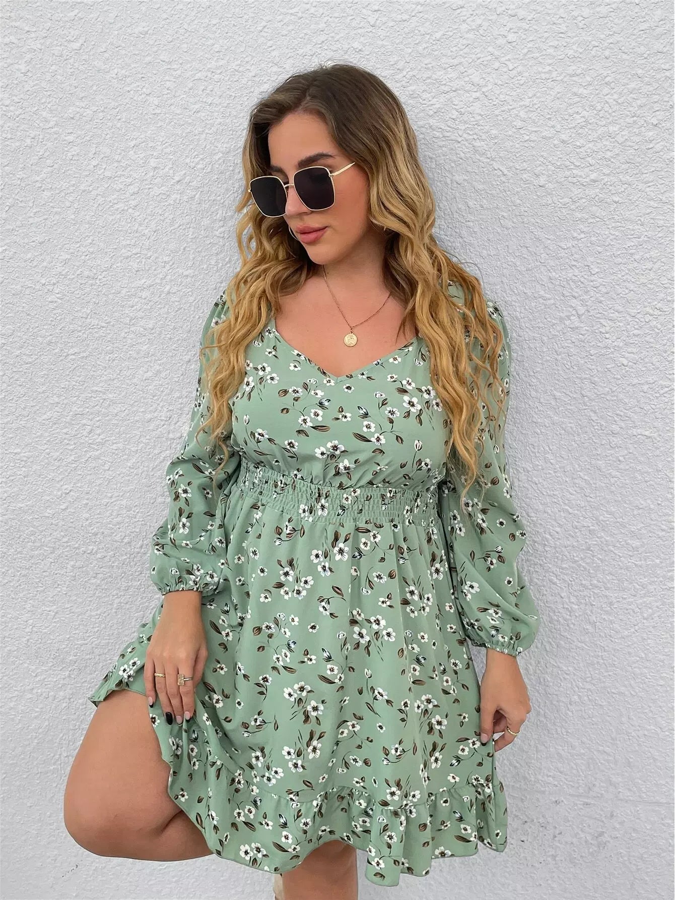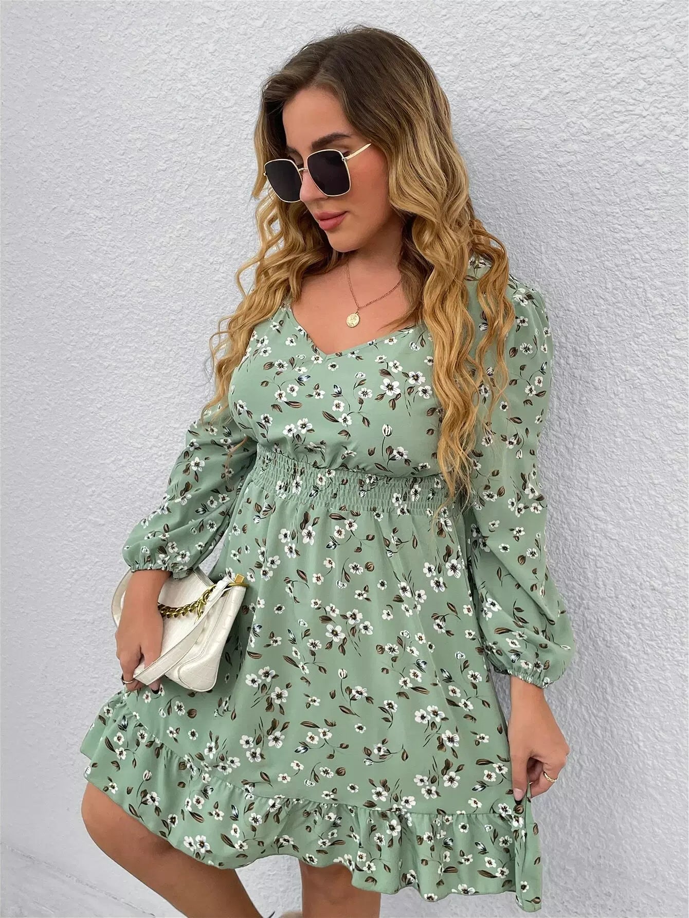 فستان كشكش بحافة كشكش مطبوع بنقشة زهور زائد برقبة على شكل قلب مفتوح
