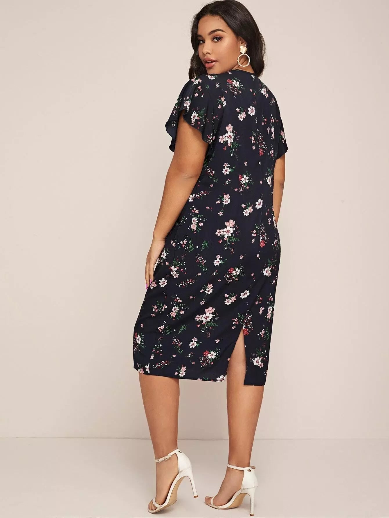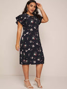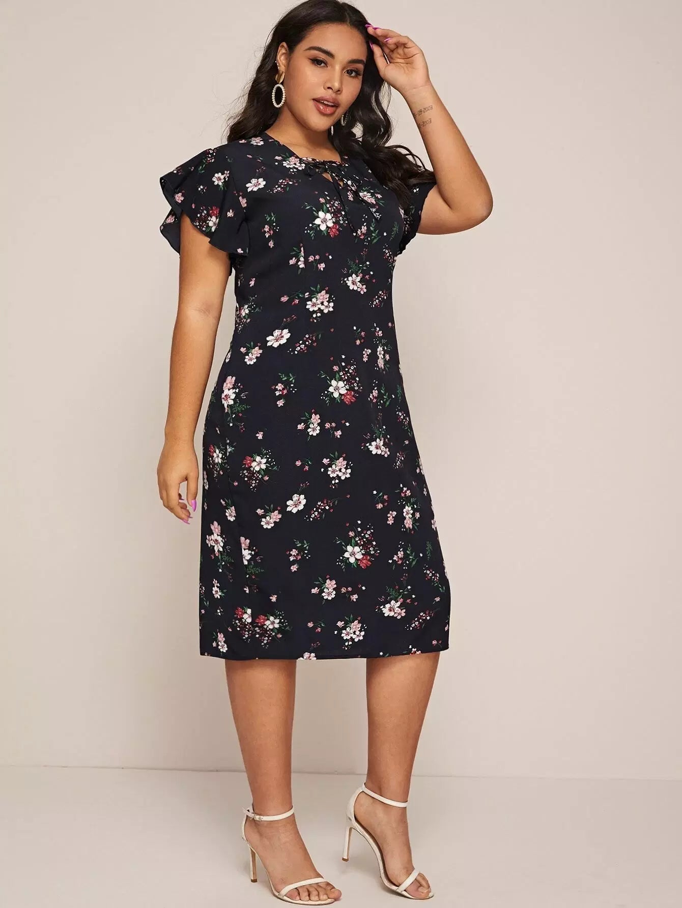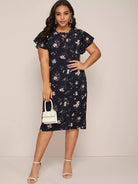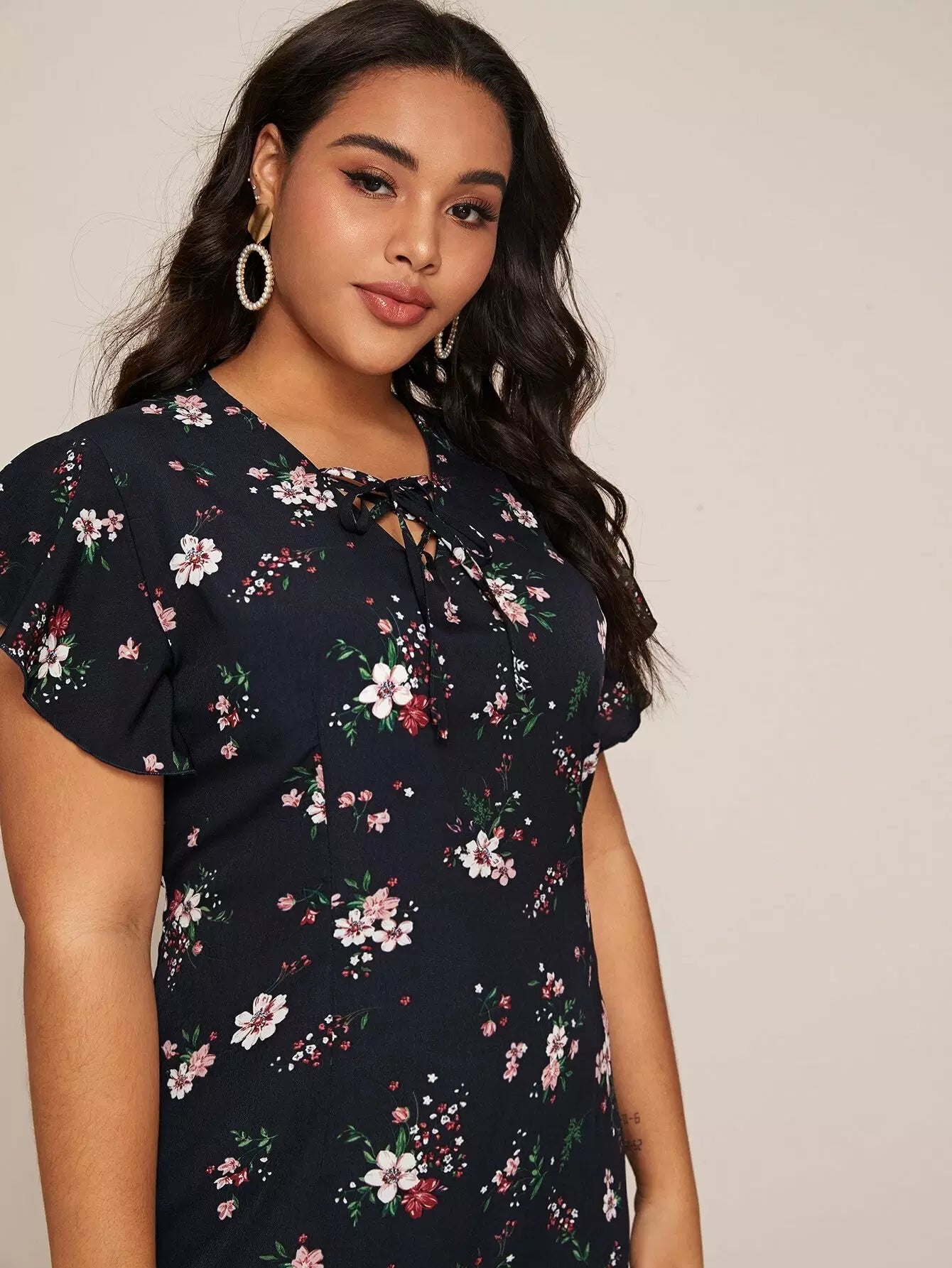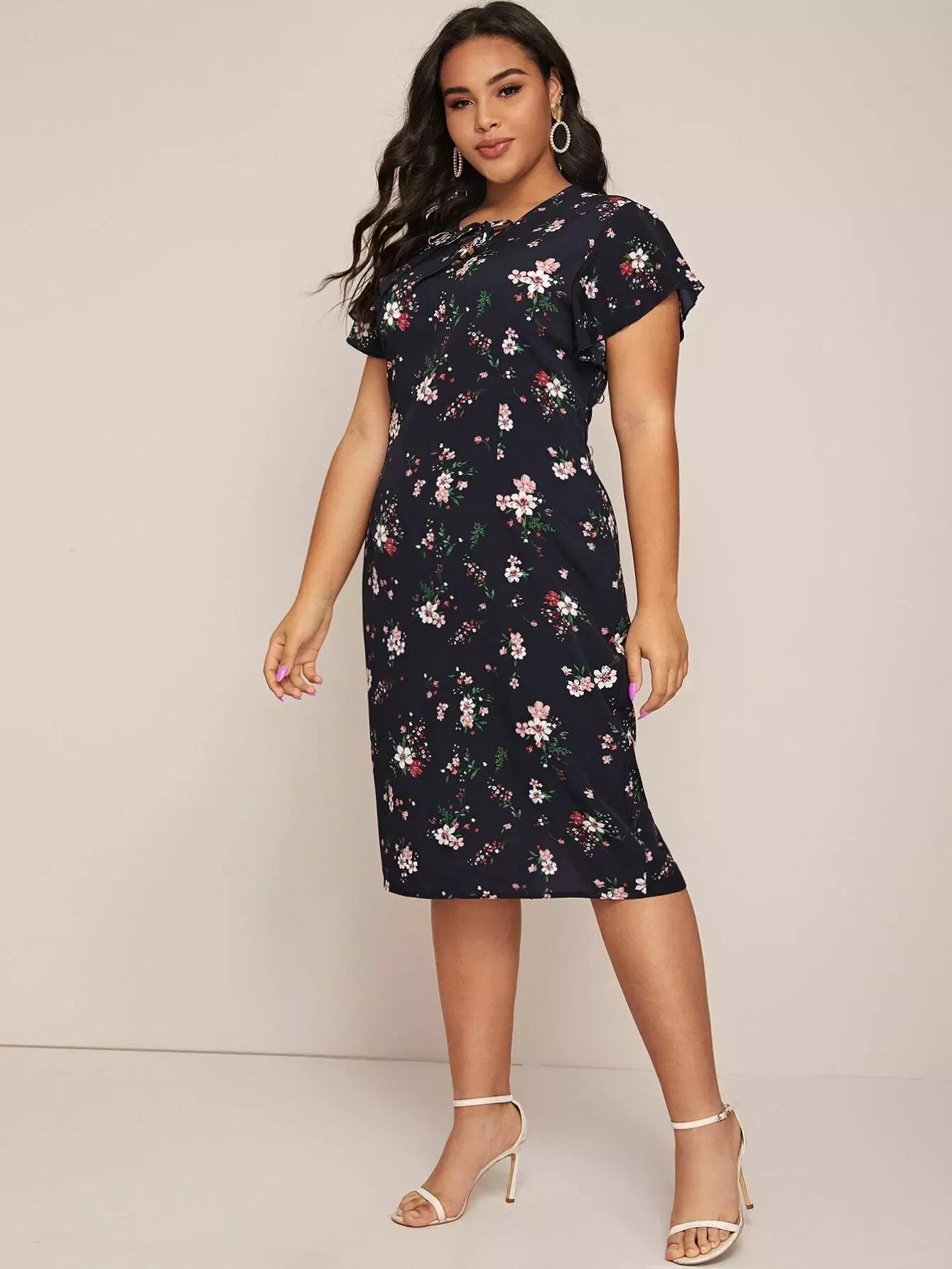 فستان مزين بطبعات زهور زائد مطبوع بربطة عنق أمامية منقسمة من الأمام
