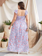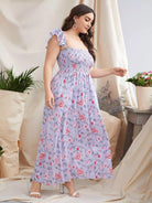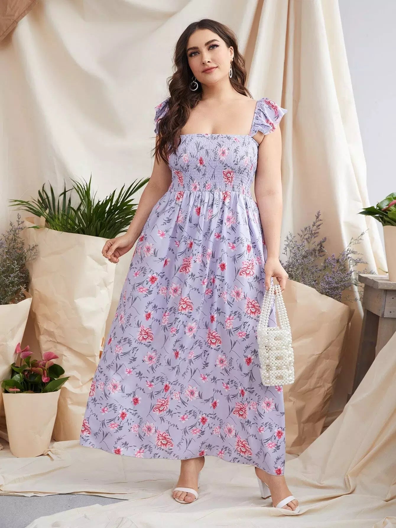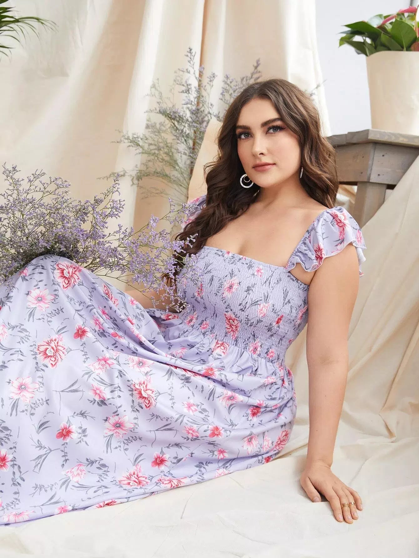 فستان بحواف كشكش على شكل حرف A هوائي زائد زهري مزين بشراشيب زهرية