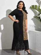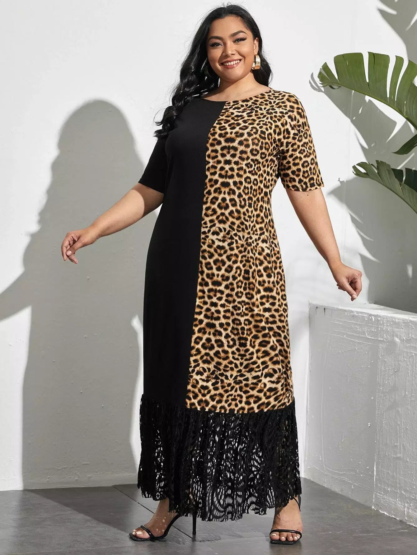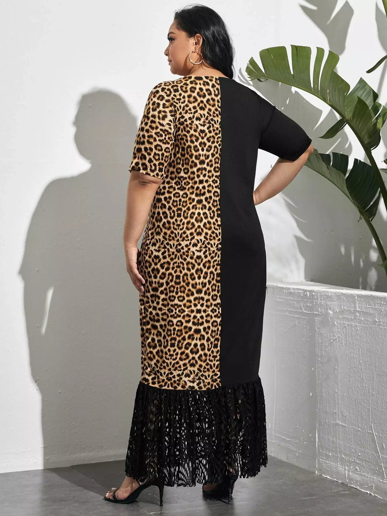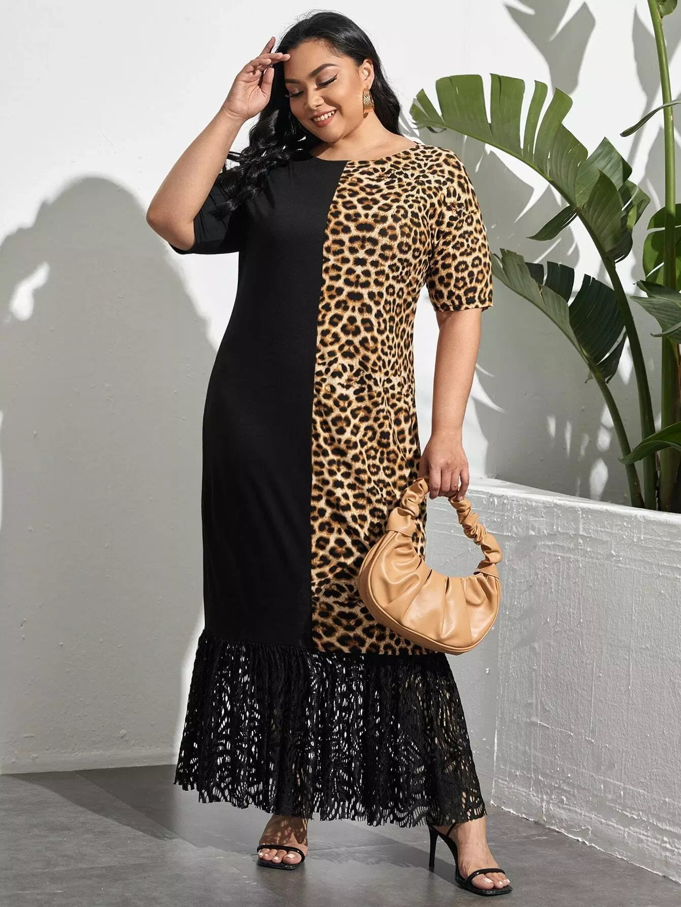 فستان بحافة كشكش من الدانتيل المربّع بلون جلد النمر بلون مغاير