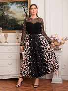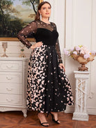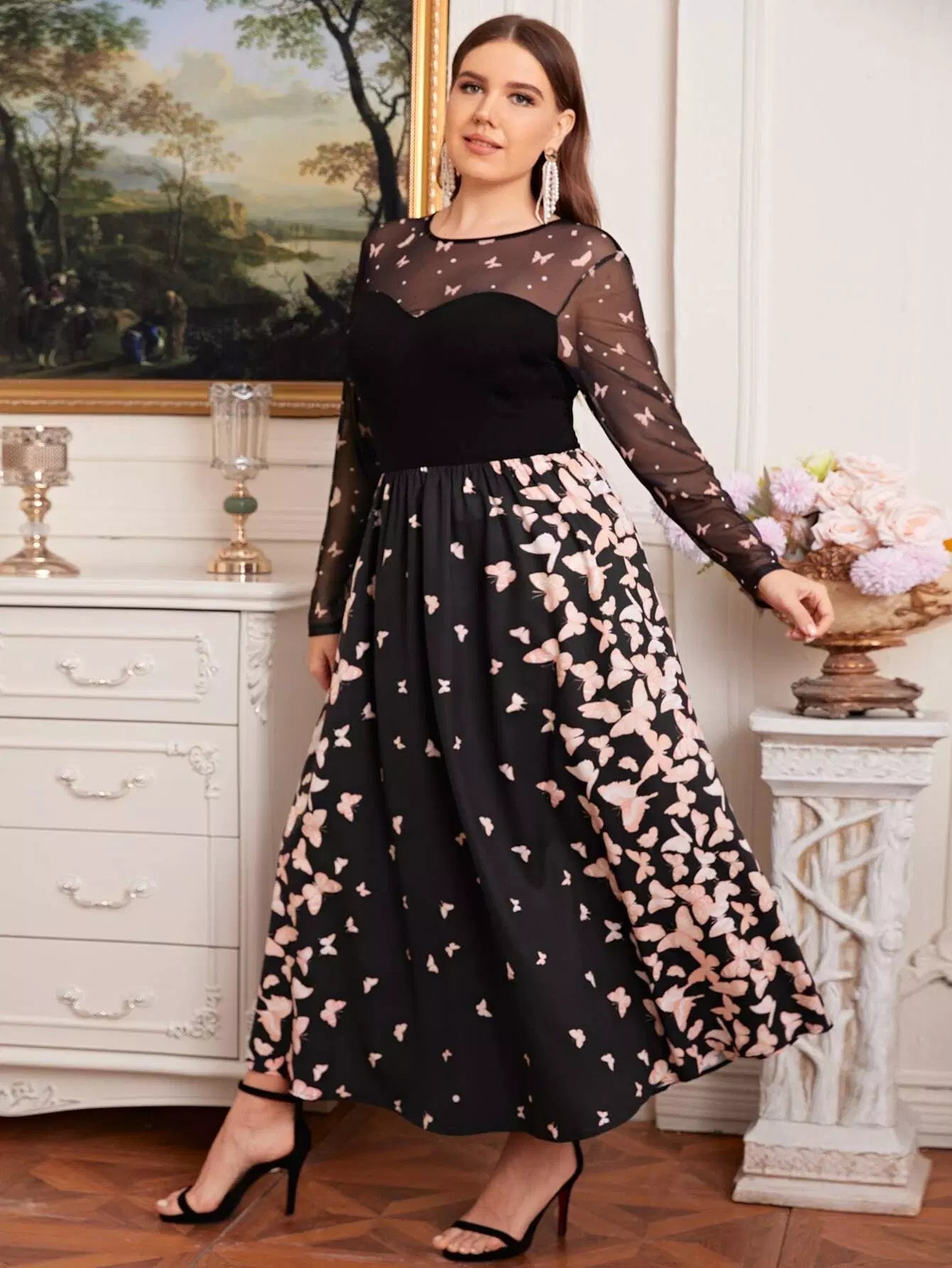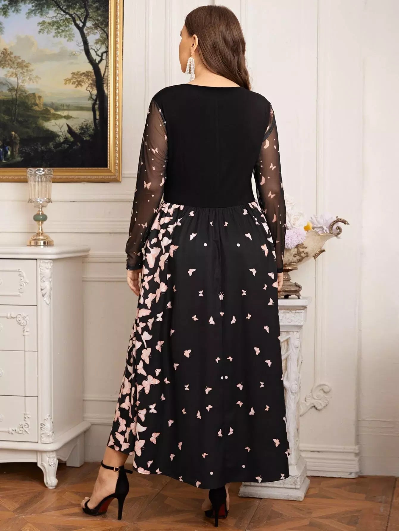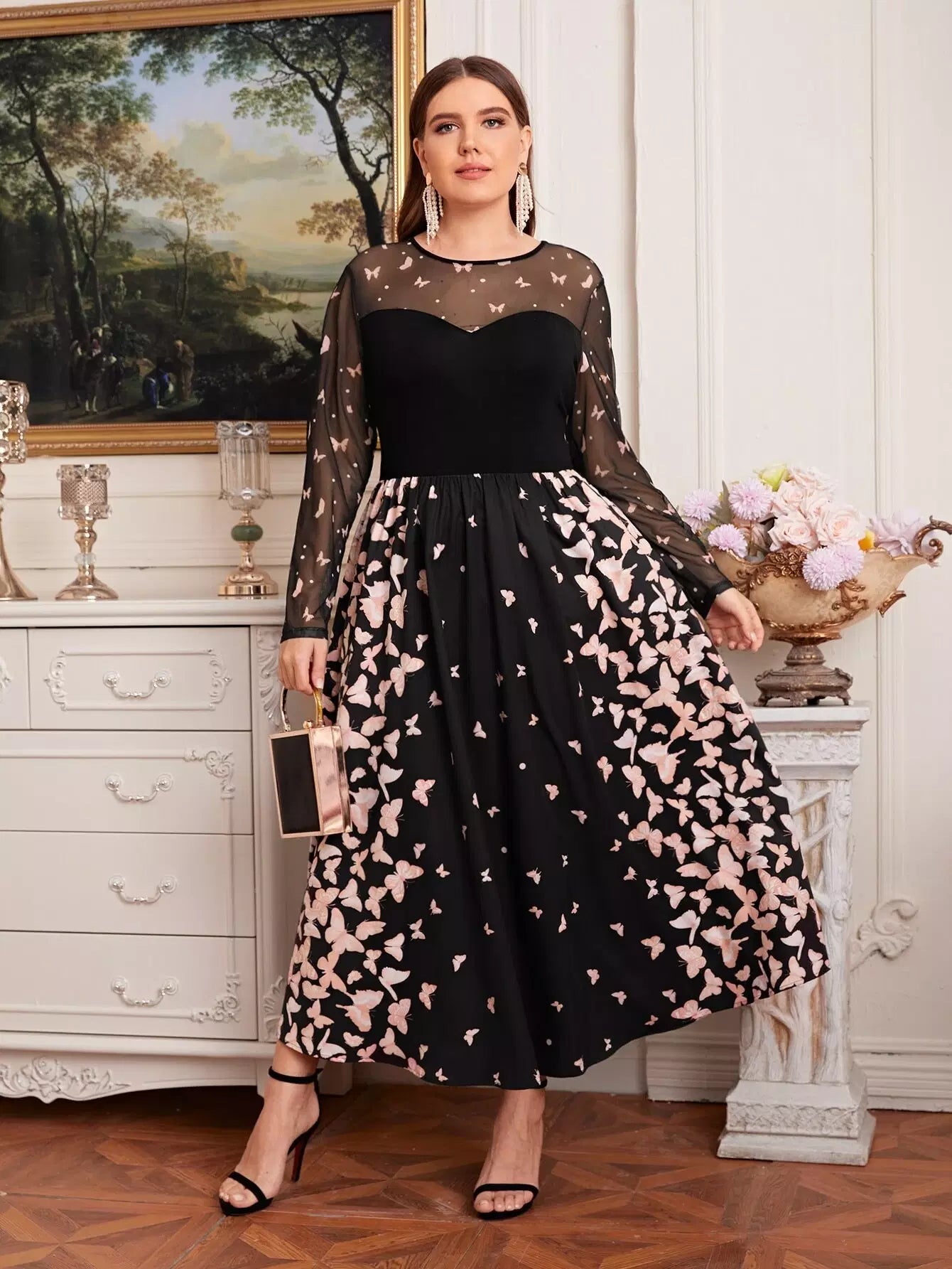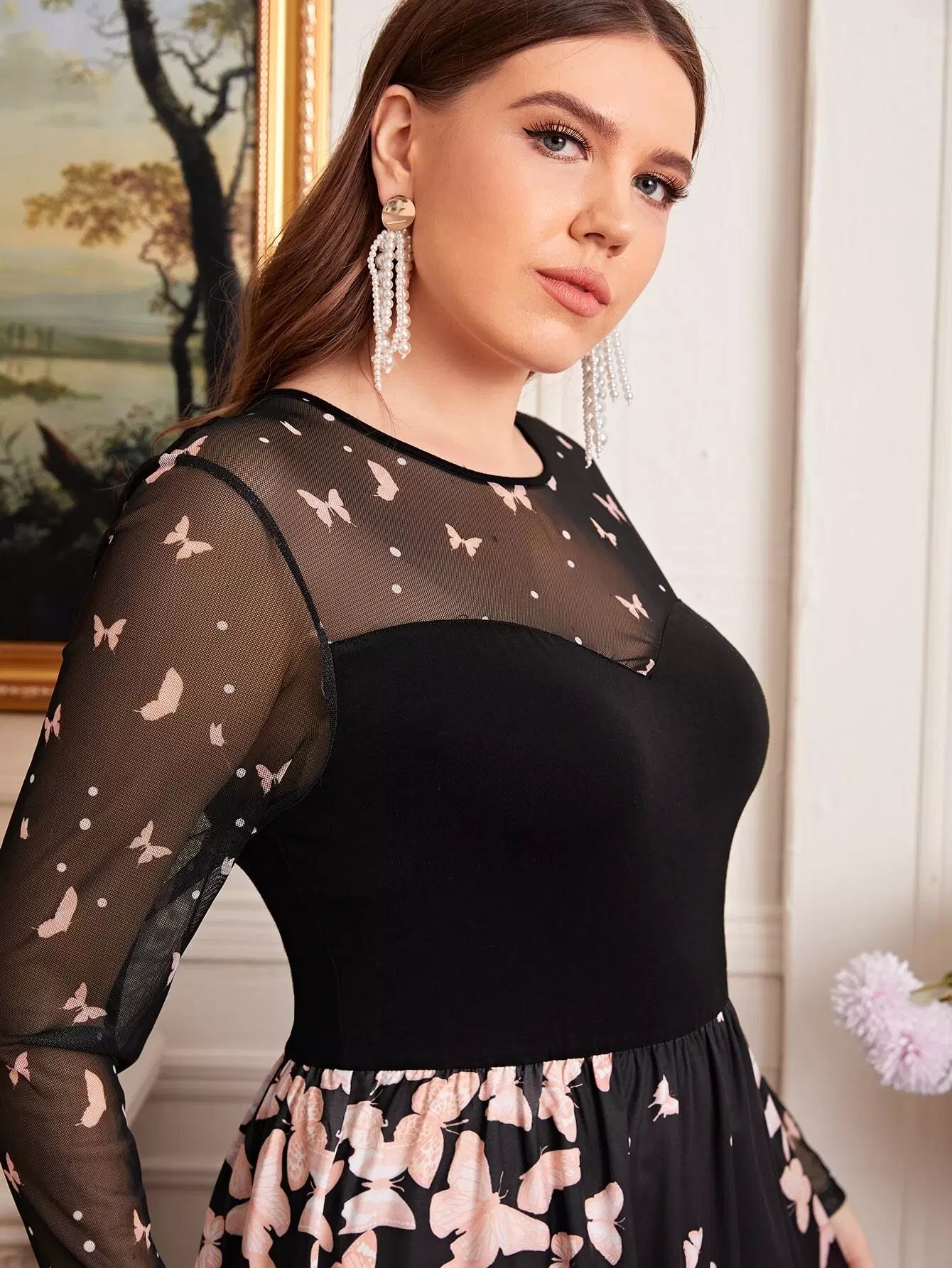فستان مزين بنقشة فراشة بأكمام ونير شبكي زائد