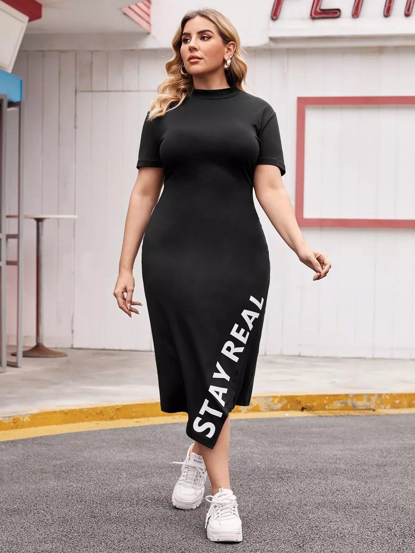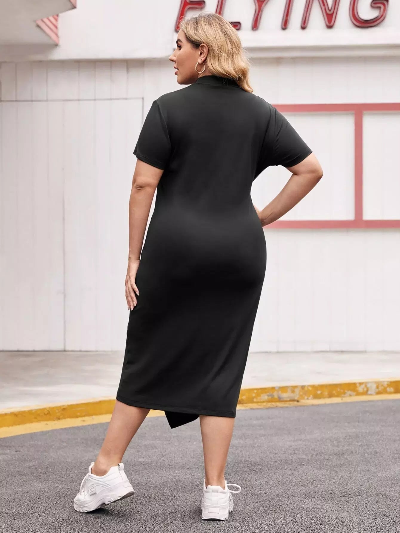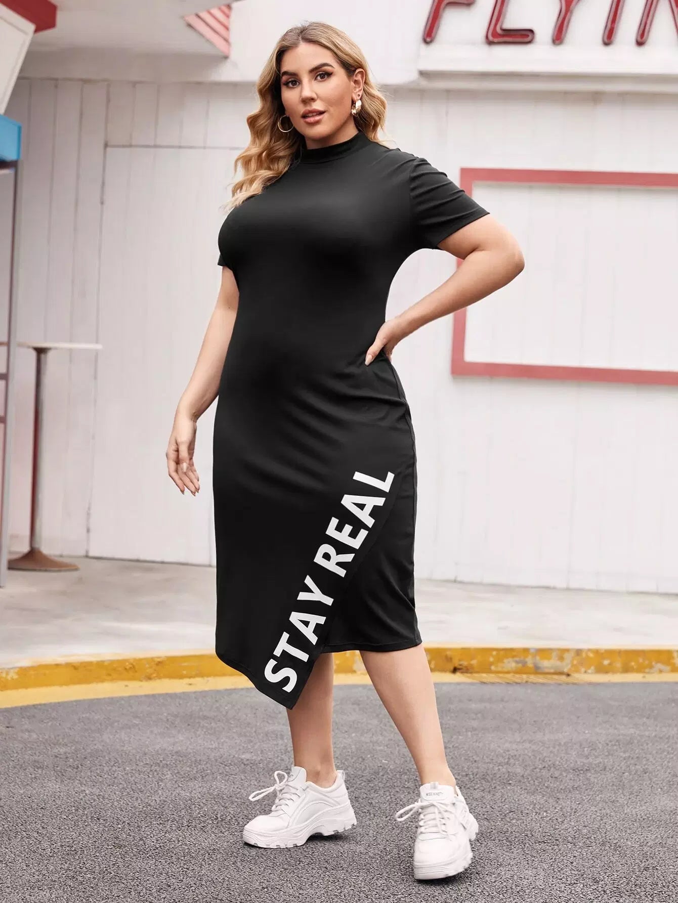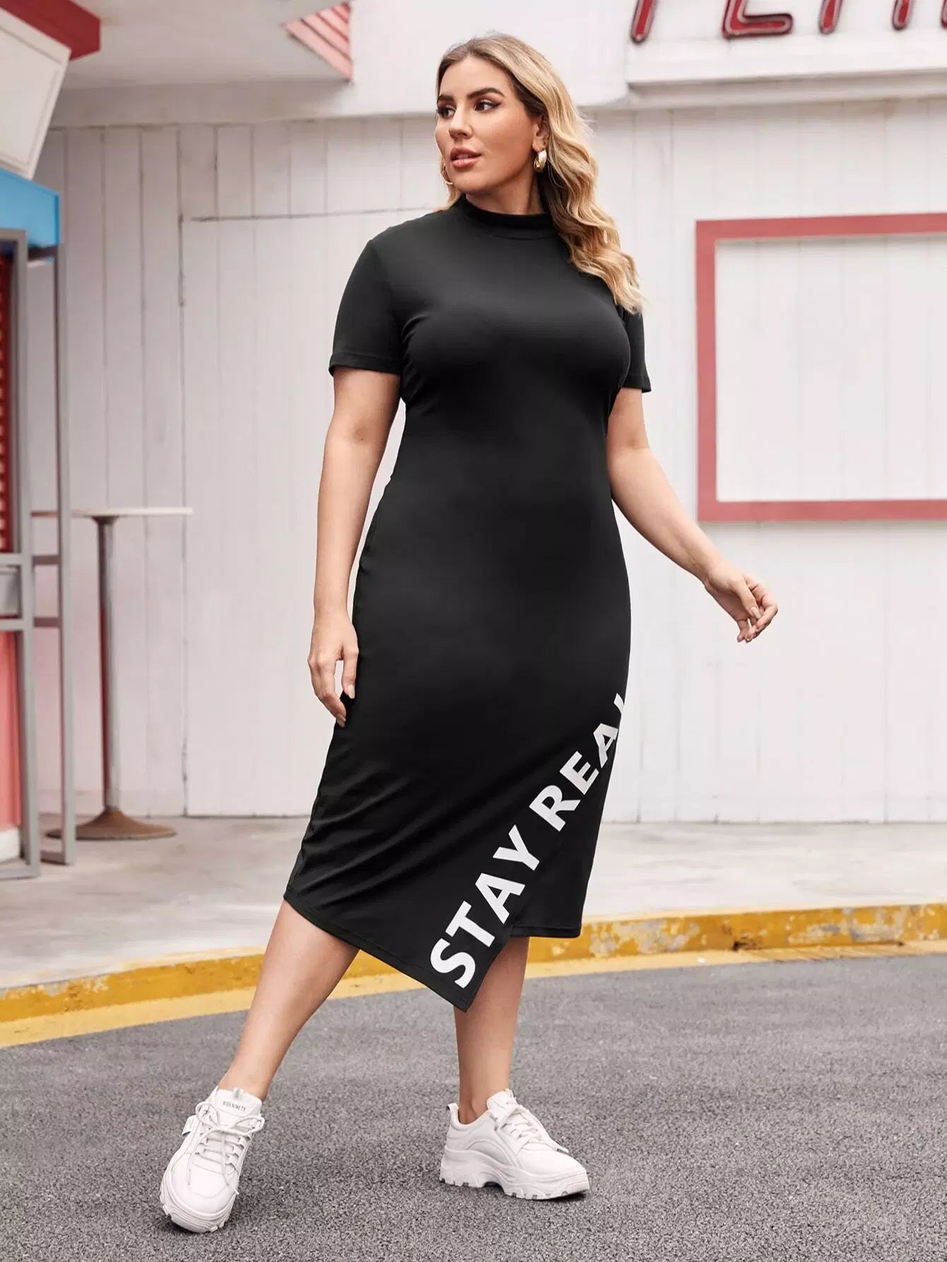 فستان غير متماثل بحافة غير متناسقة برقبة زائد ورسومات على شكل حرف زائد