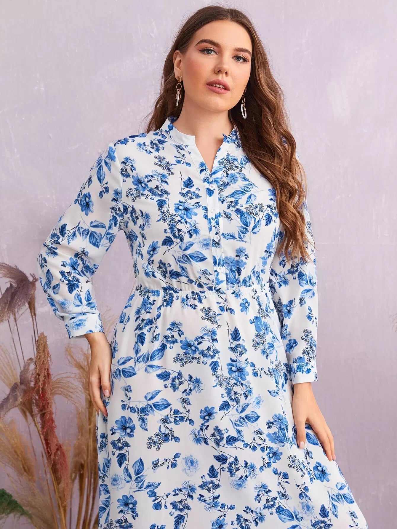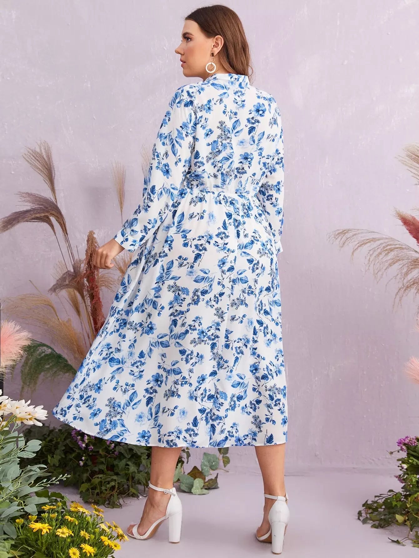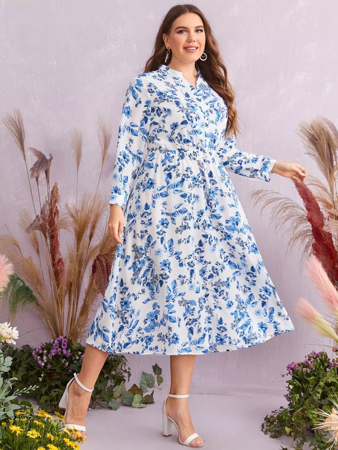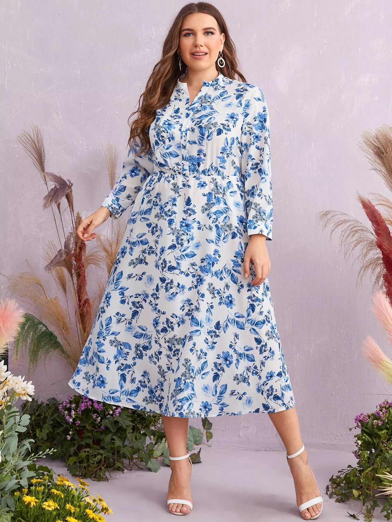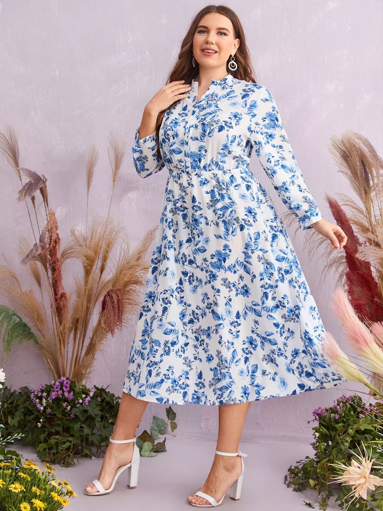 فستان برقبة زائد برقبة زهرية مطبوع عليها زهور