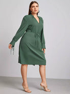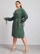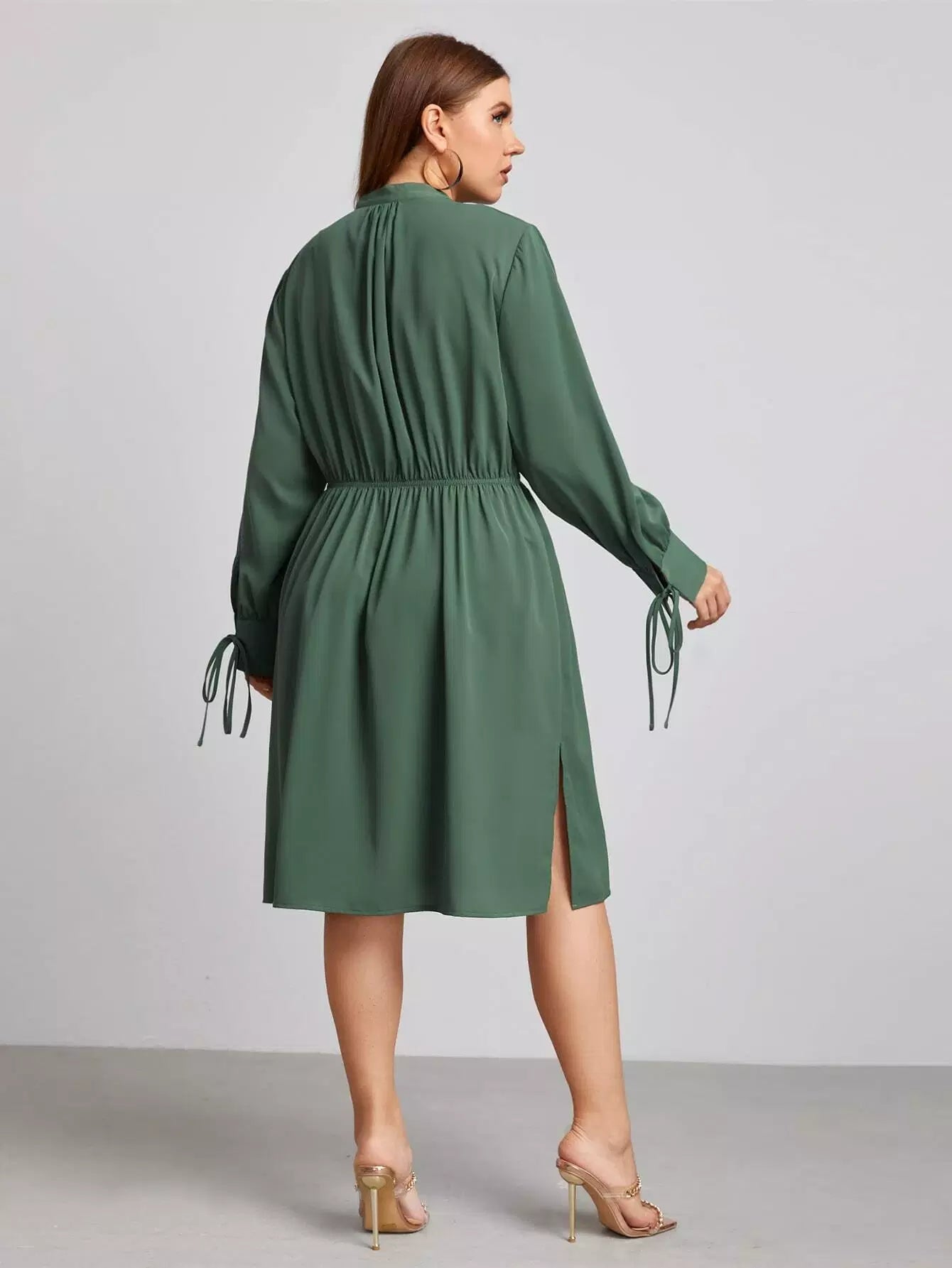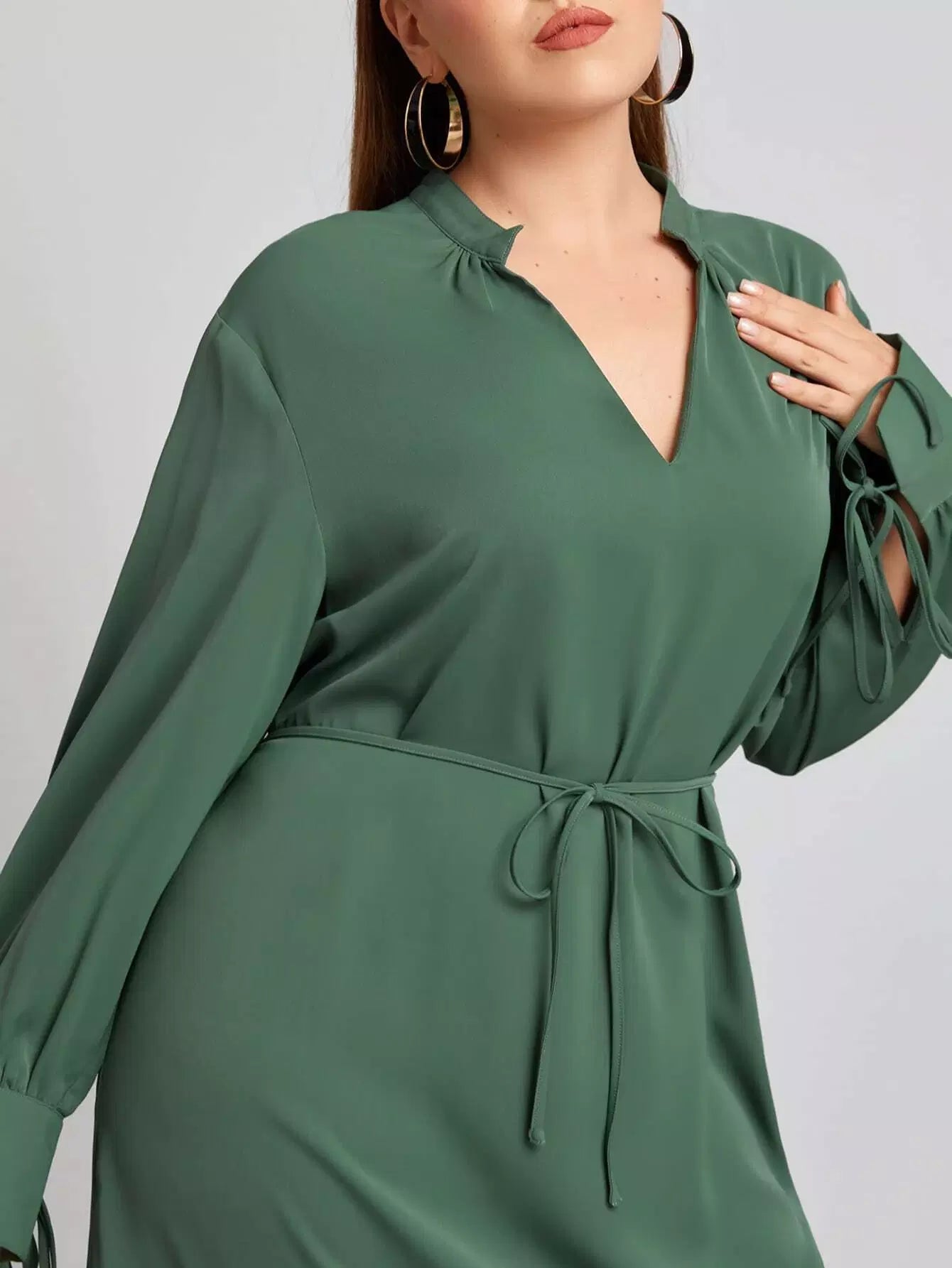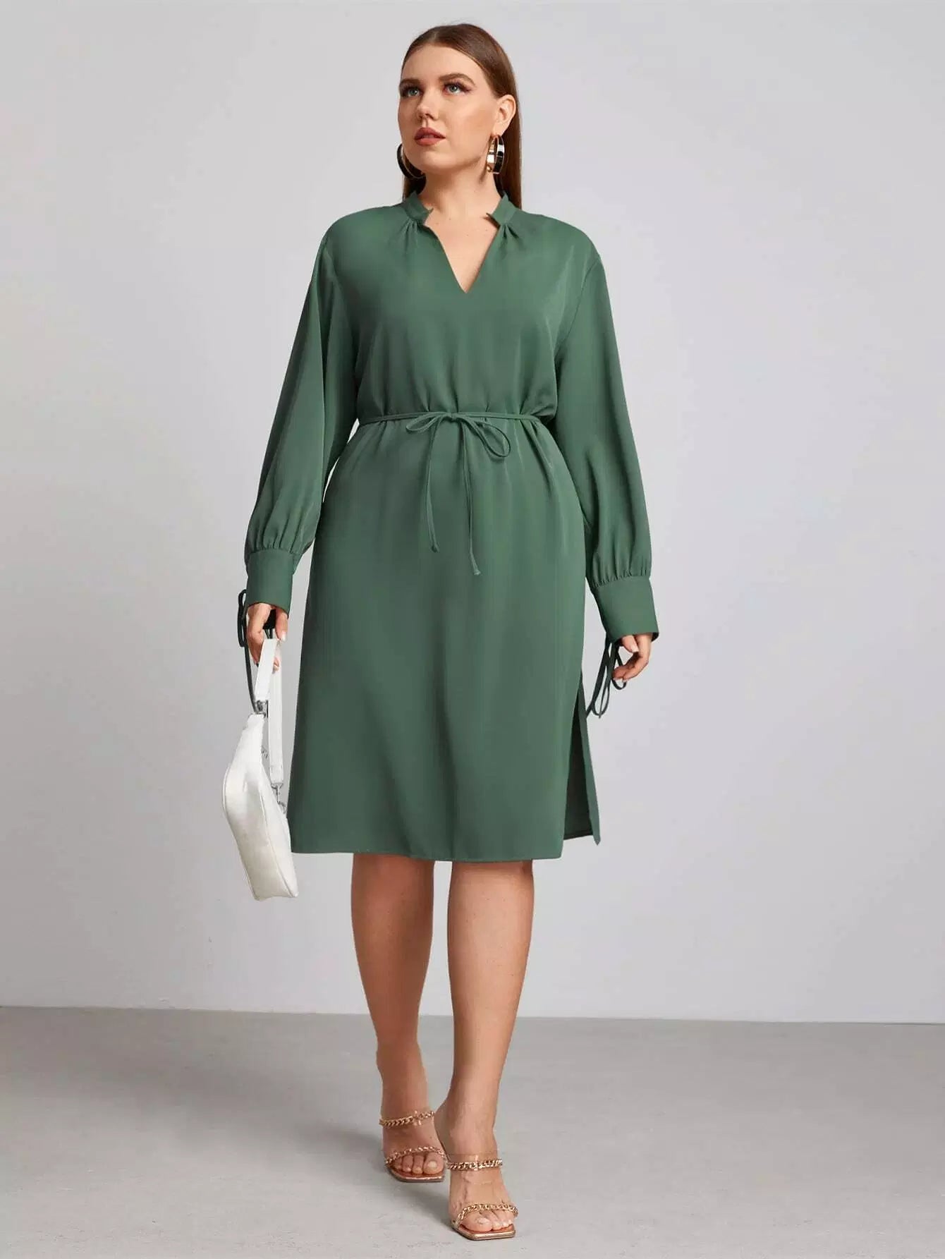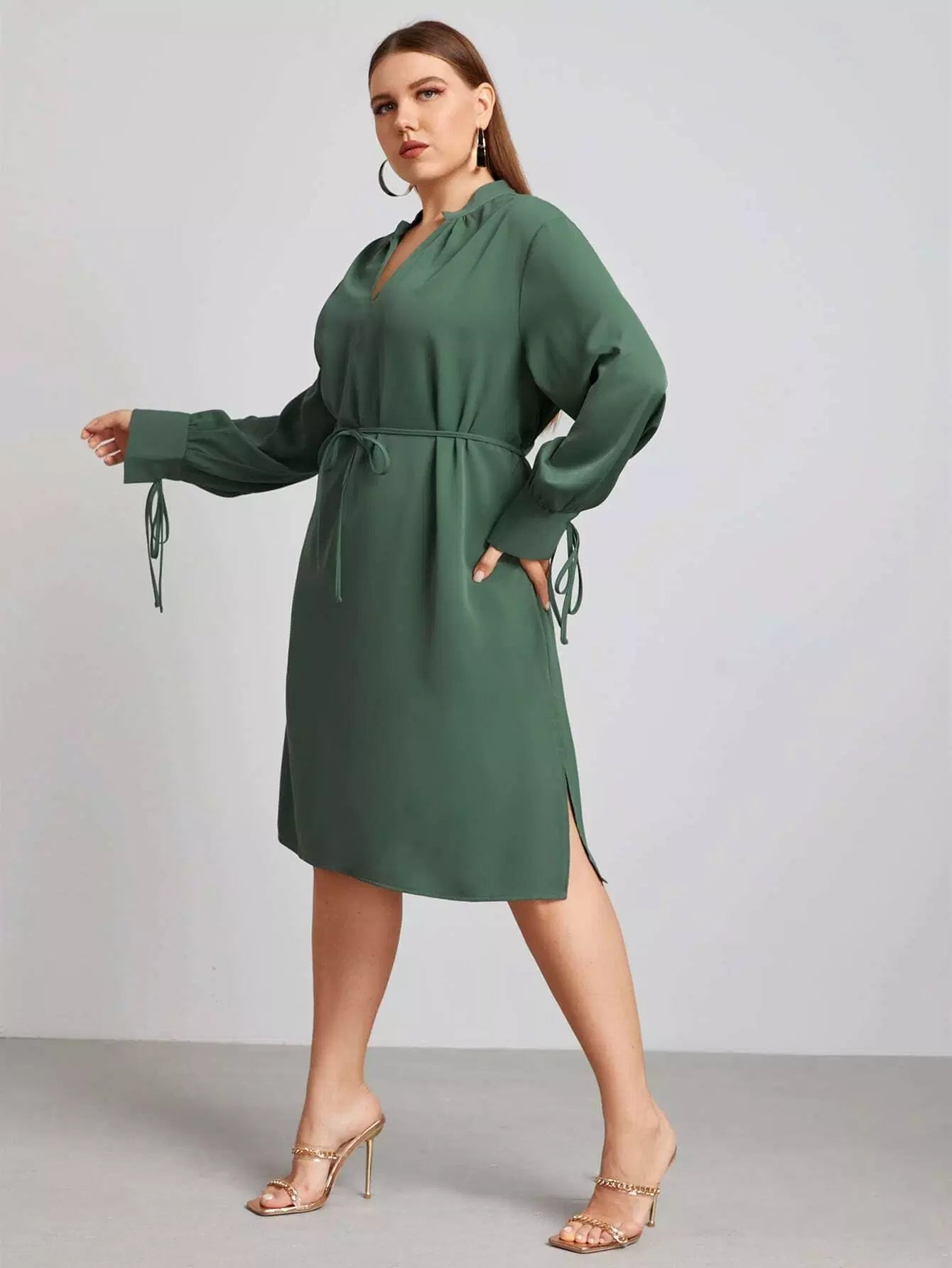 بالإضافة إلى فستان تونيك بياقة مدببة وحاشية مقسمة بدون حزام