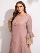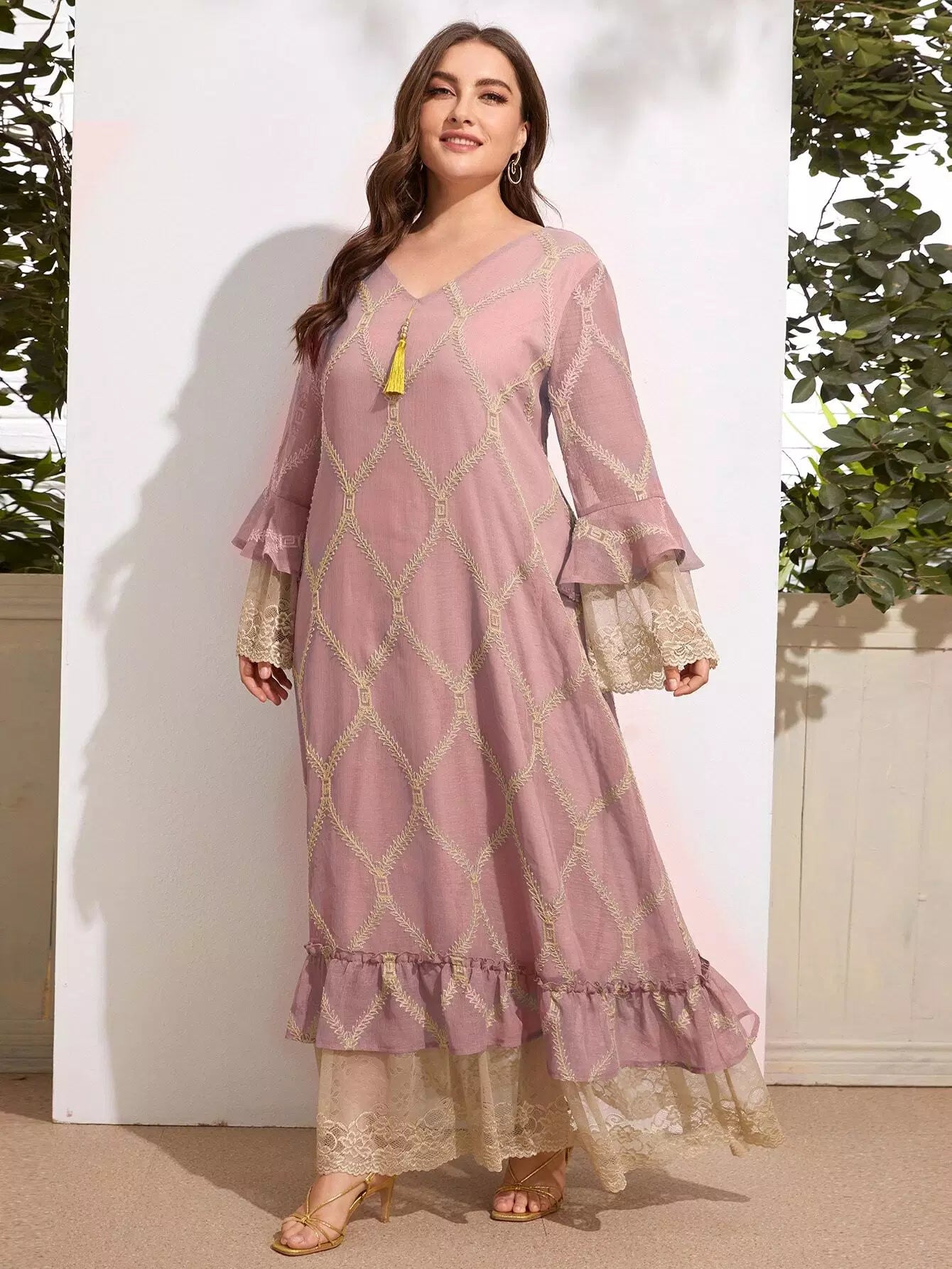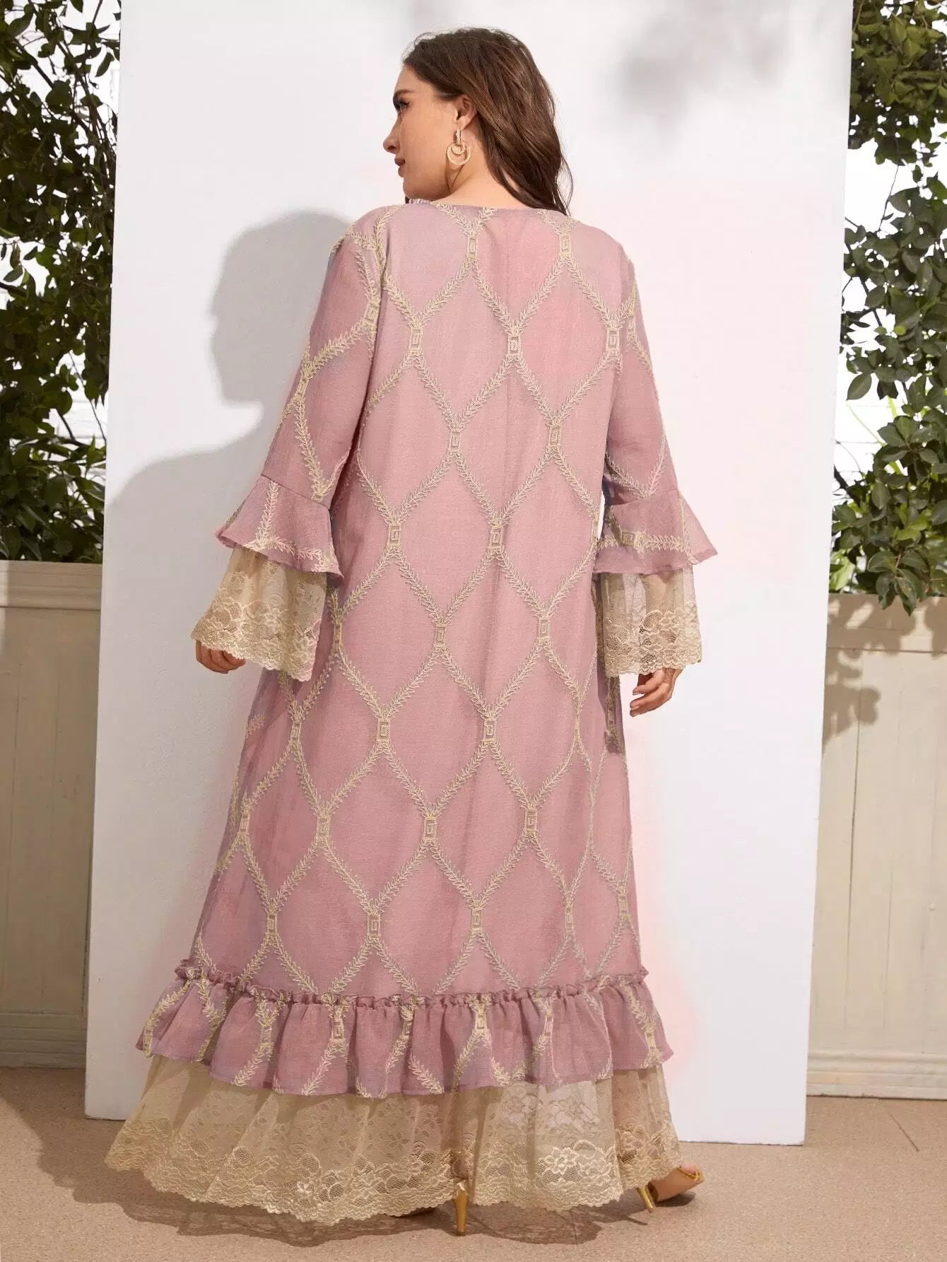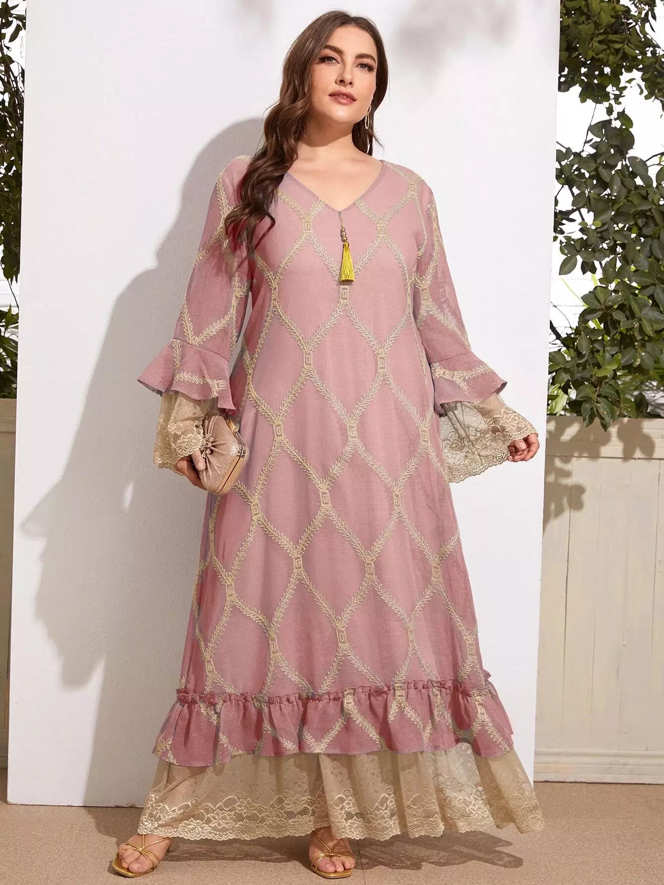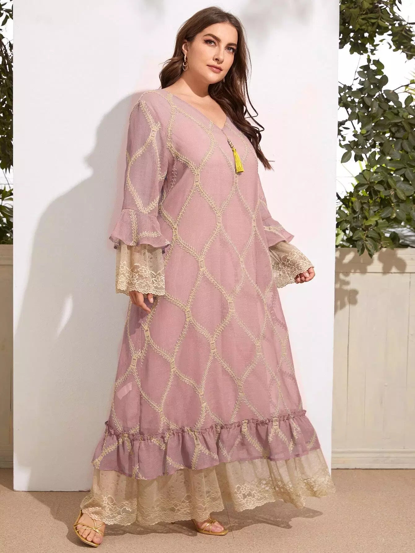 فستان بأكمام من الدانتيل المطرز بتطريز بلون مغاير وأكمام دانتيل بلون مغاير