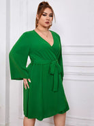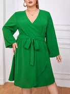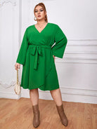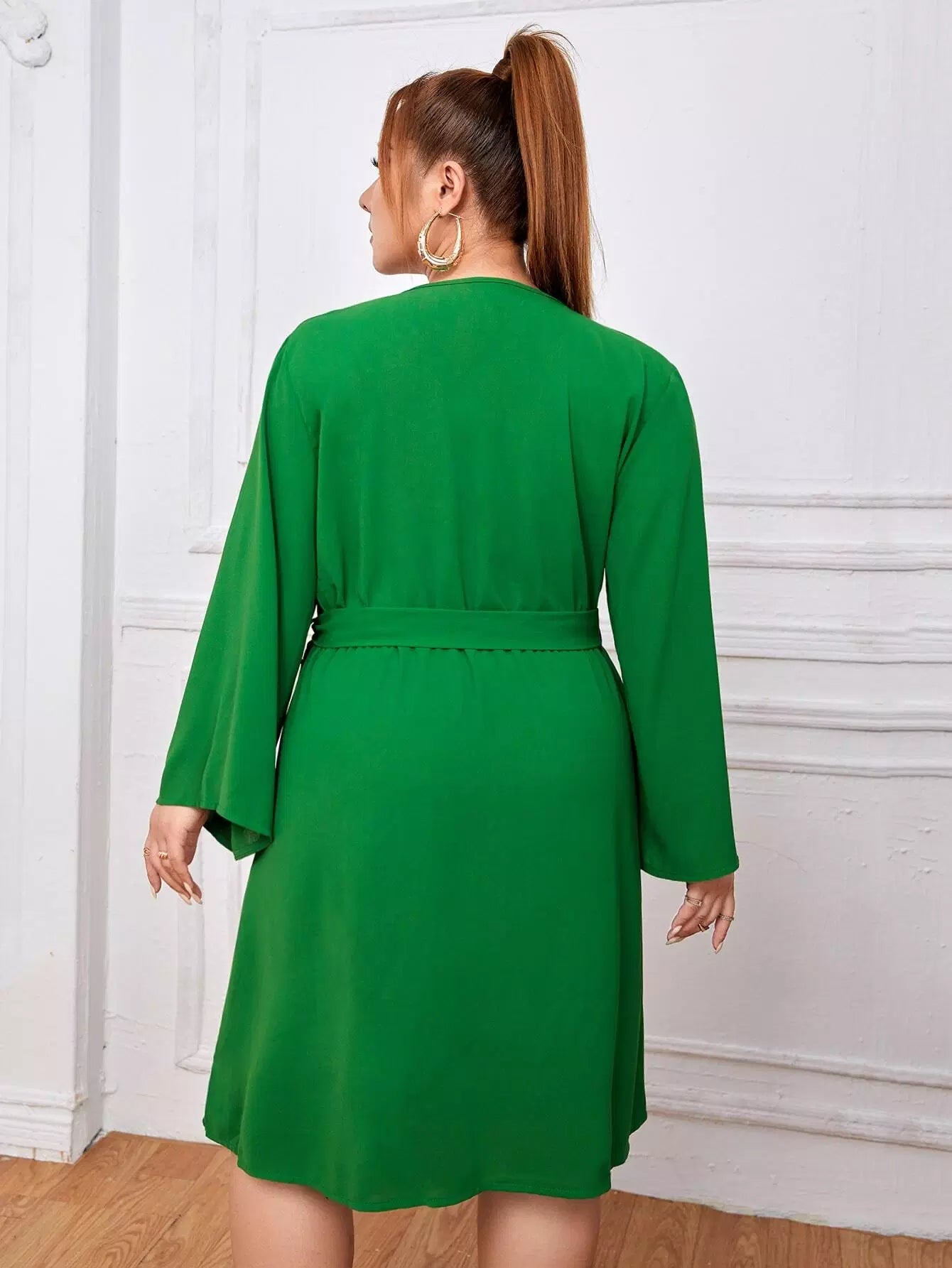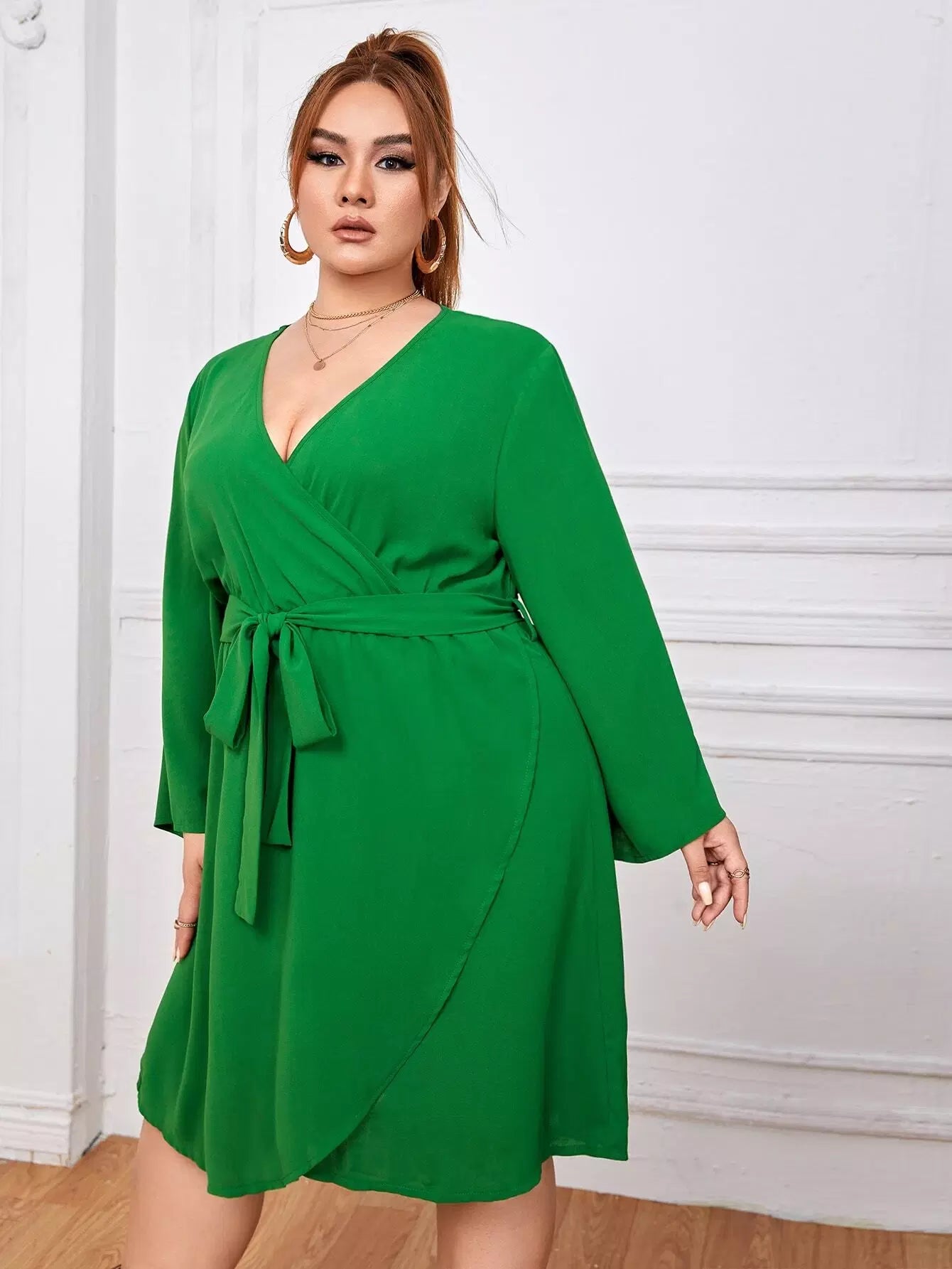 بالإضافة إلى فستان ملفوف برقبة عميقة بدون حزام