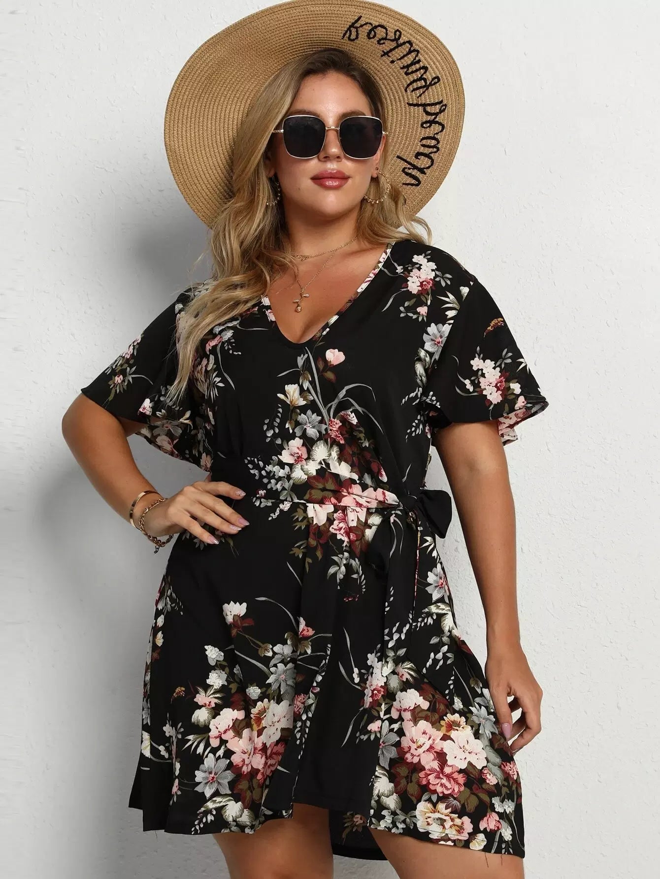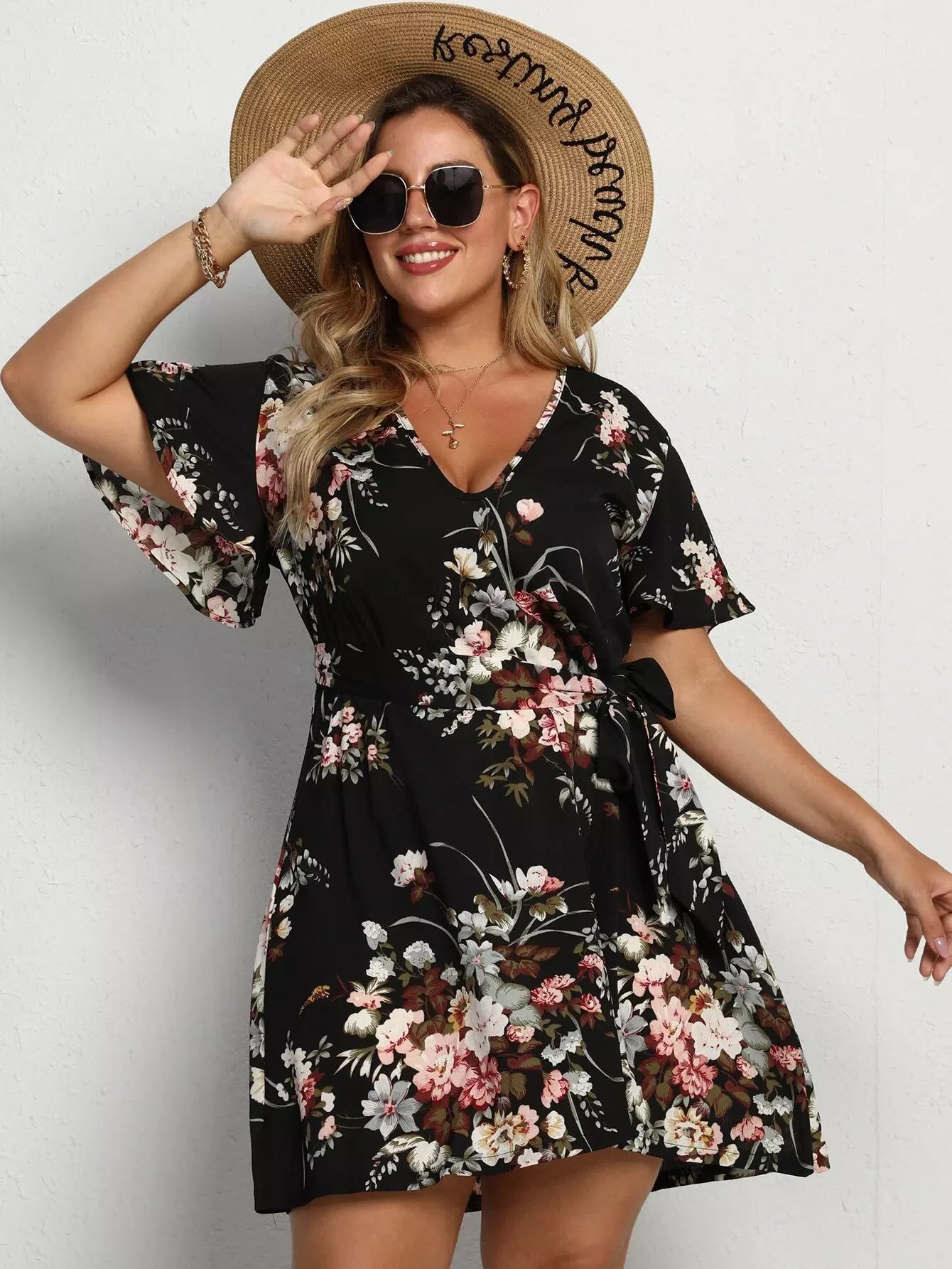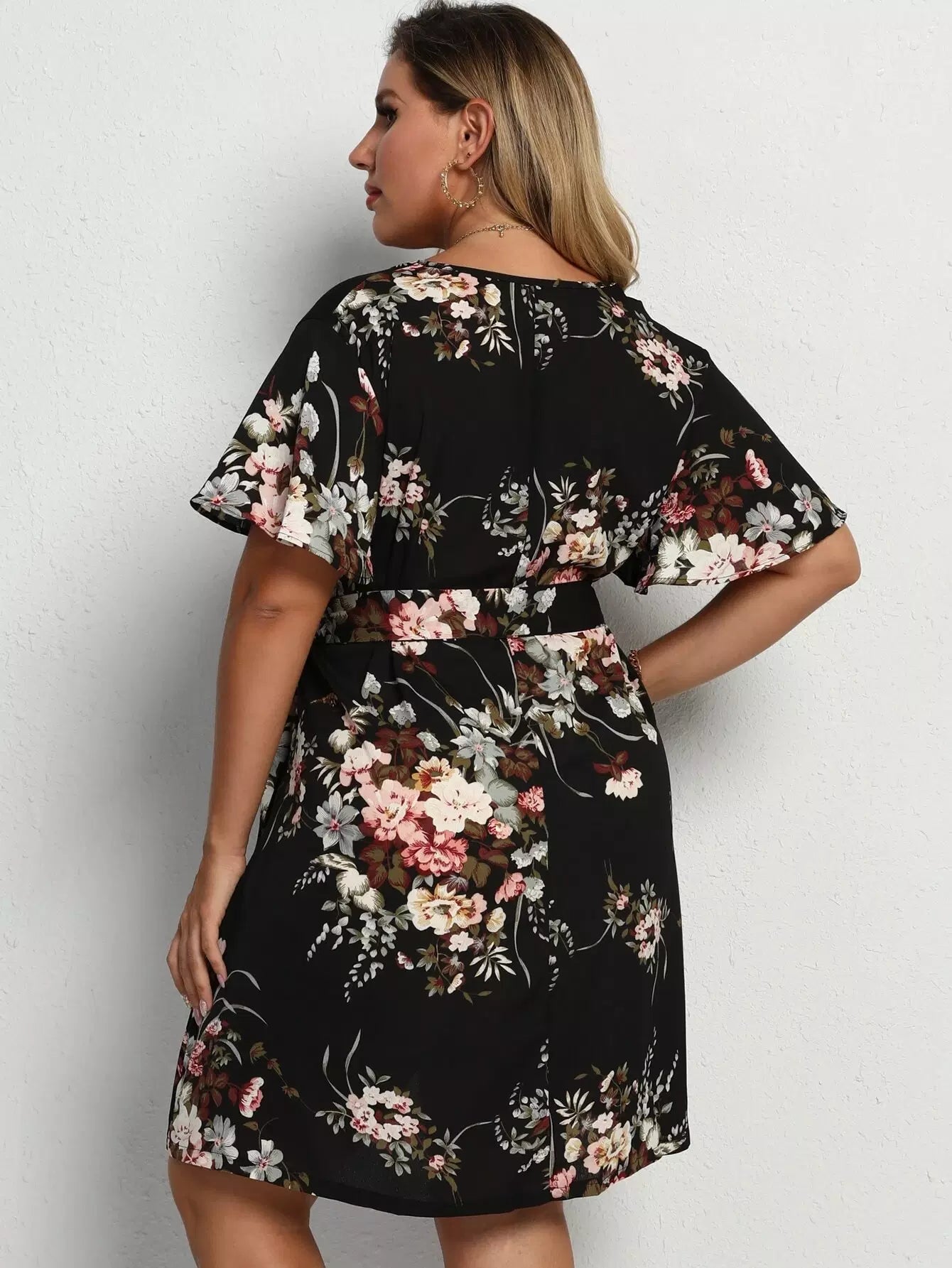 نحيف - مقاس كبير فستان بحزام مزين بالزهور وياقة عميقة