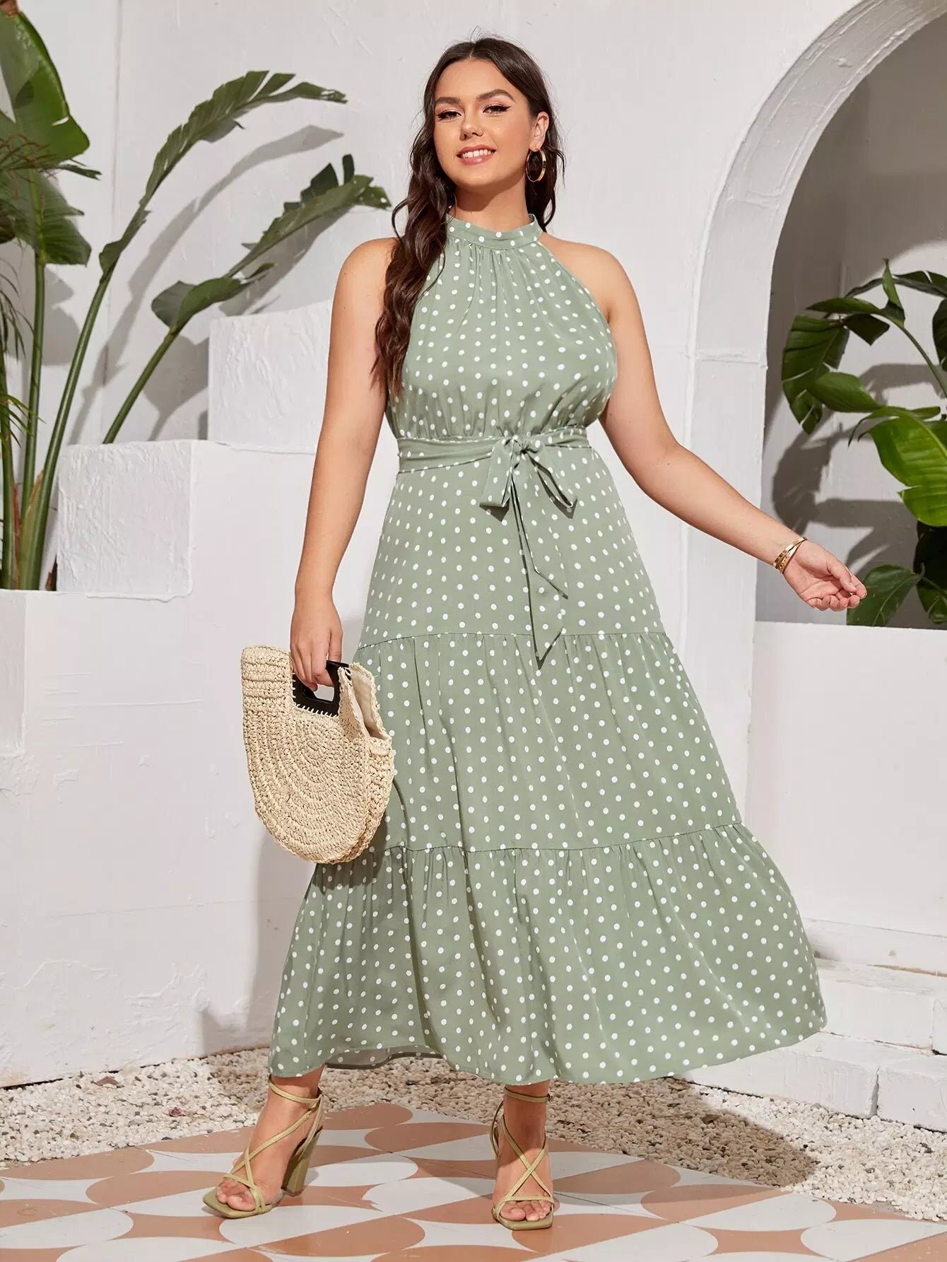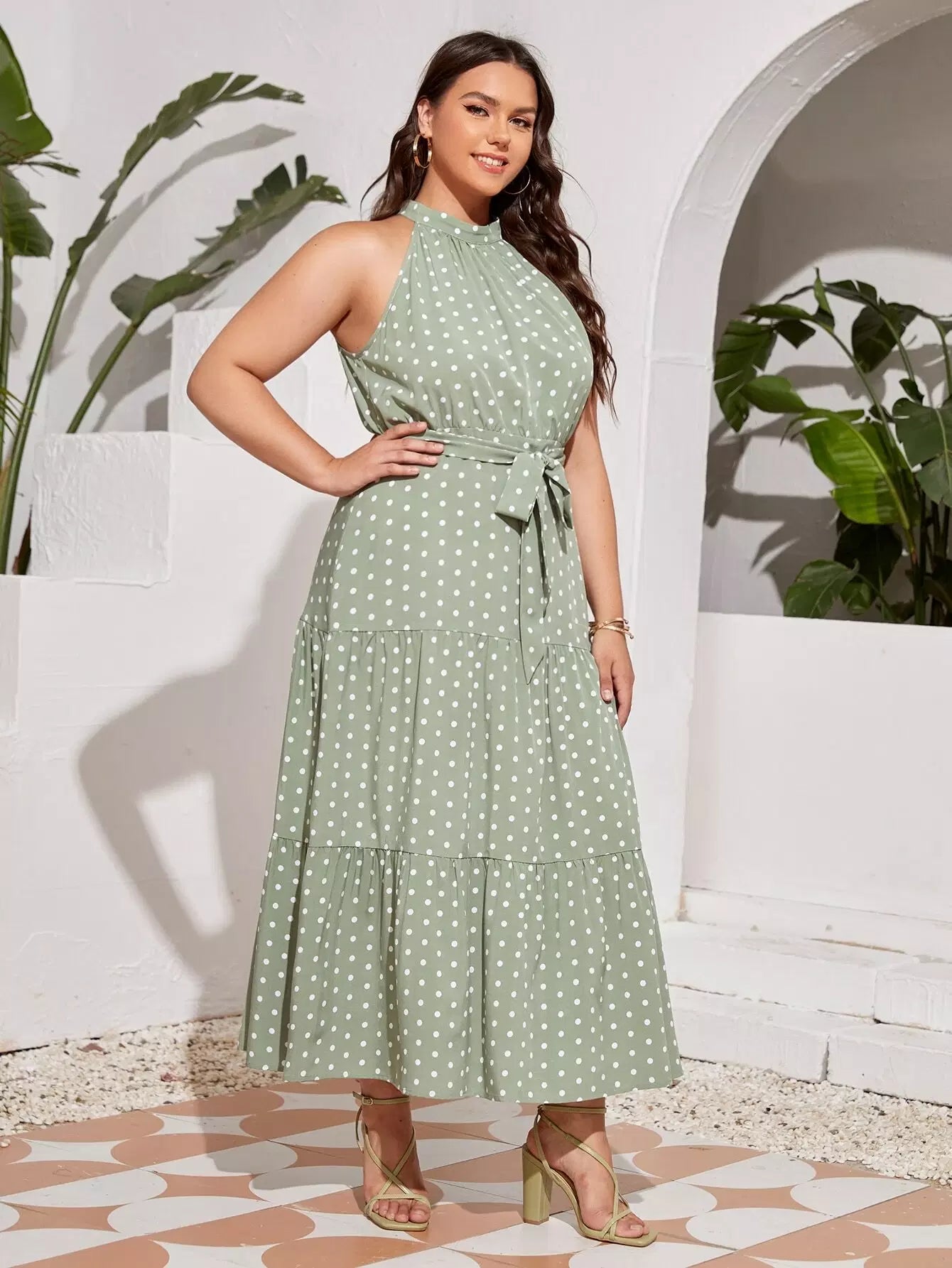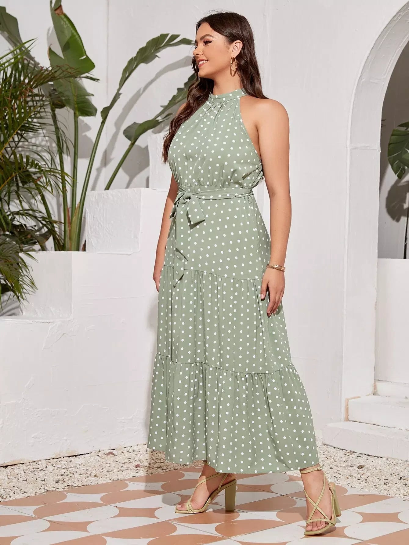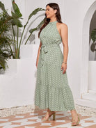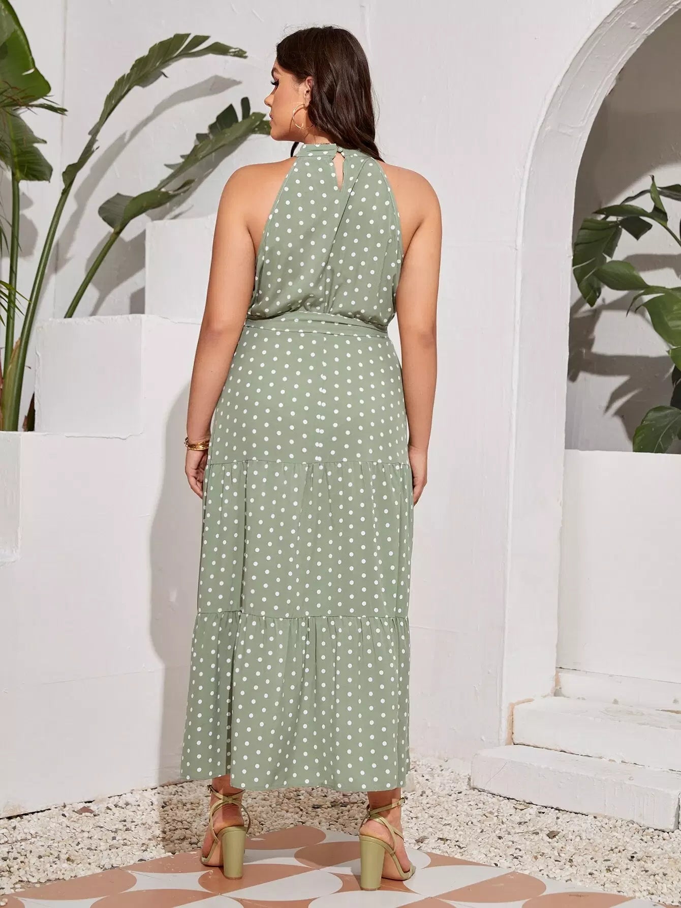 فستان منقط بفتحة رقبة على شكل هالتر بدون حزام