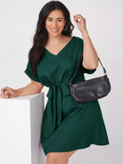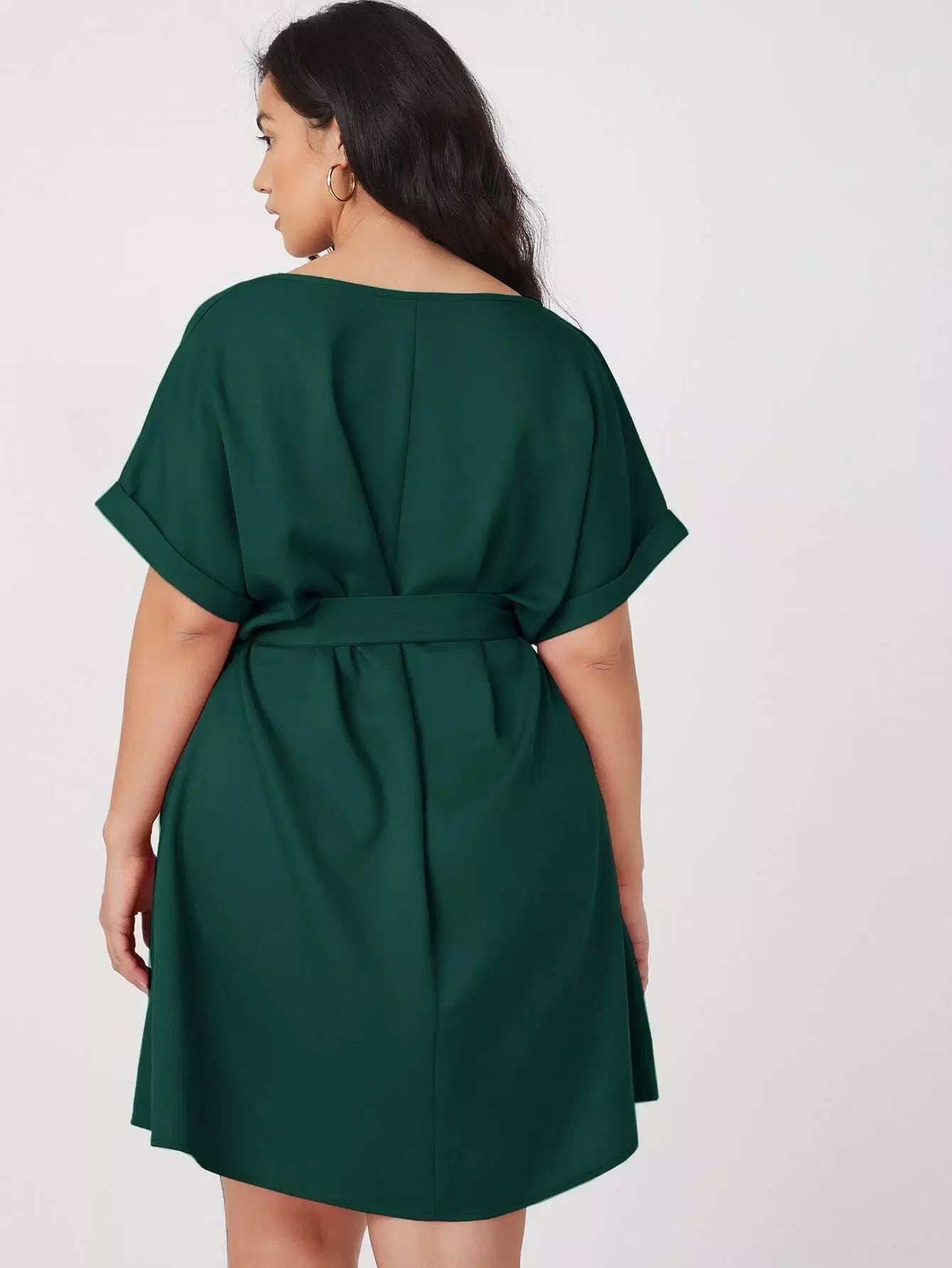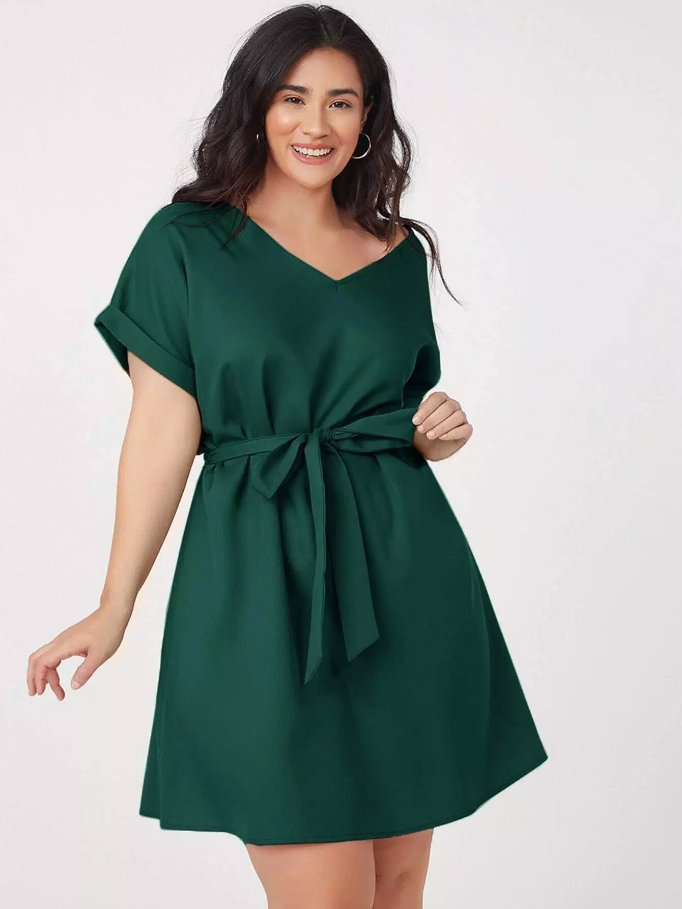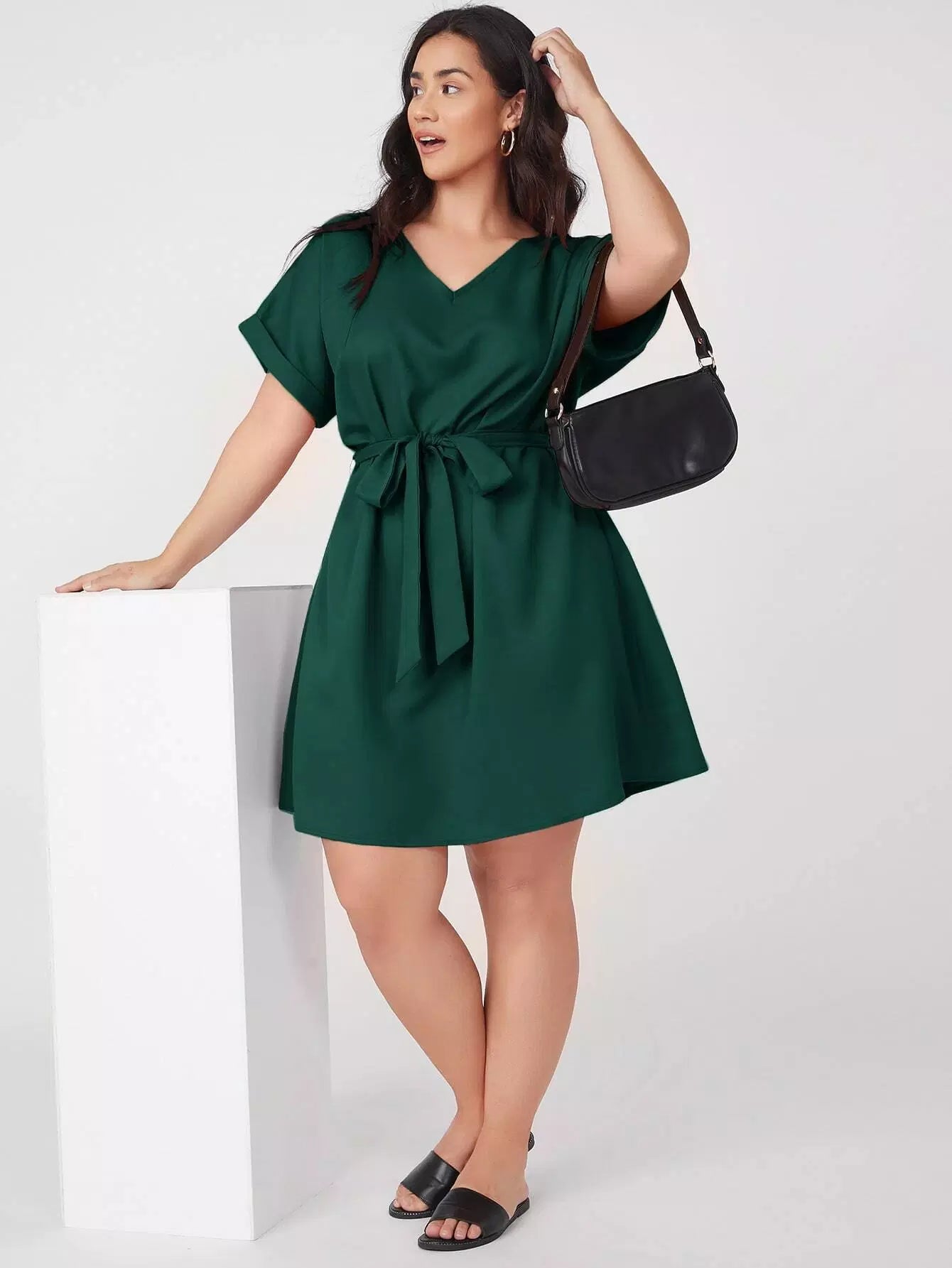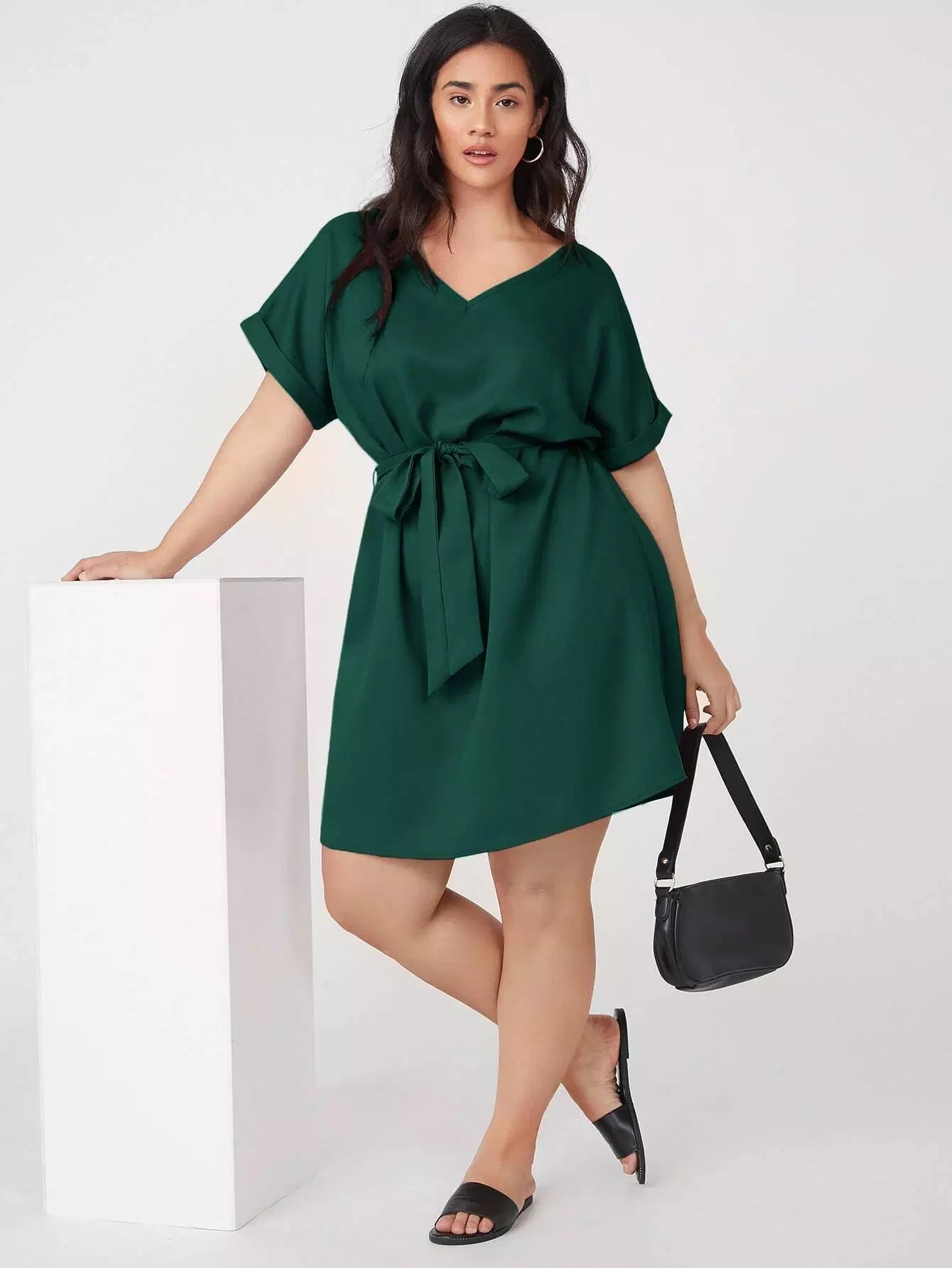 بالإضافة إلى فستان سادة بأكمام قابلة للطي بدون حزام