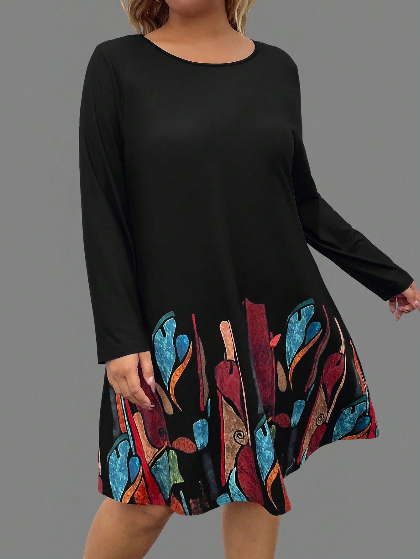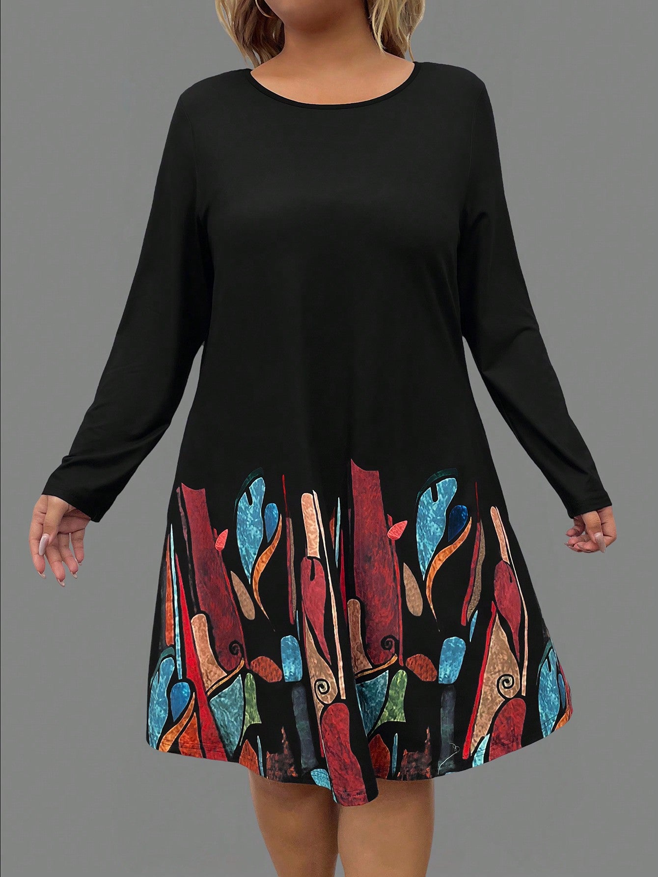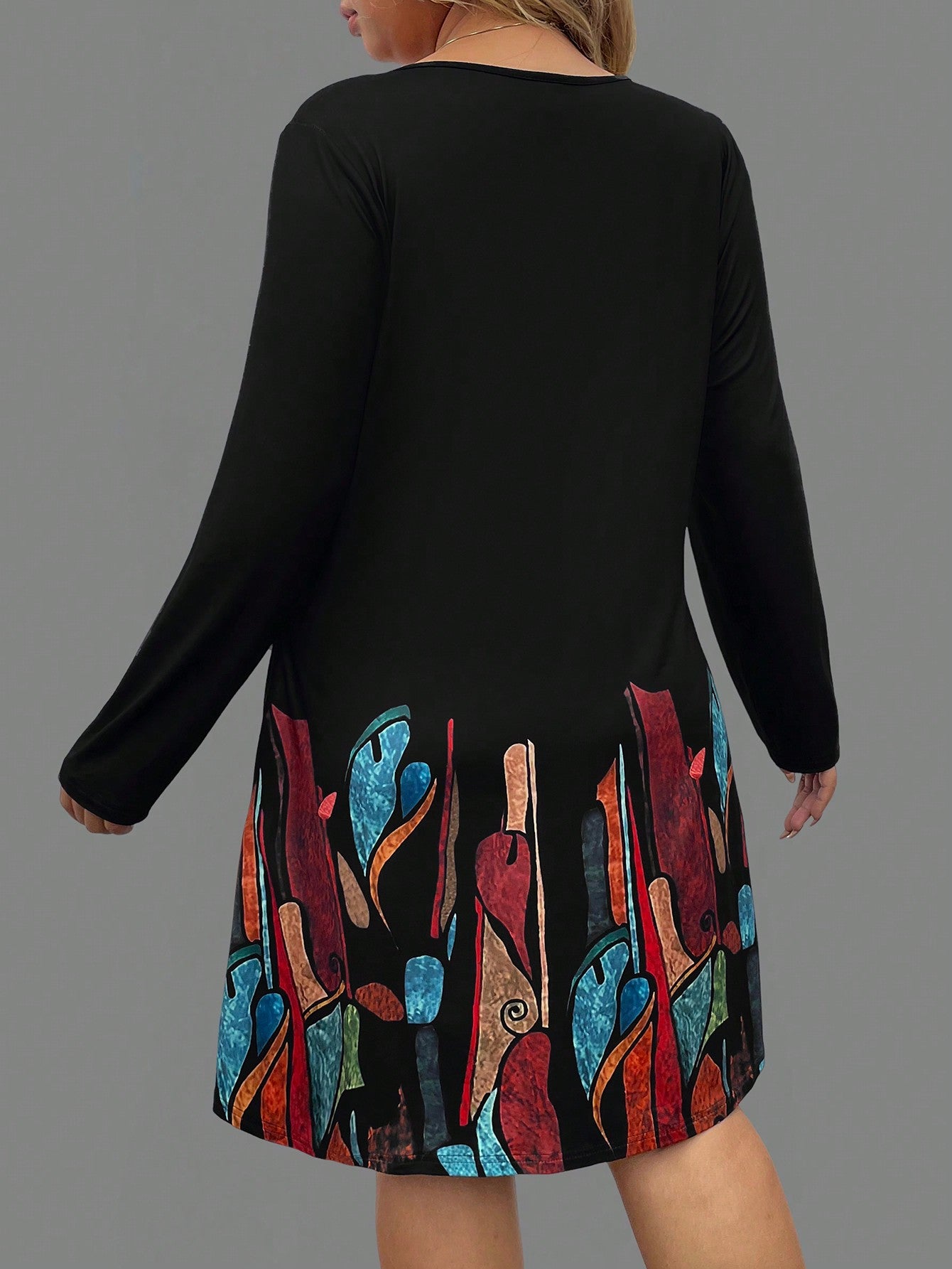 Plus Size Digital Placement Print Knit Long Sleeve Casual Dress