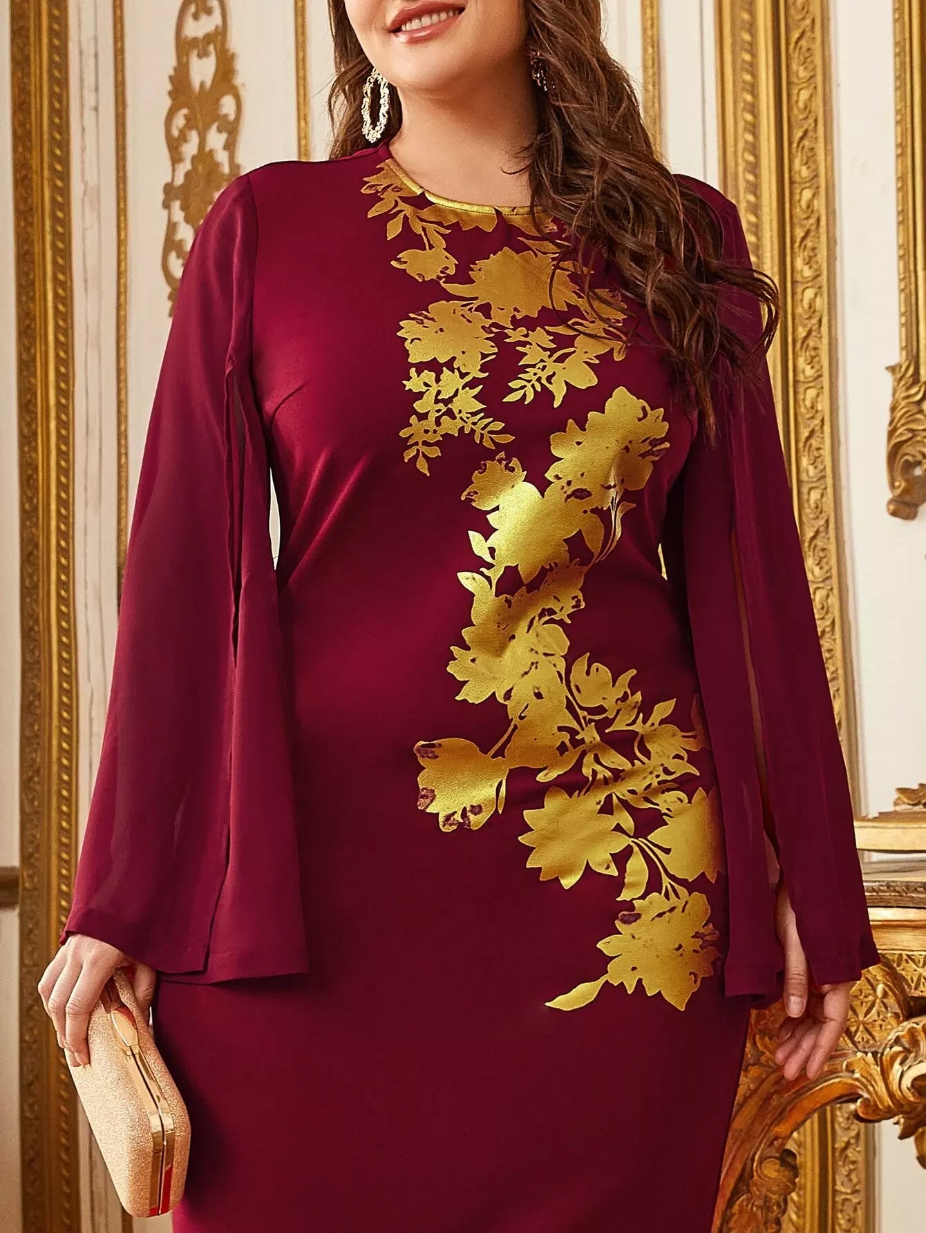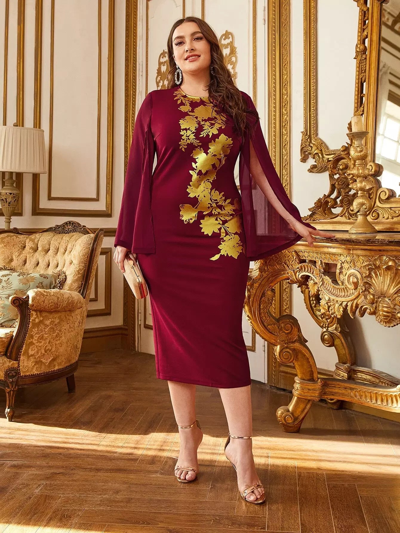 فستان بأكمام مشقوقة زائد، مطبوع عليه زهور ذهبي