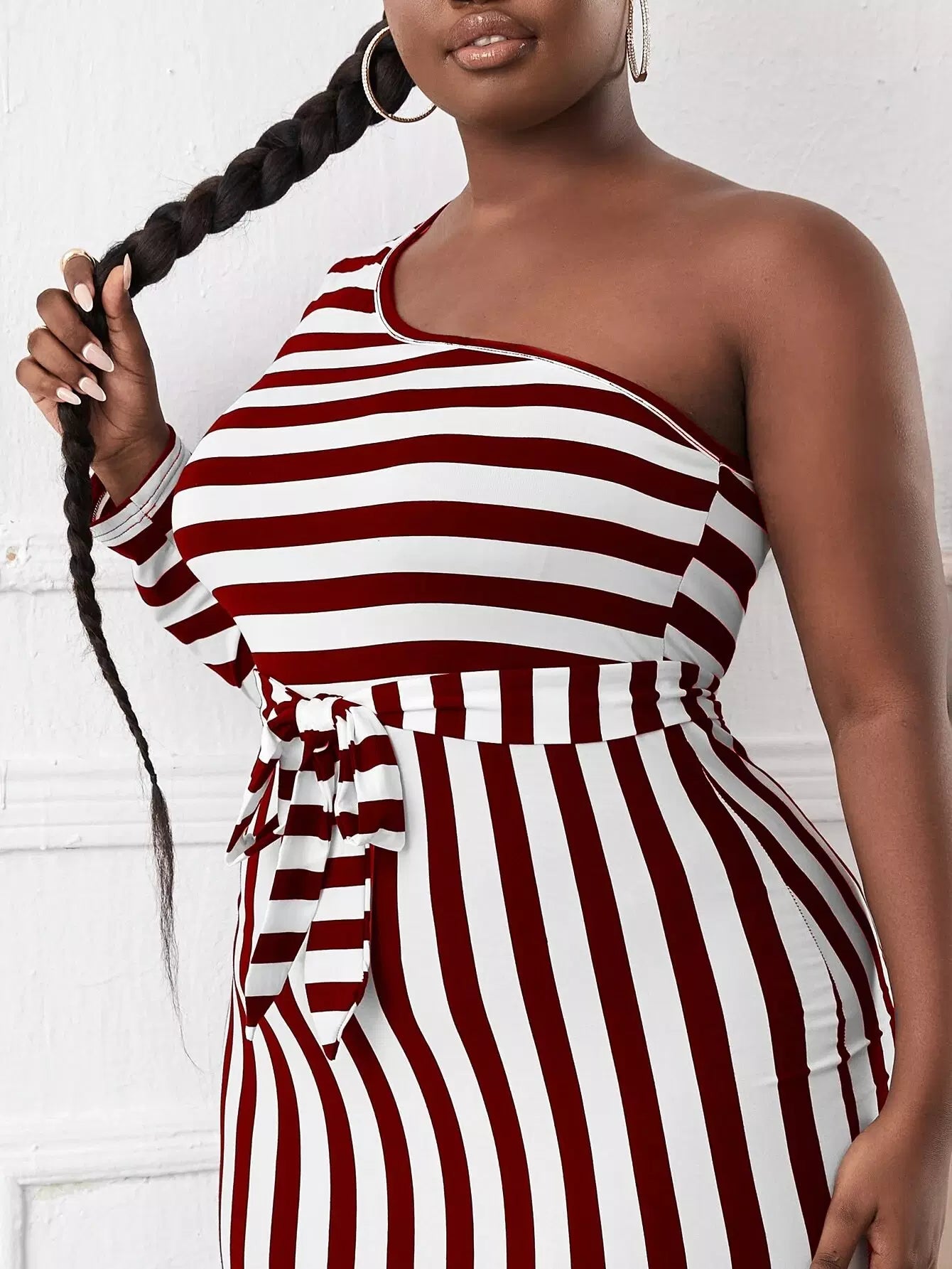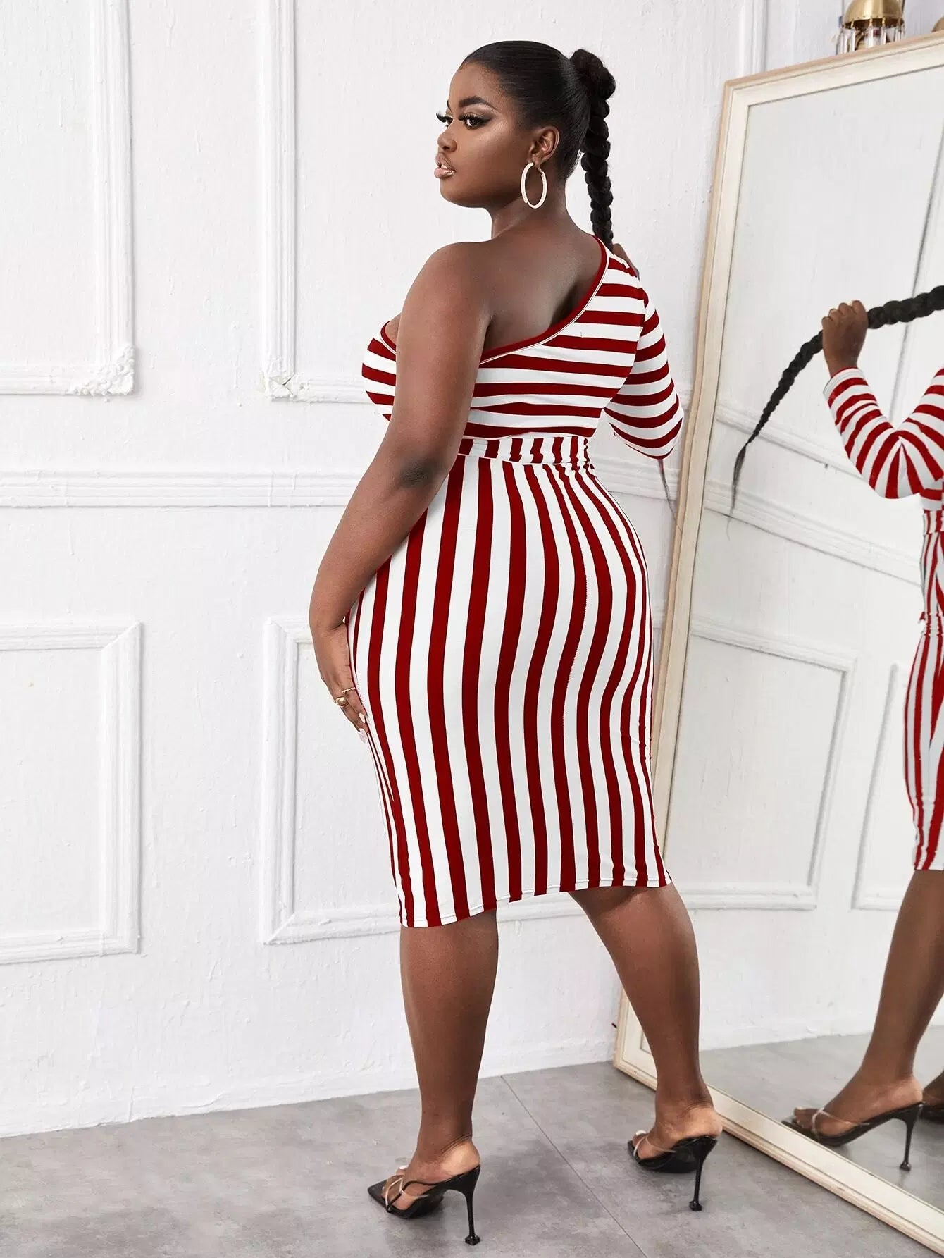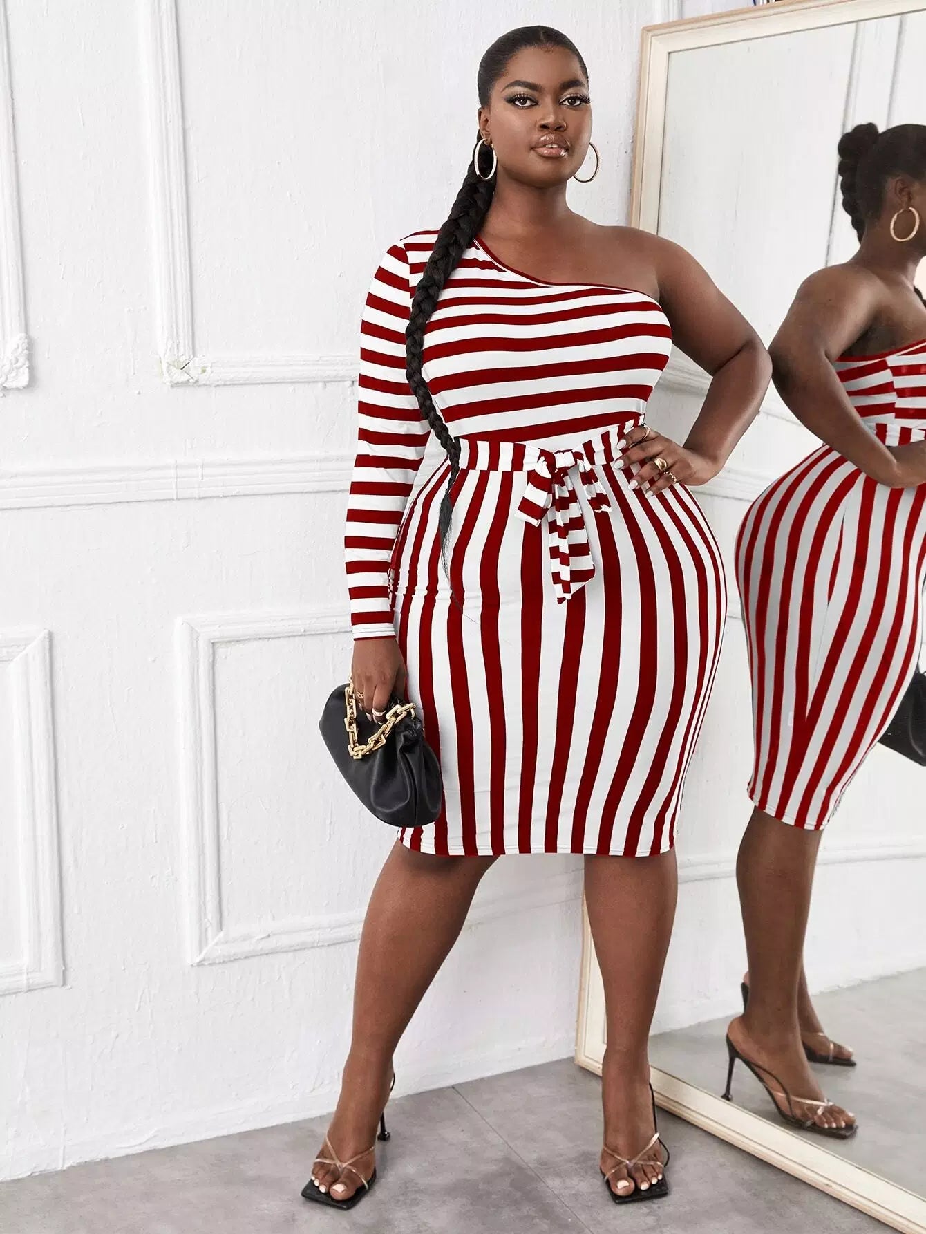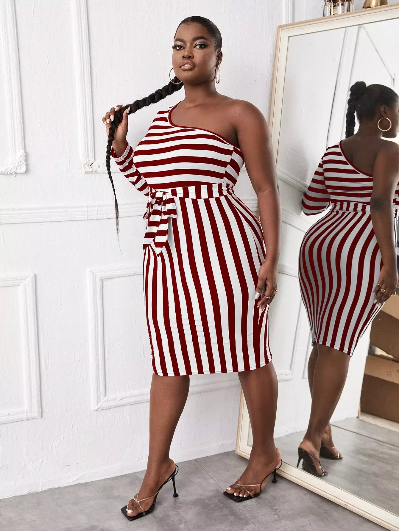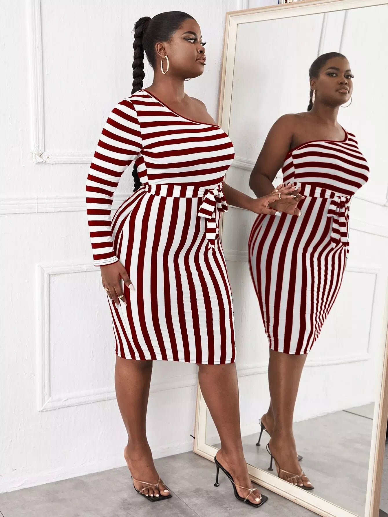 بالإضافة إلى فستان مخطط بكتف واحد بدون حزام