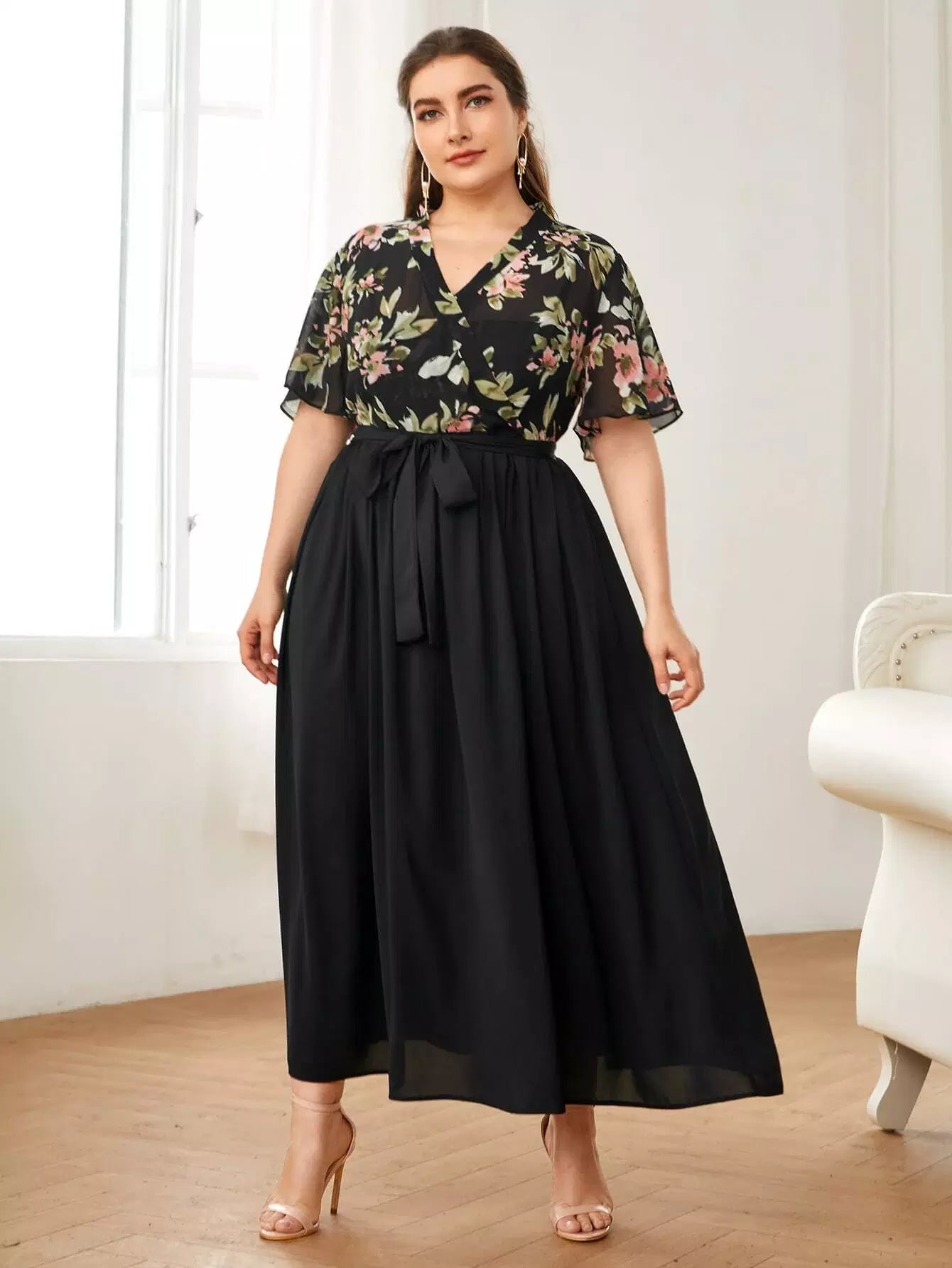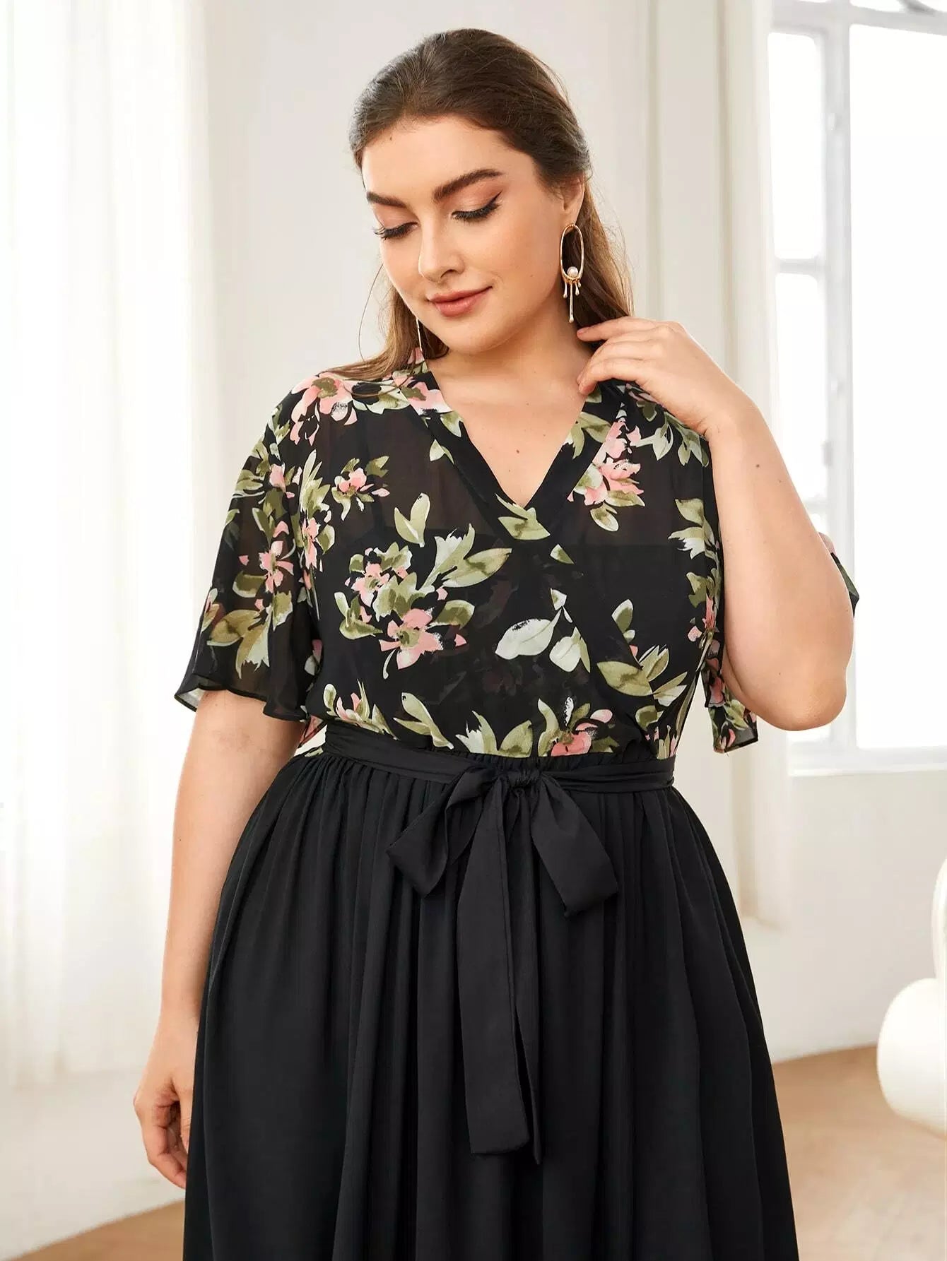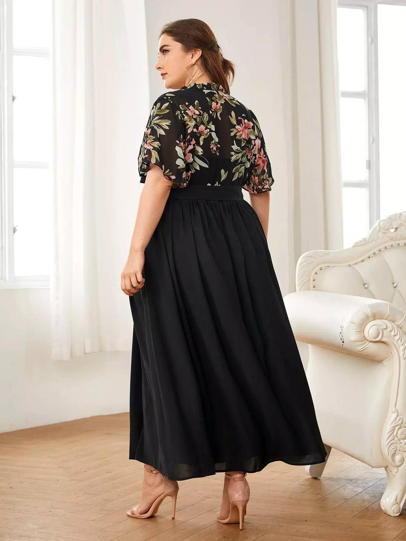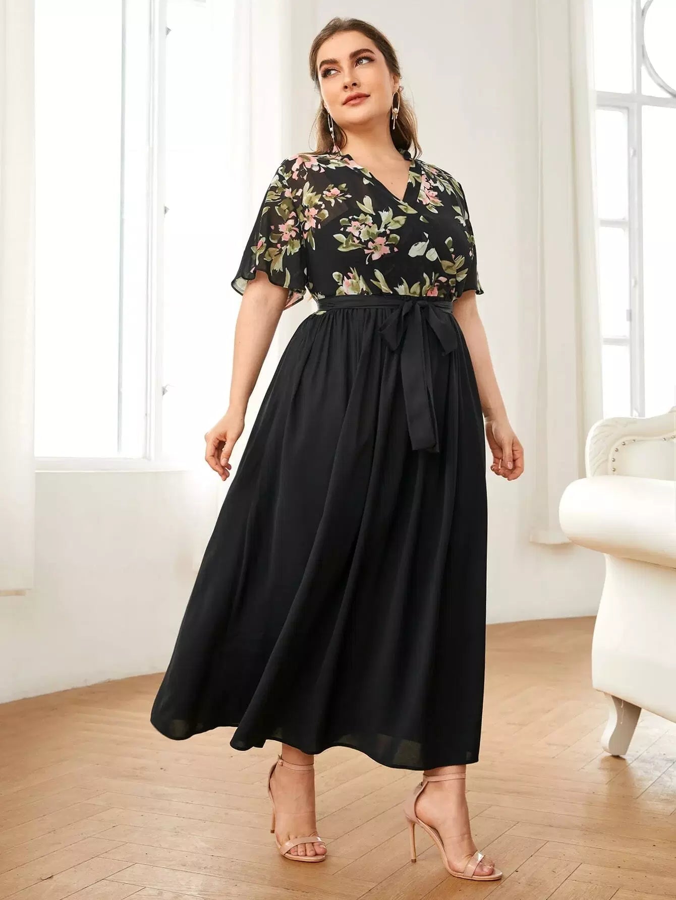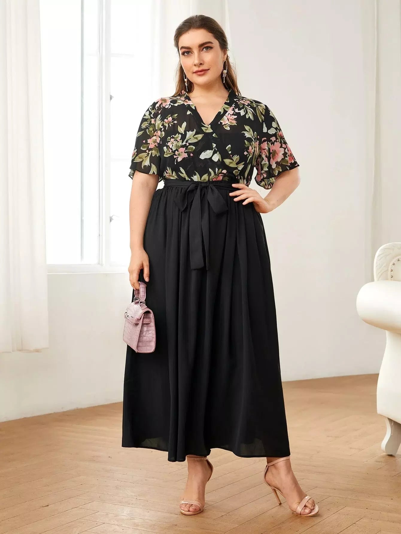 فستان برقبة زائد برقبة زهرية مطبوع عليها ربطة عنق ذاتي