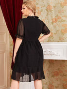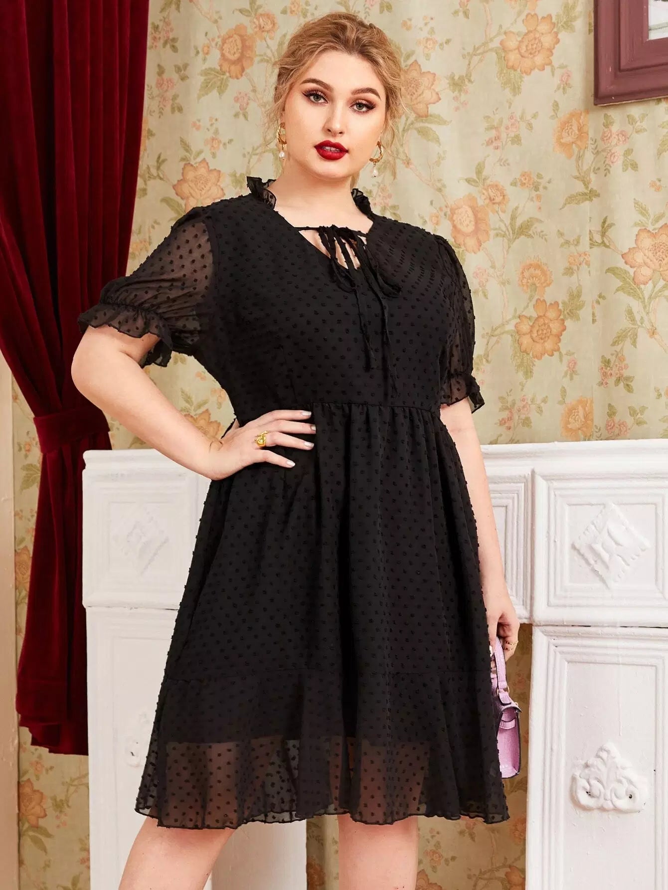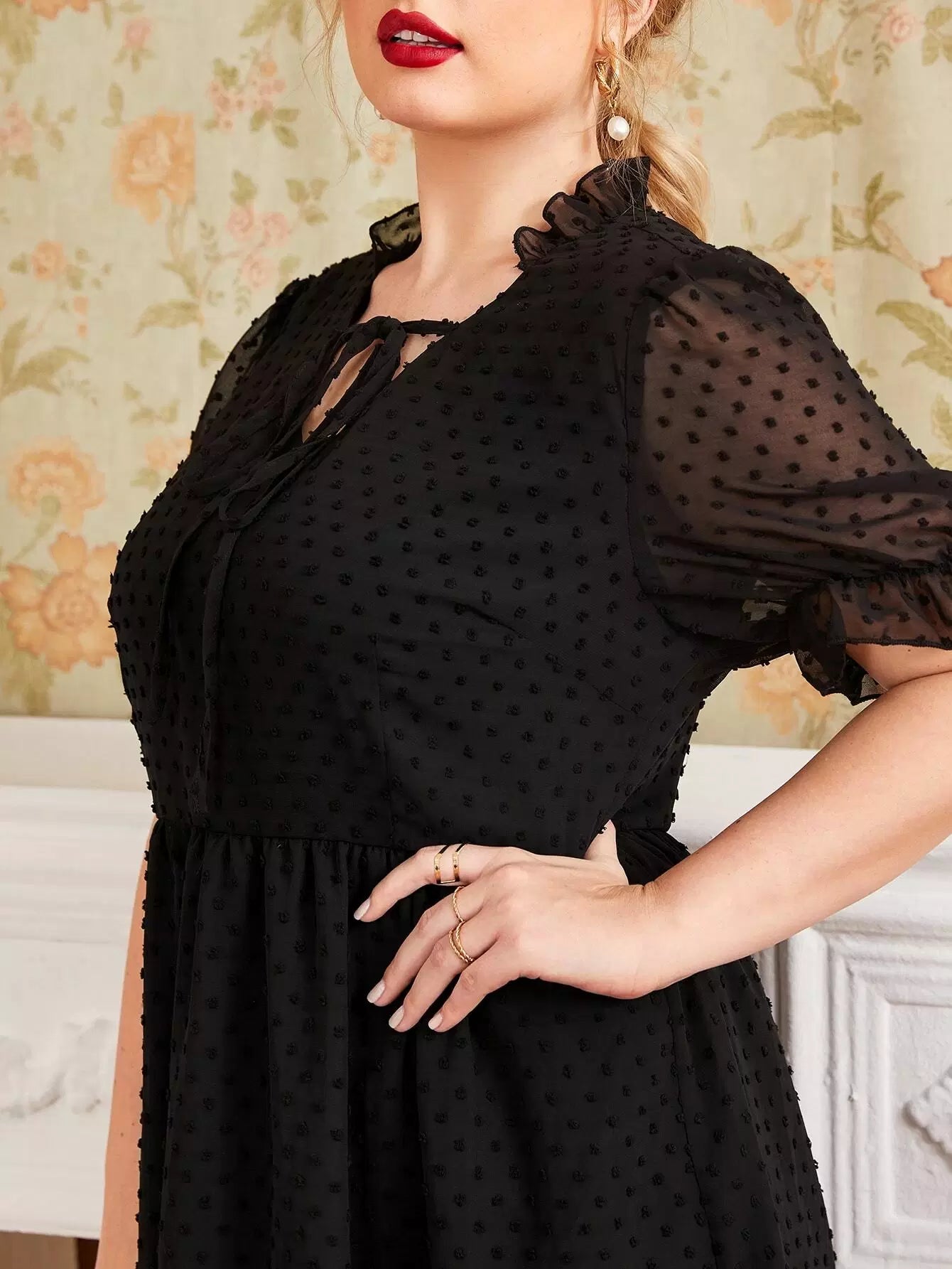فستان شبكي منقّط شبكي سويس بياقة زائد وربطة عنق كشكش