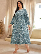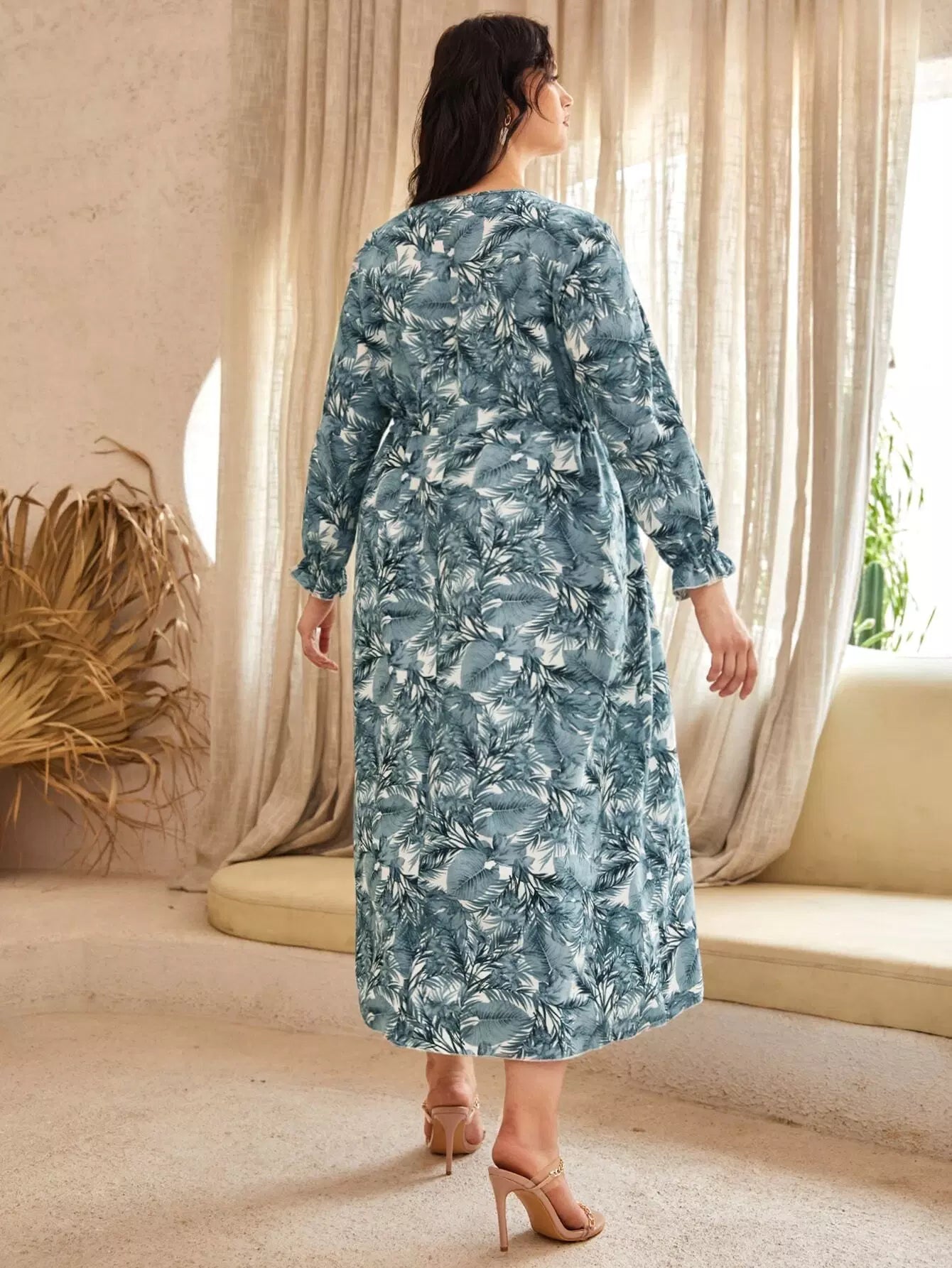 - مقاس كبير فستان بطباعة استوائية وأكمام واسعة وربطة أمامية