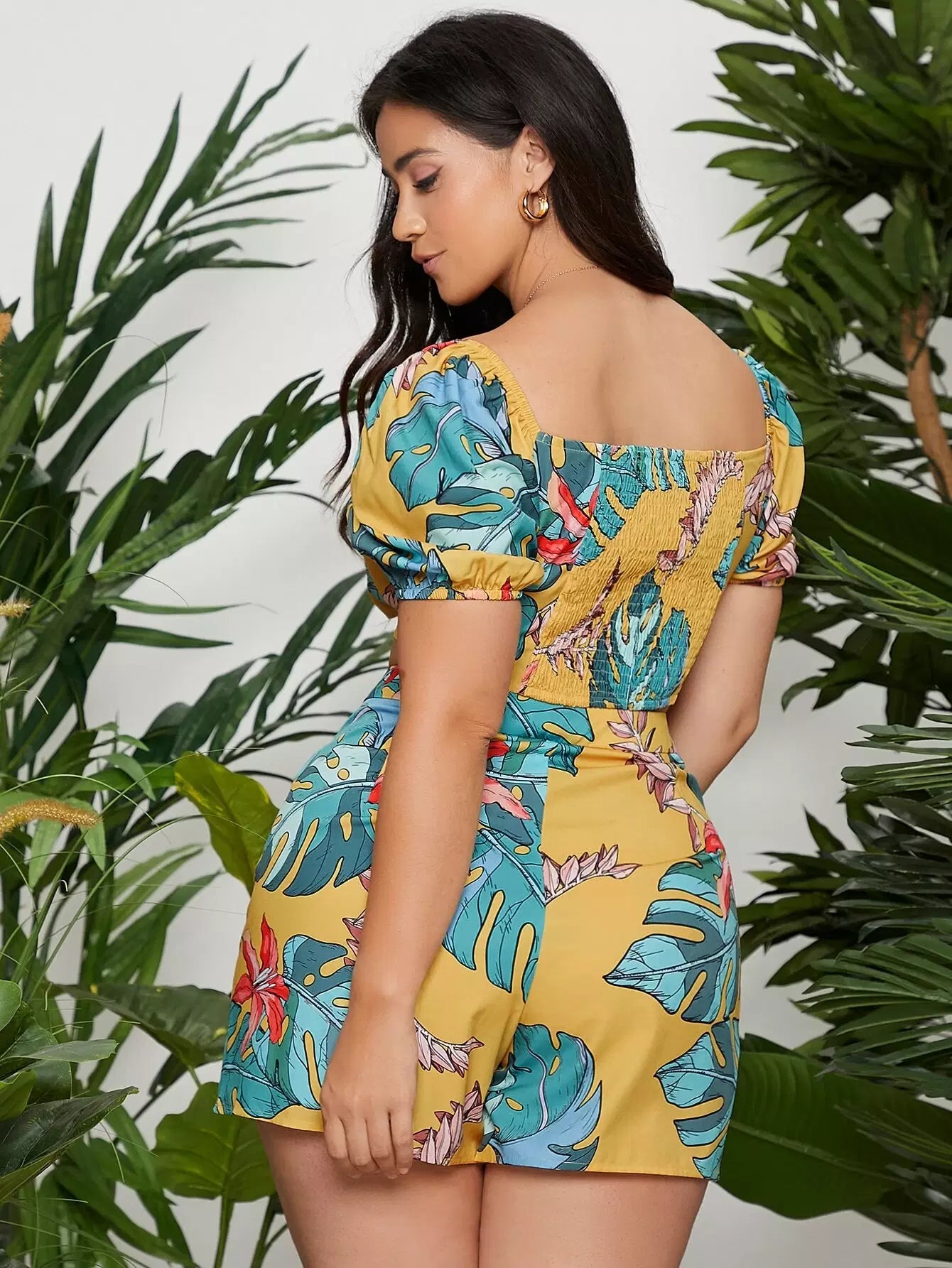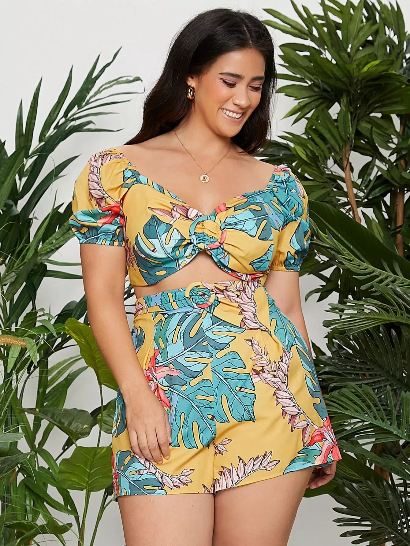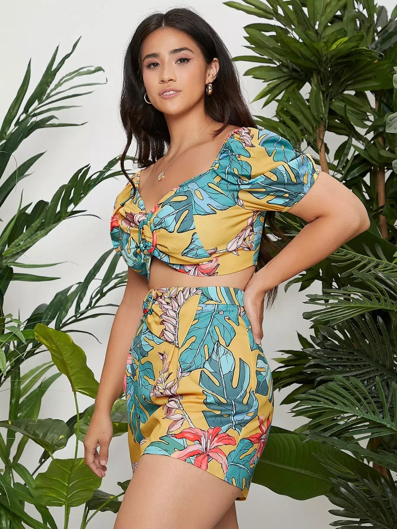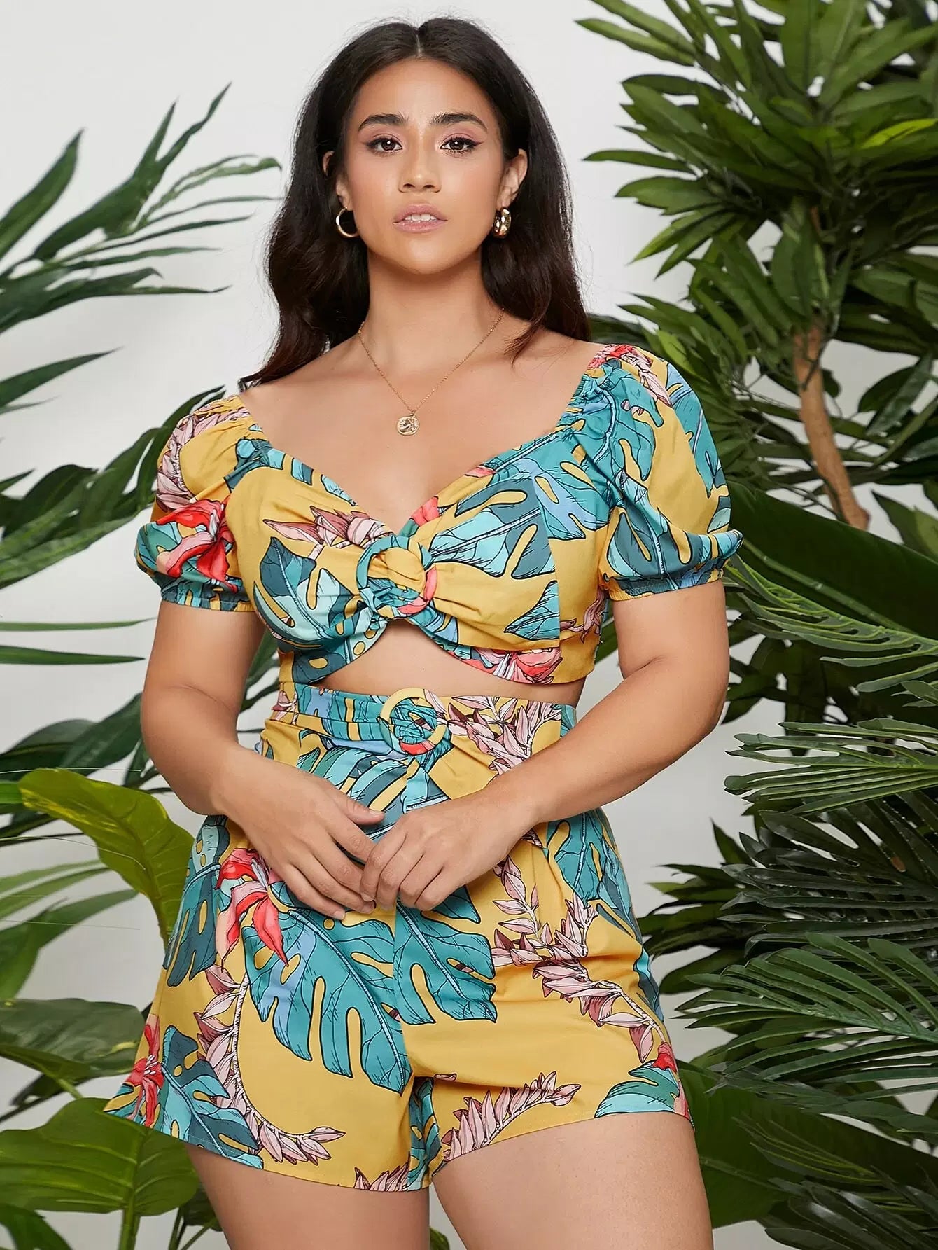 طقم بلوزة وشورت بنقشة استوائية بطبعة استوائية من الأمام بقصّة بلس تويست وشورت