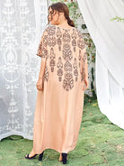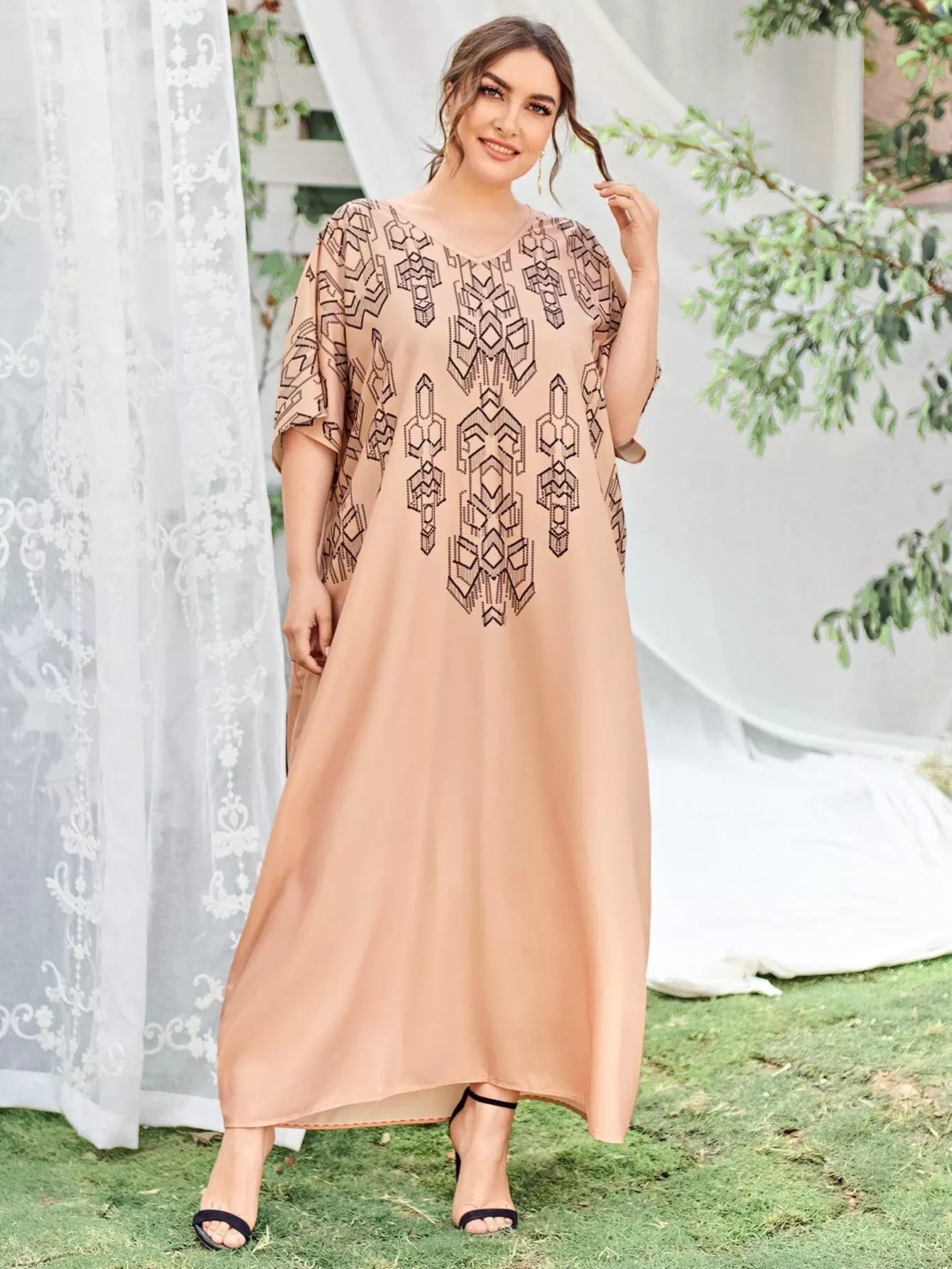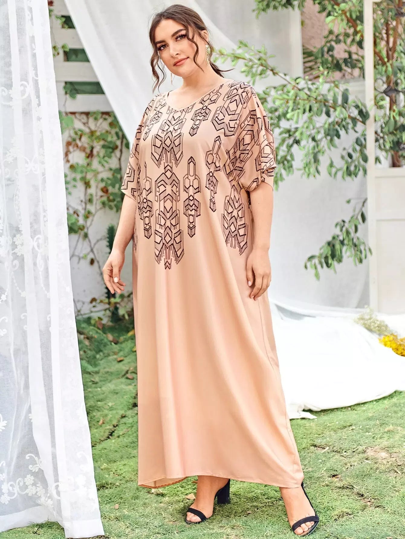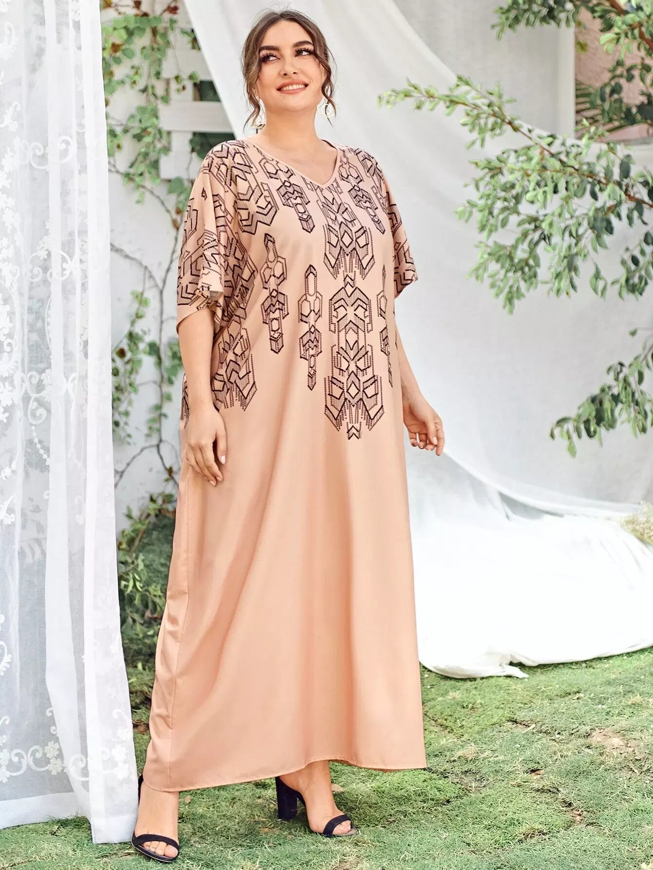 نحيف - مقاس كبير فستان بطبعة جغرافية وأكمام جناح الخفاش وياقة على شكل حرف V