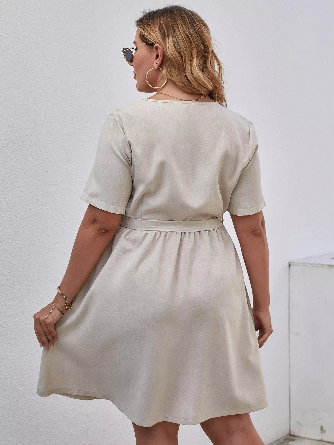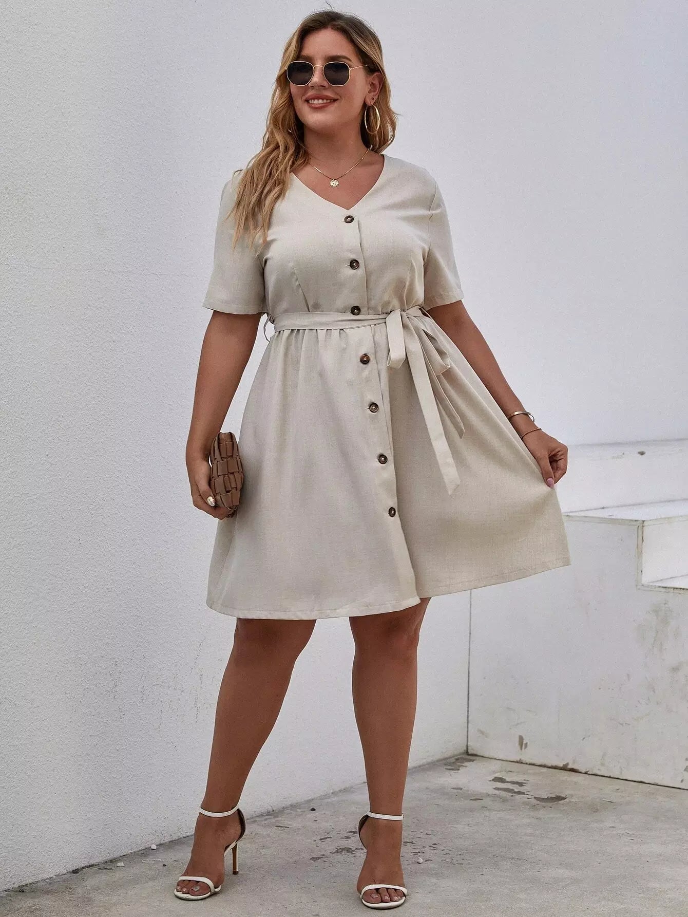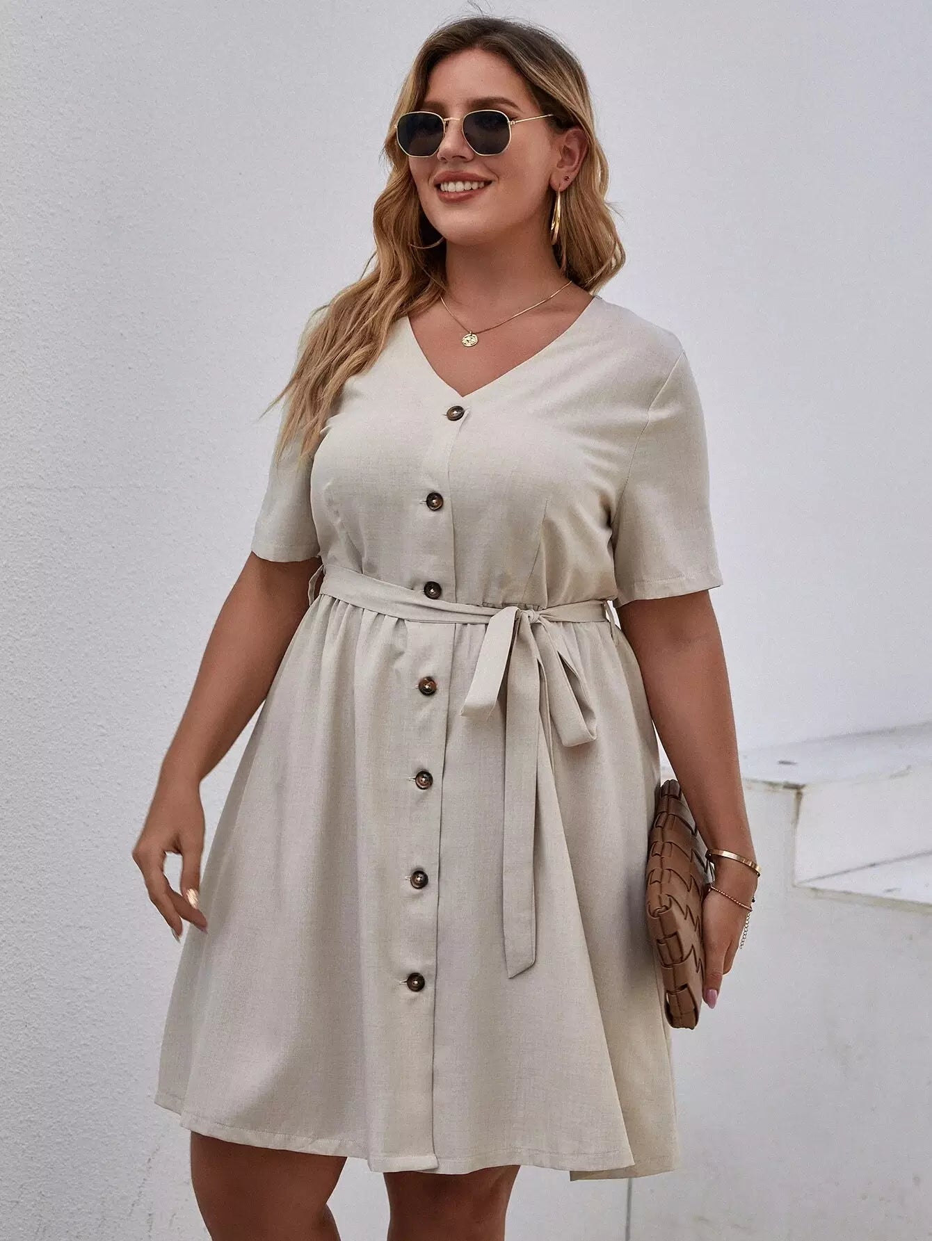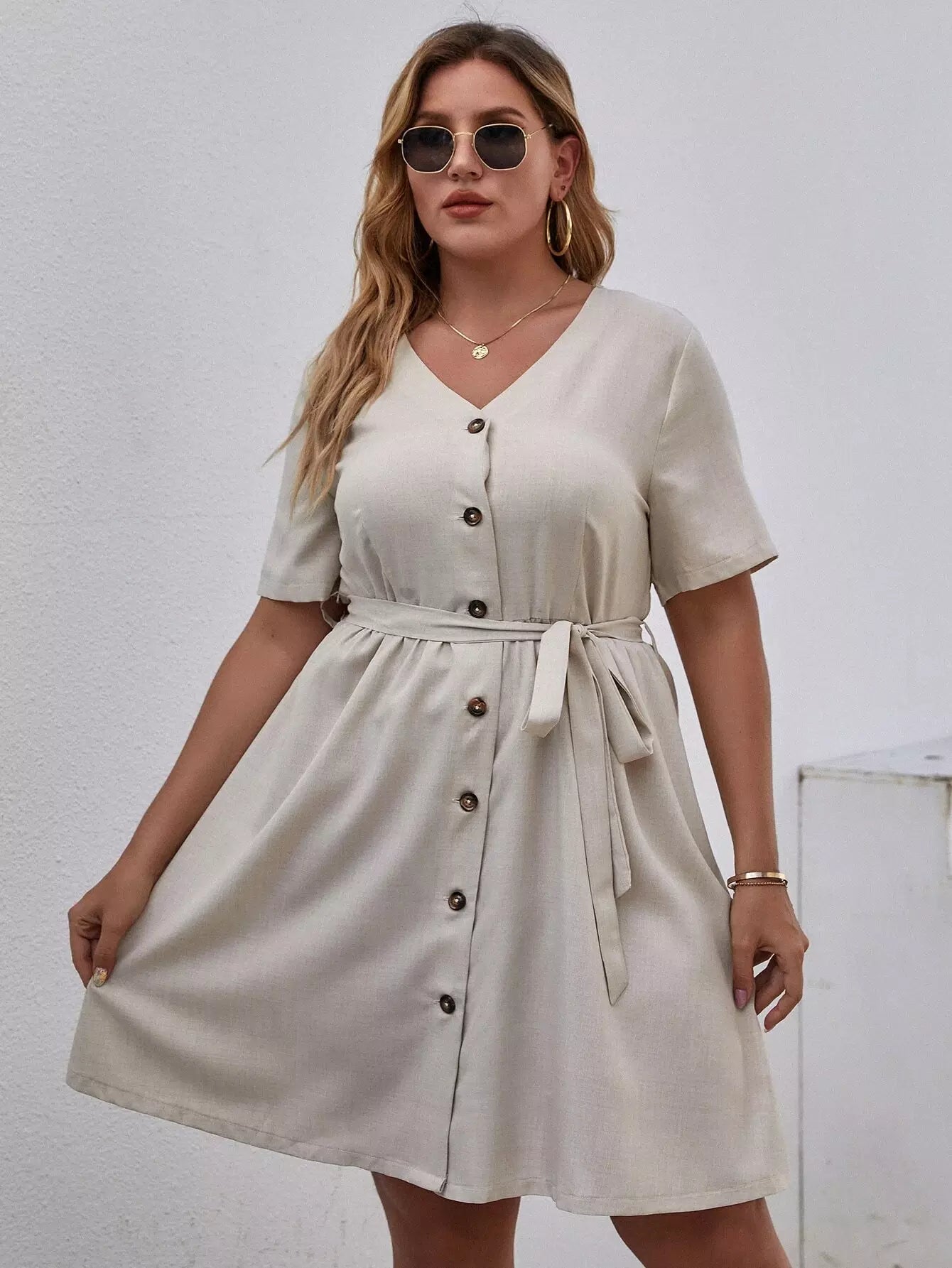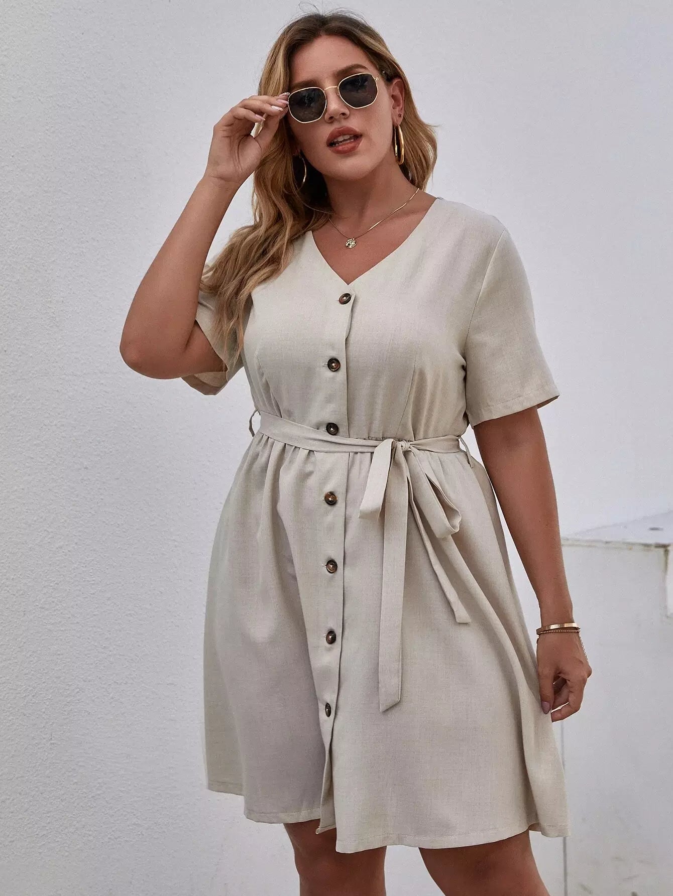 نحيف - مقاس كبير فستان بحزام وأزرار أمامية على شكل حرف V