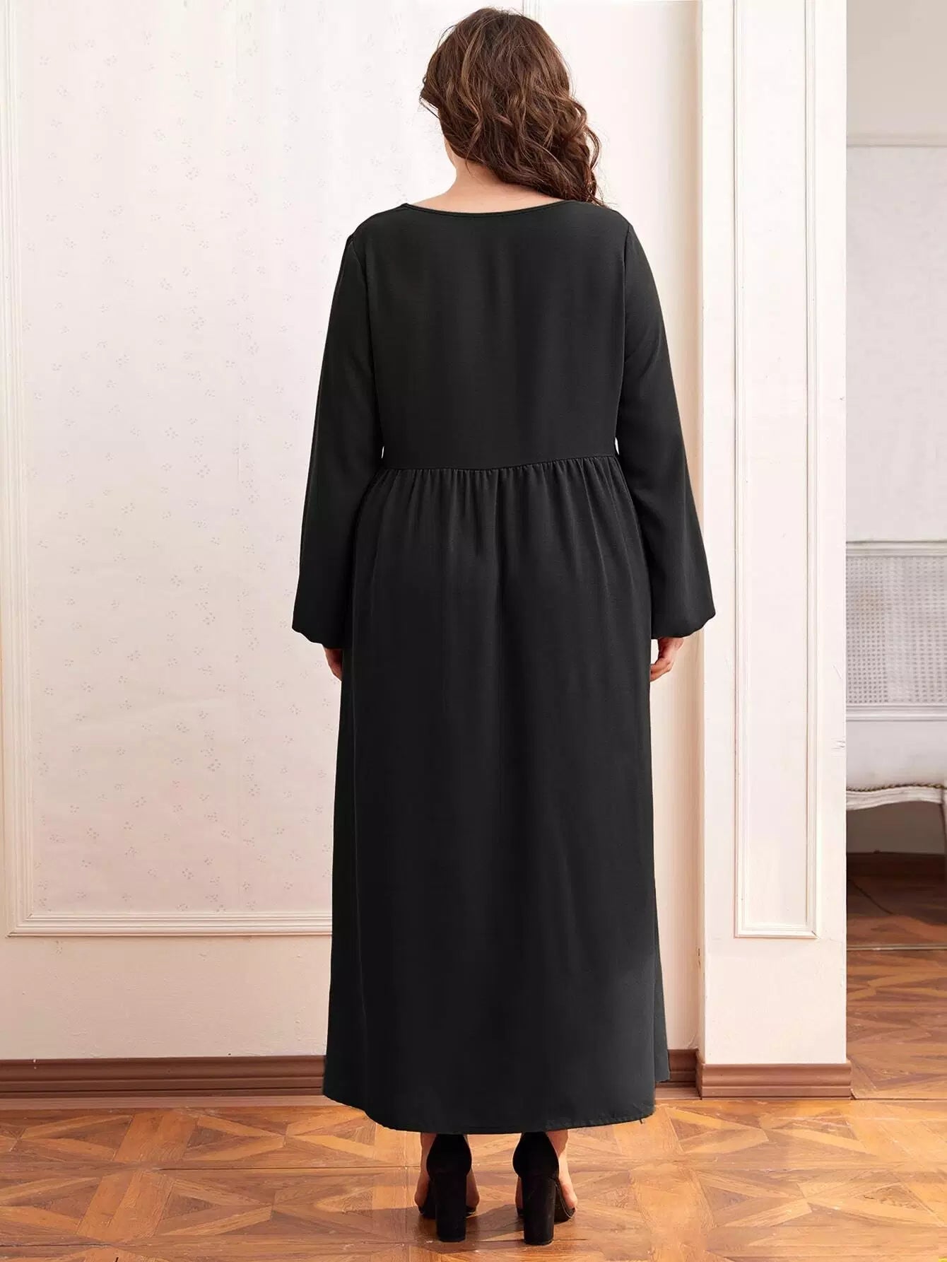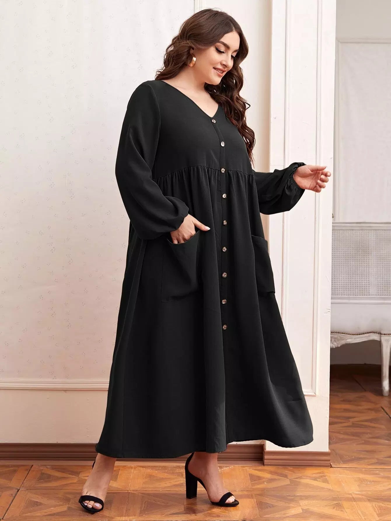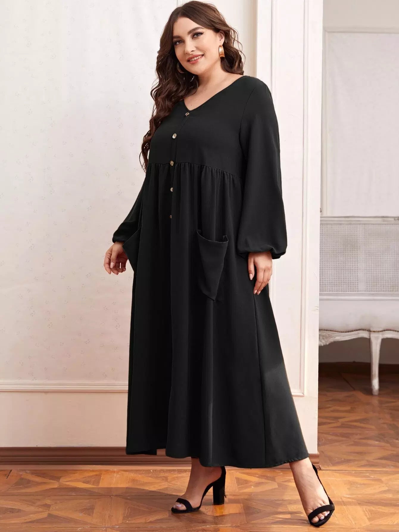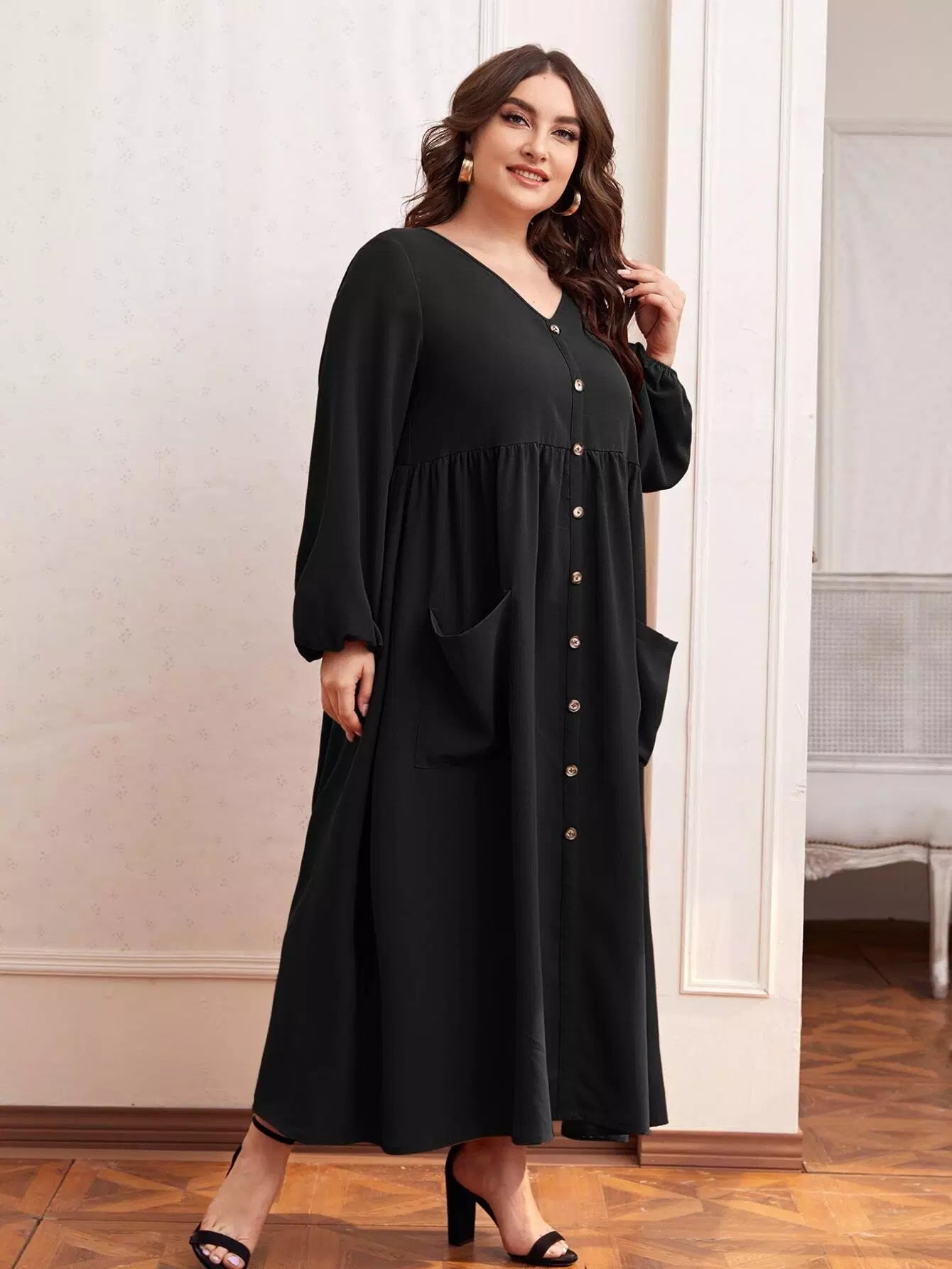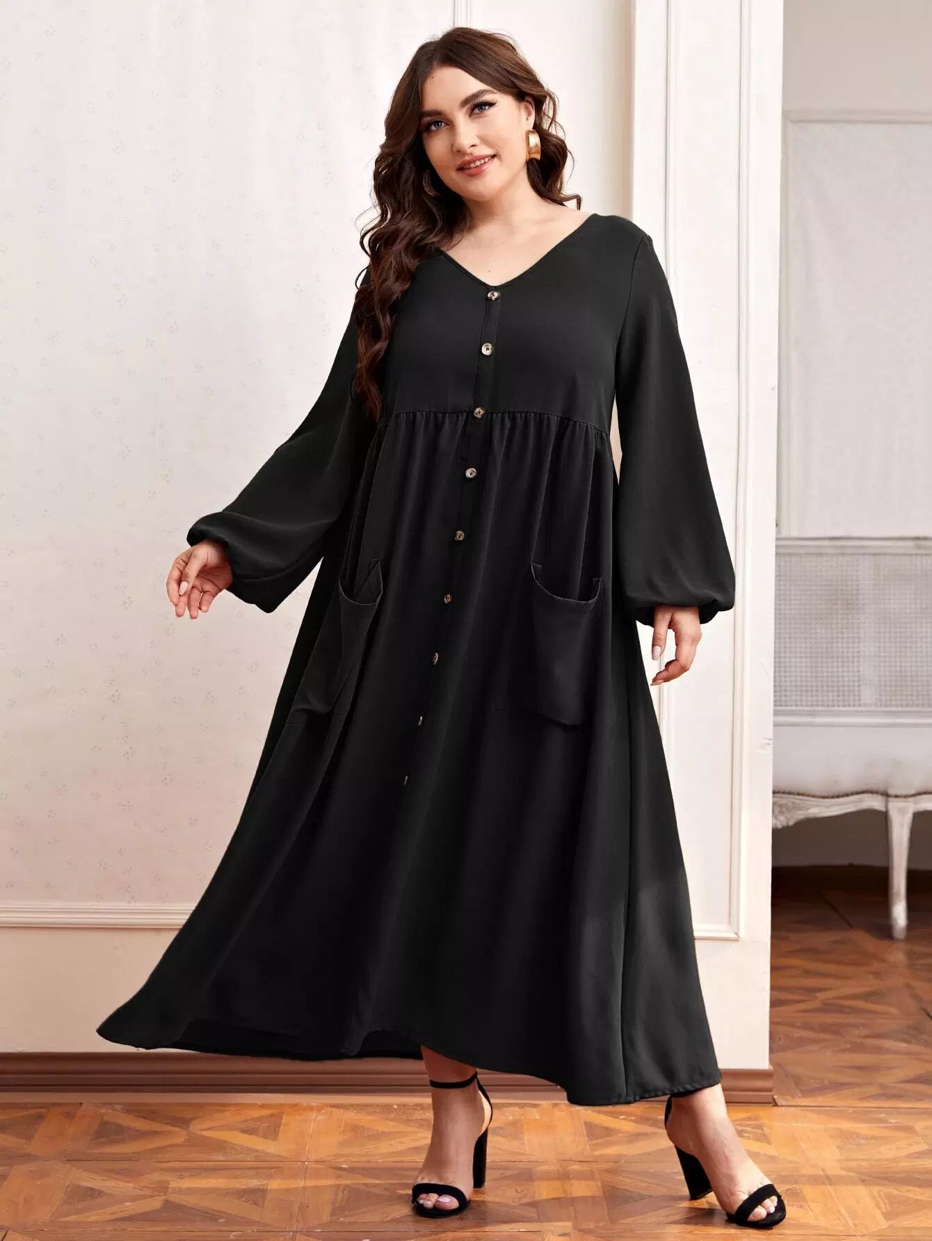 فستان بياقة على شكل حرف V بياقة على شكل حرف V زائد وأكمام على شكل فانوس وجيب مرقع