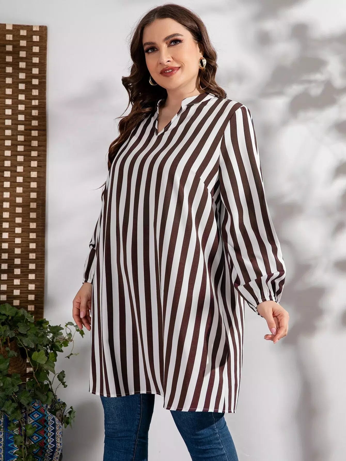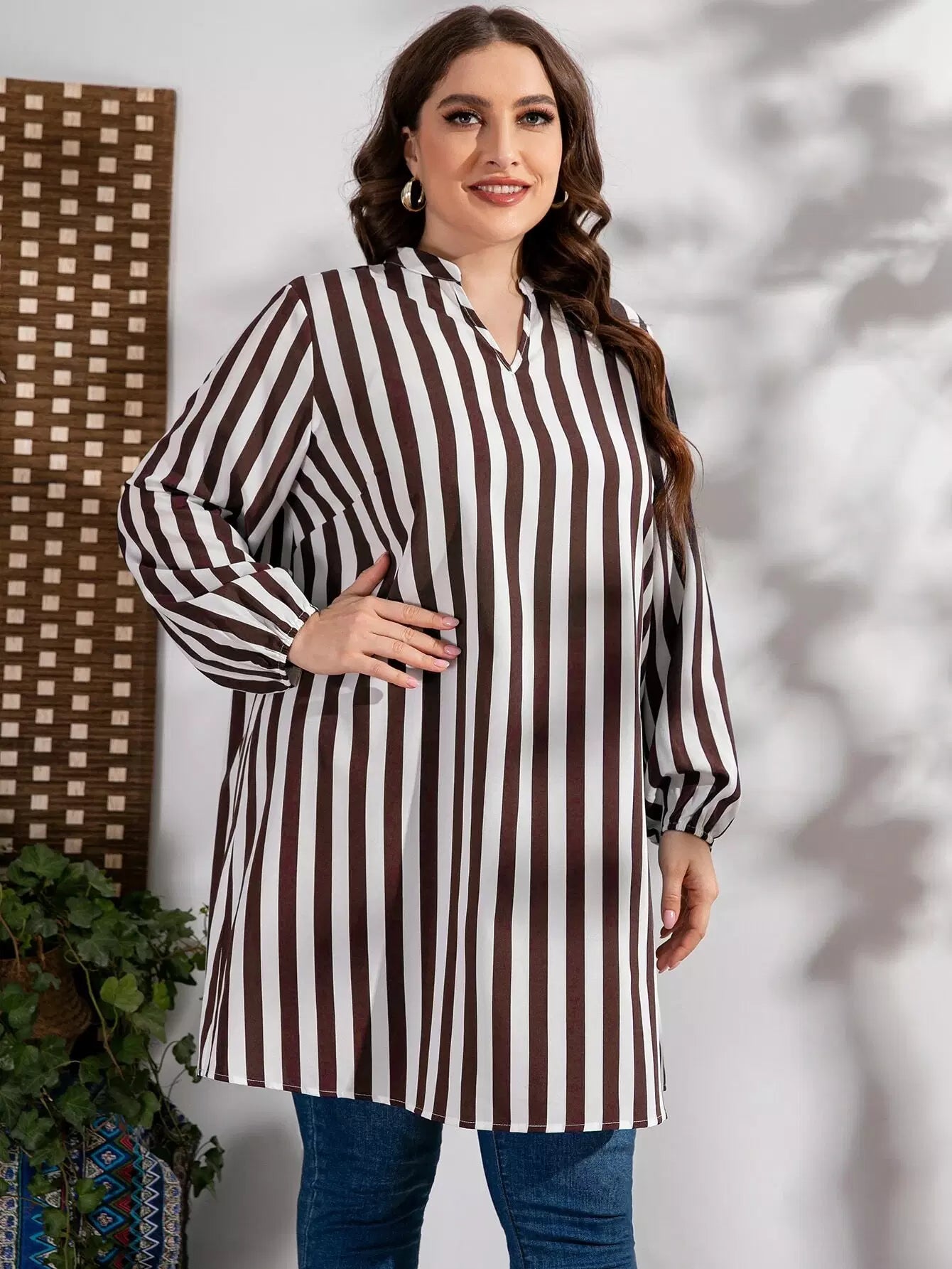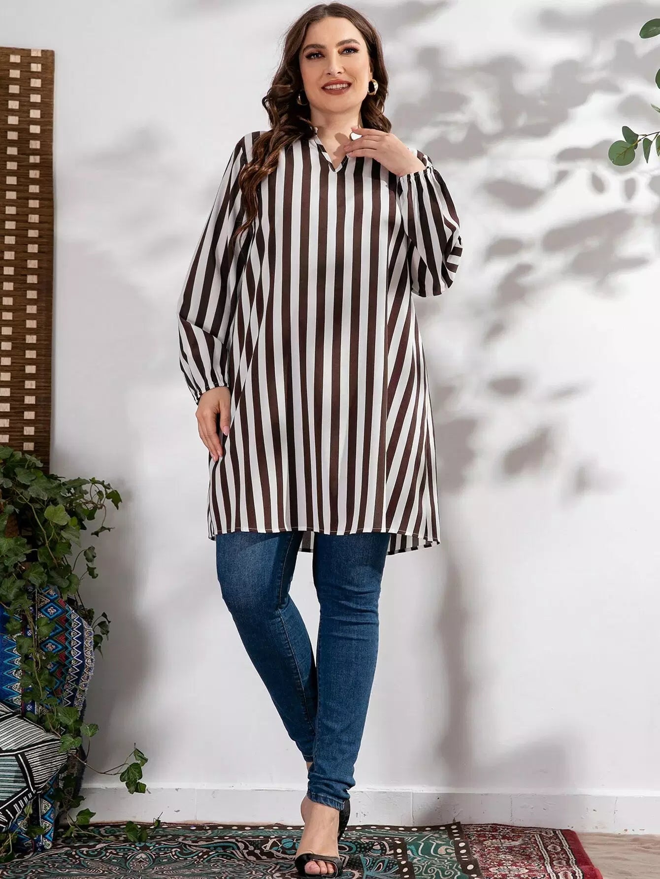 بلوزة بأكمام فانوسية بأكمام مخططة عمودياً برقبة مخططة عمودياً