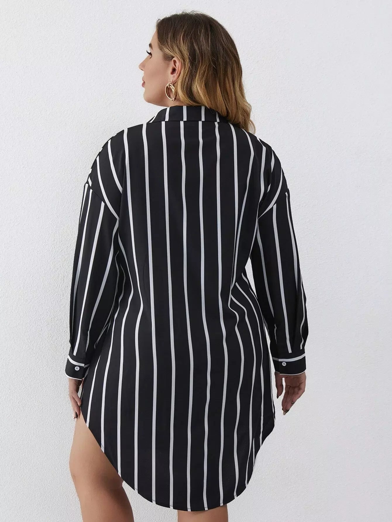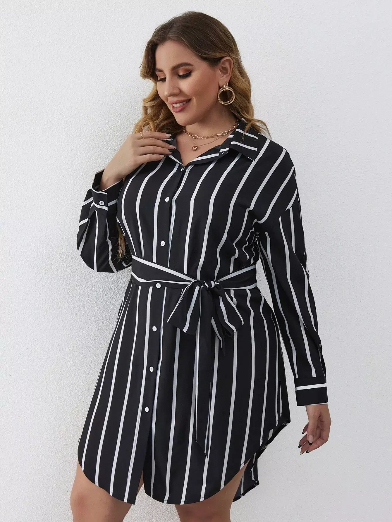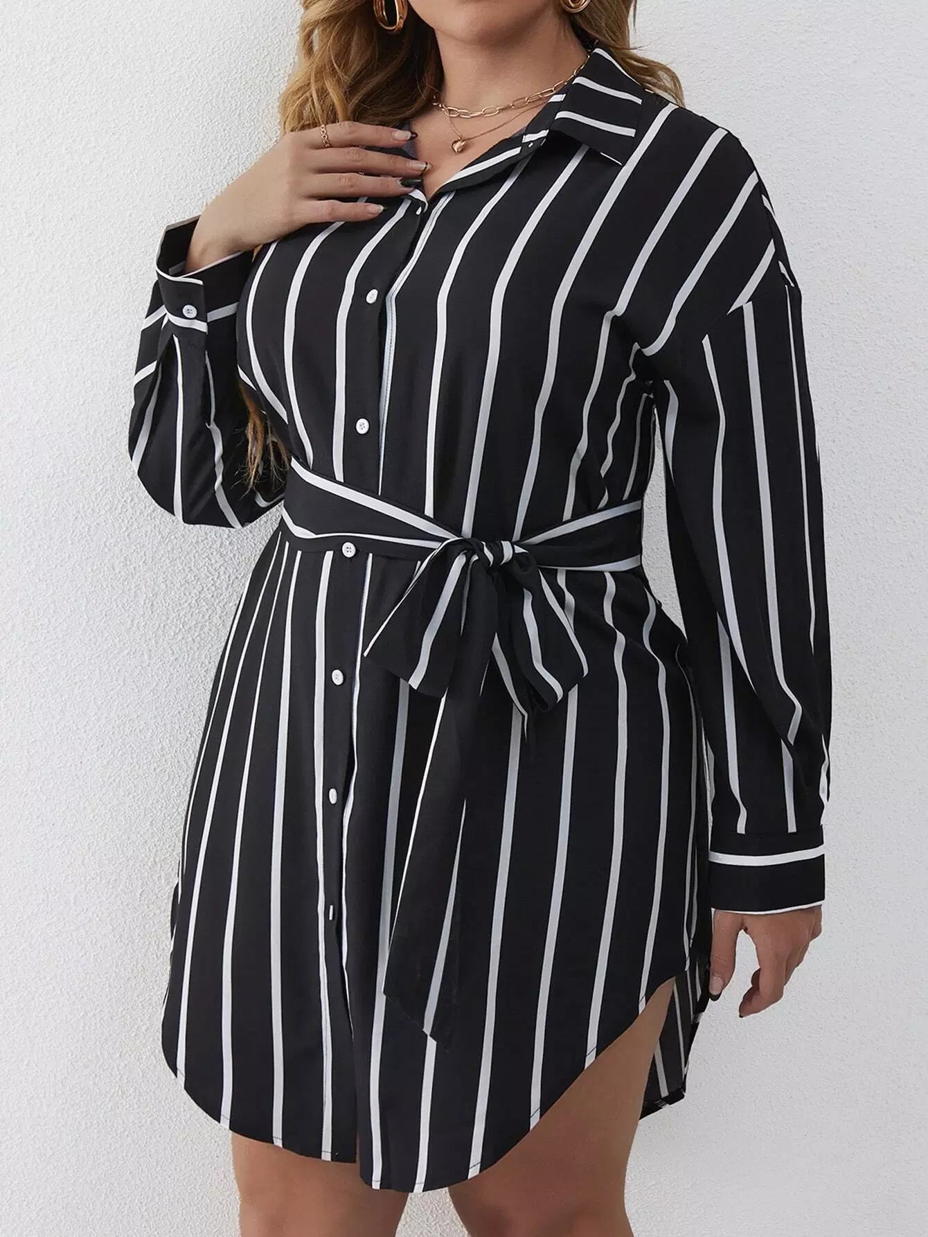 فستان قميص مخطط عموديًا بربطة عنق أمامية زائد