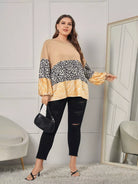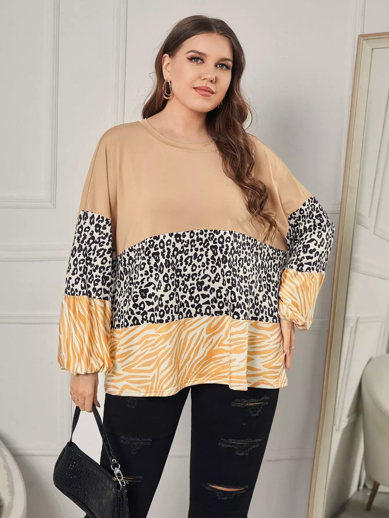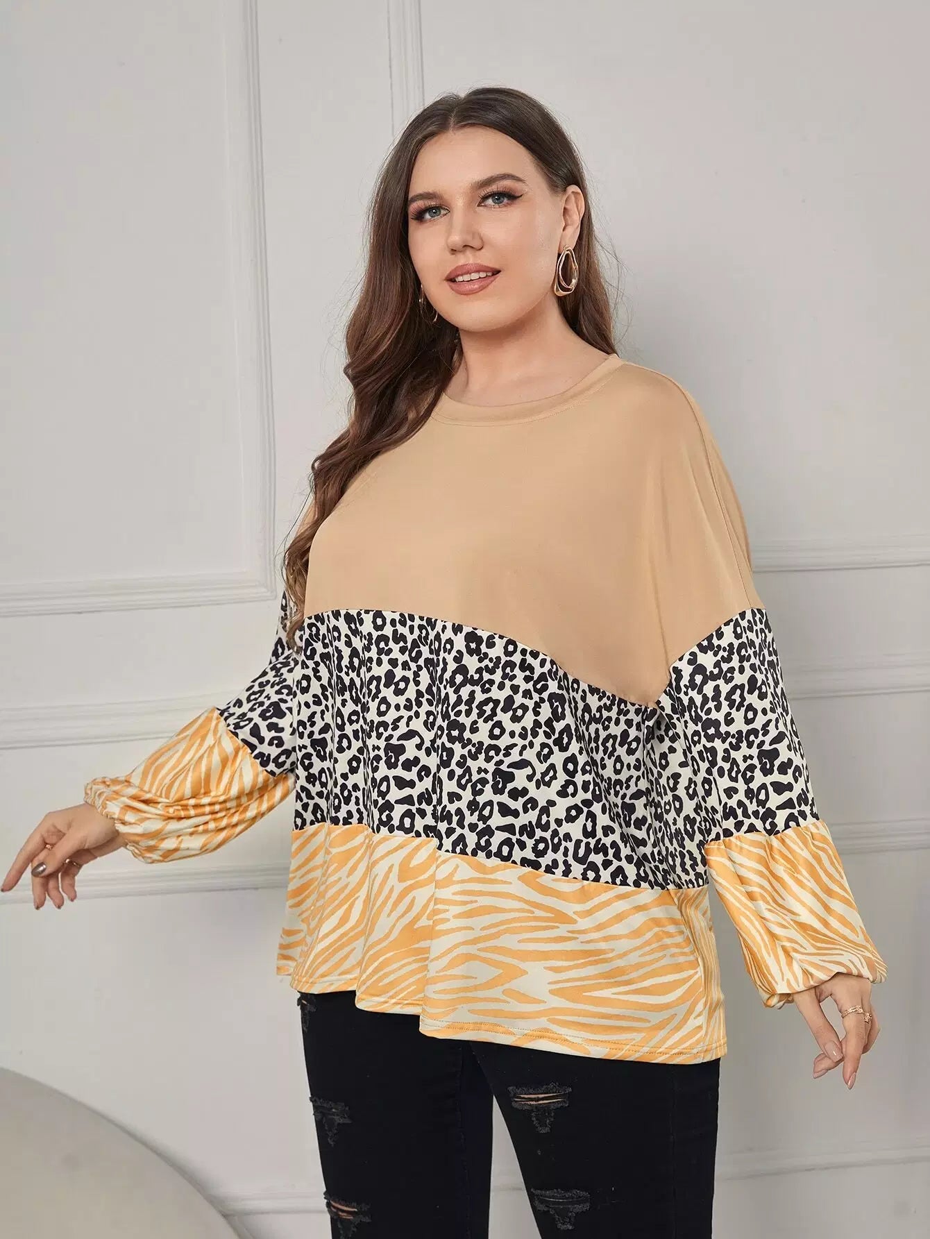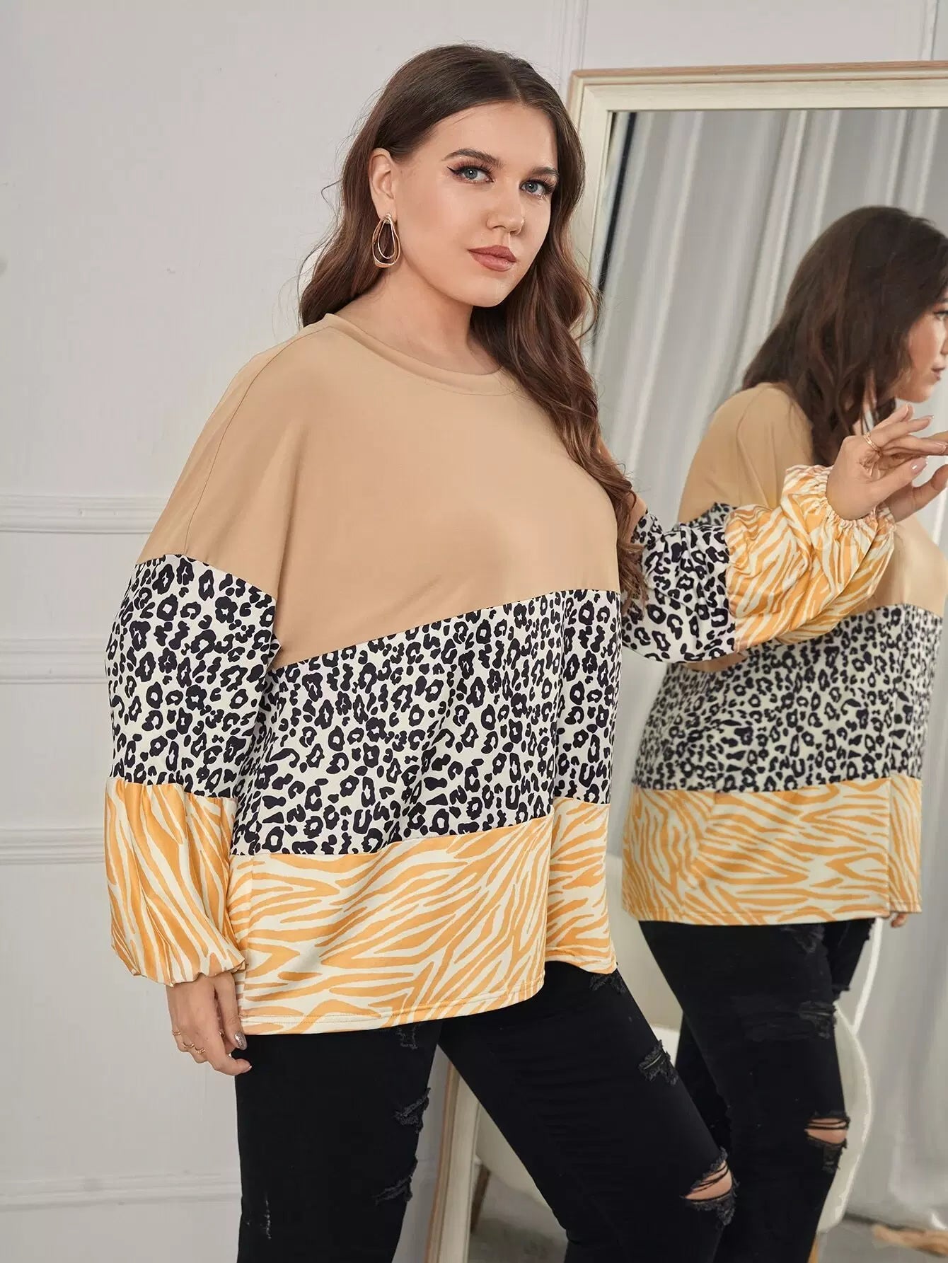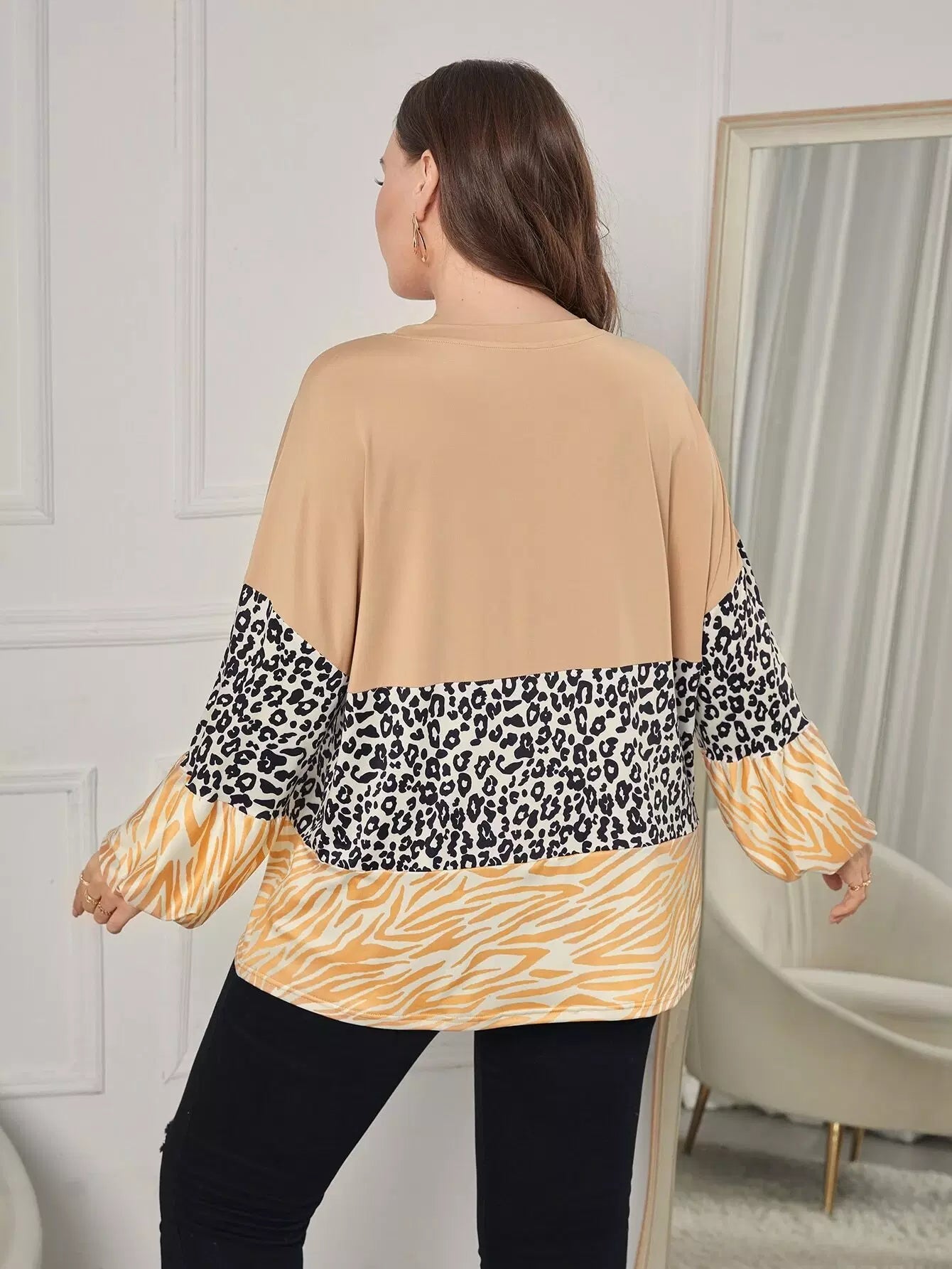 تي شيرت بأكمام مخططة بنقشة زيبرا وطبعة فهد