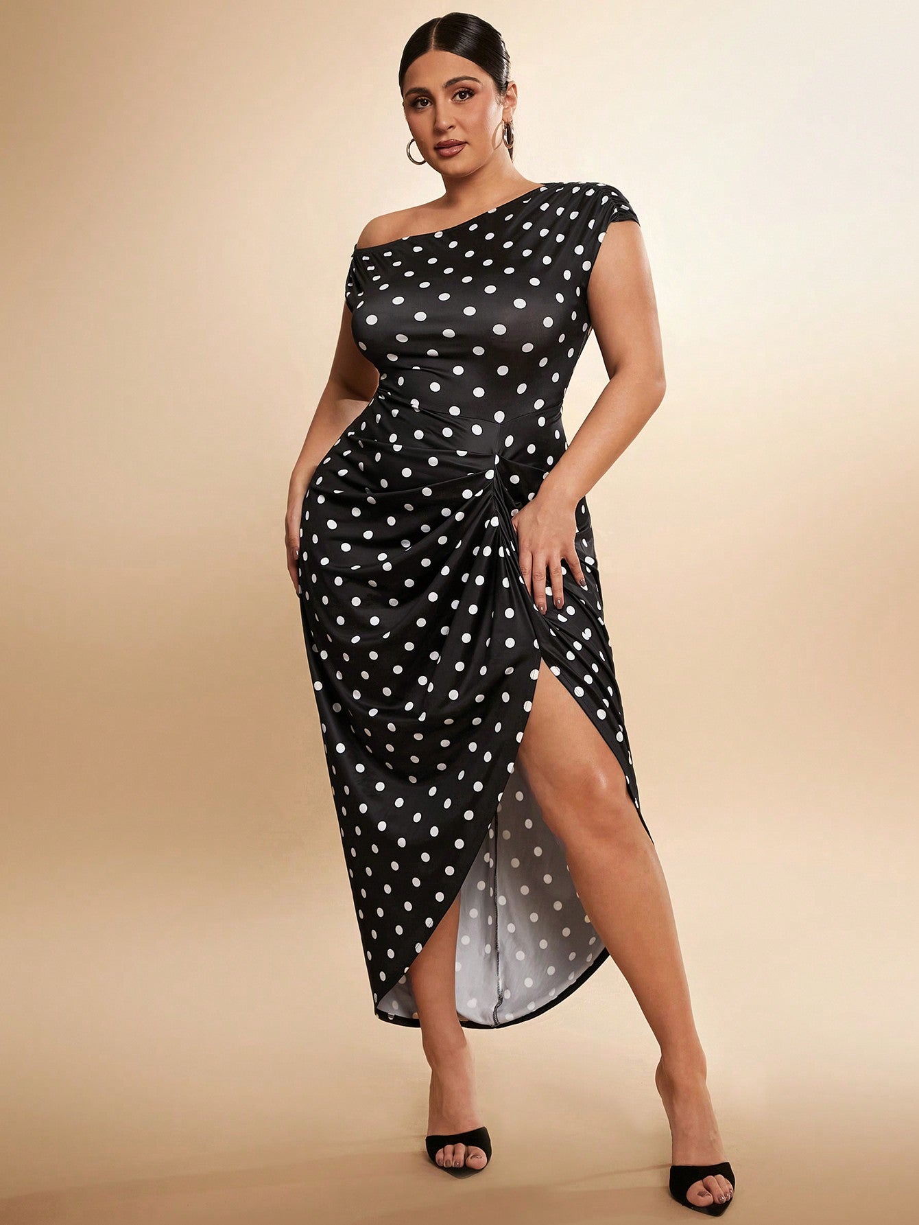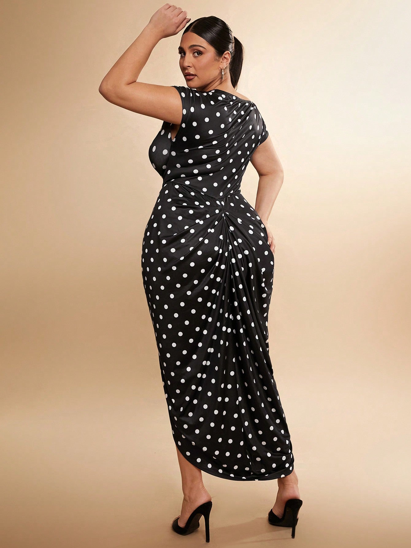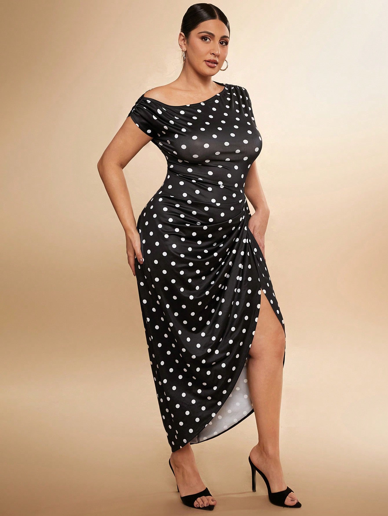 women SHEIN BAE Plus Size Women's Black Polka Dot French Retro Elegant Fashionable Ruched High Slit Dress Suitable For Dates