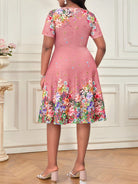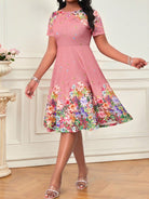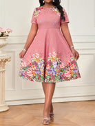 women SHEIN Lady Spring And Summer Casual Elegant Boho Pink Botanical Print Round Neck Short-Sleeved Waist A-Line Spring Afternoon Tea Date Plus Size Dress Easter Dress Women Sundress Spring Outfits For Women