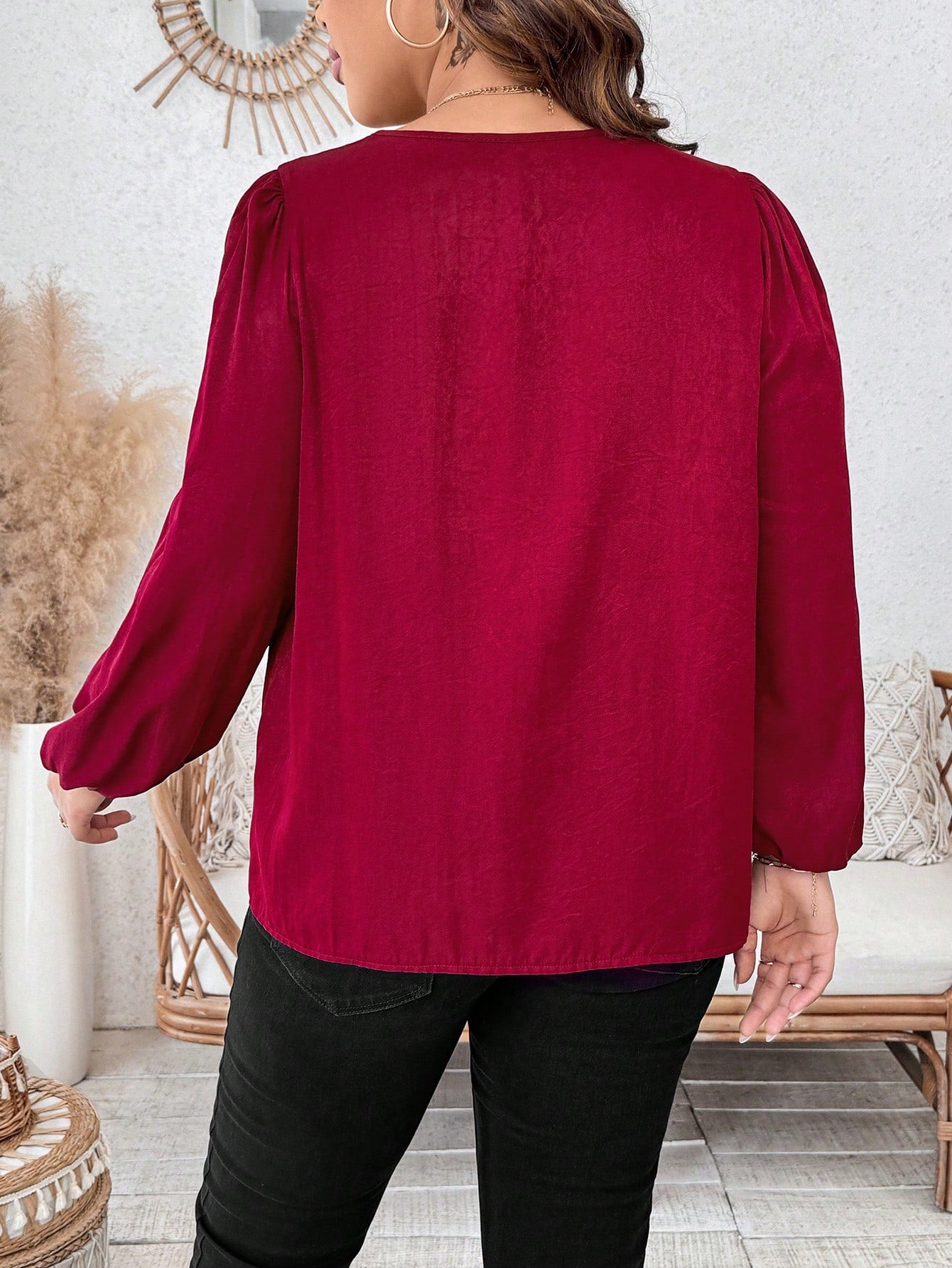 قميص SHEIN LUNE نسائي مقاس كبير برقبة على شكل حرف V وأكمام منتفخة بتصميم بسيط كاجوال