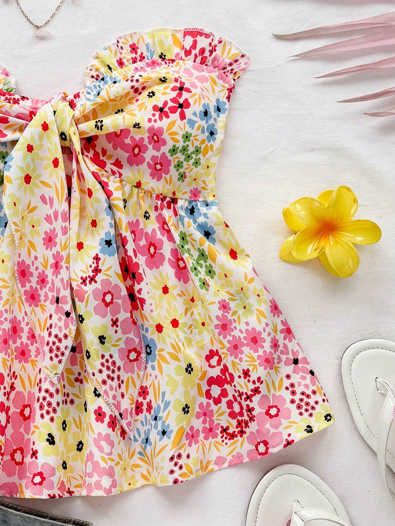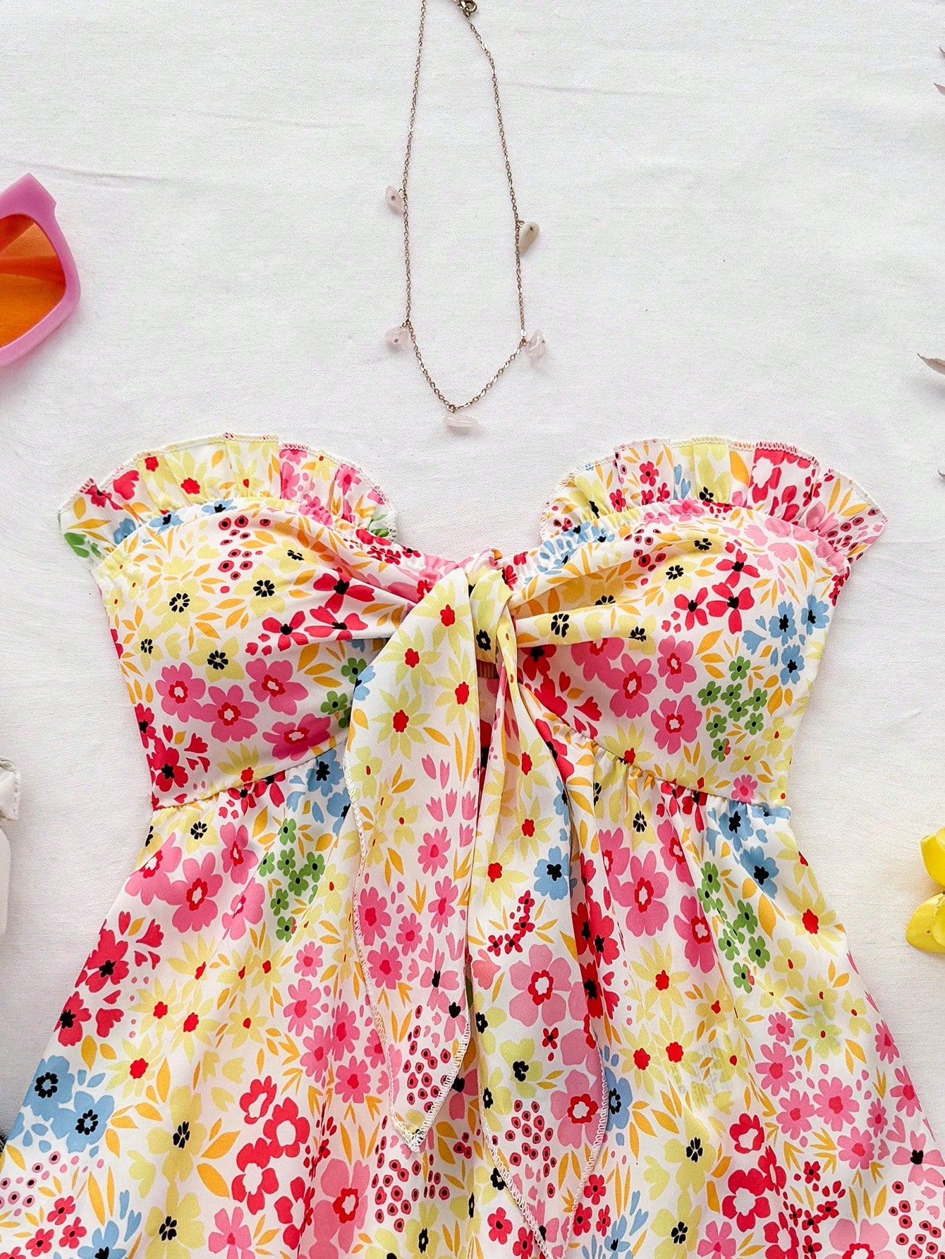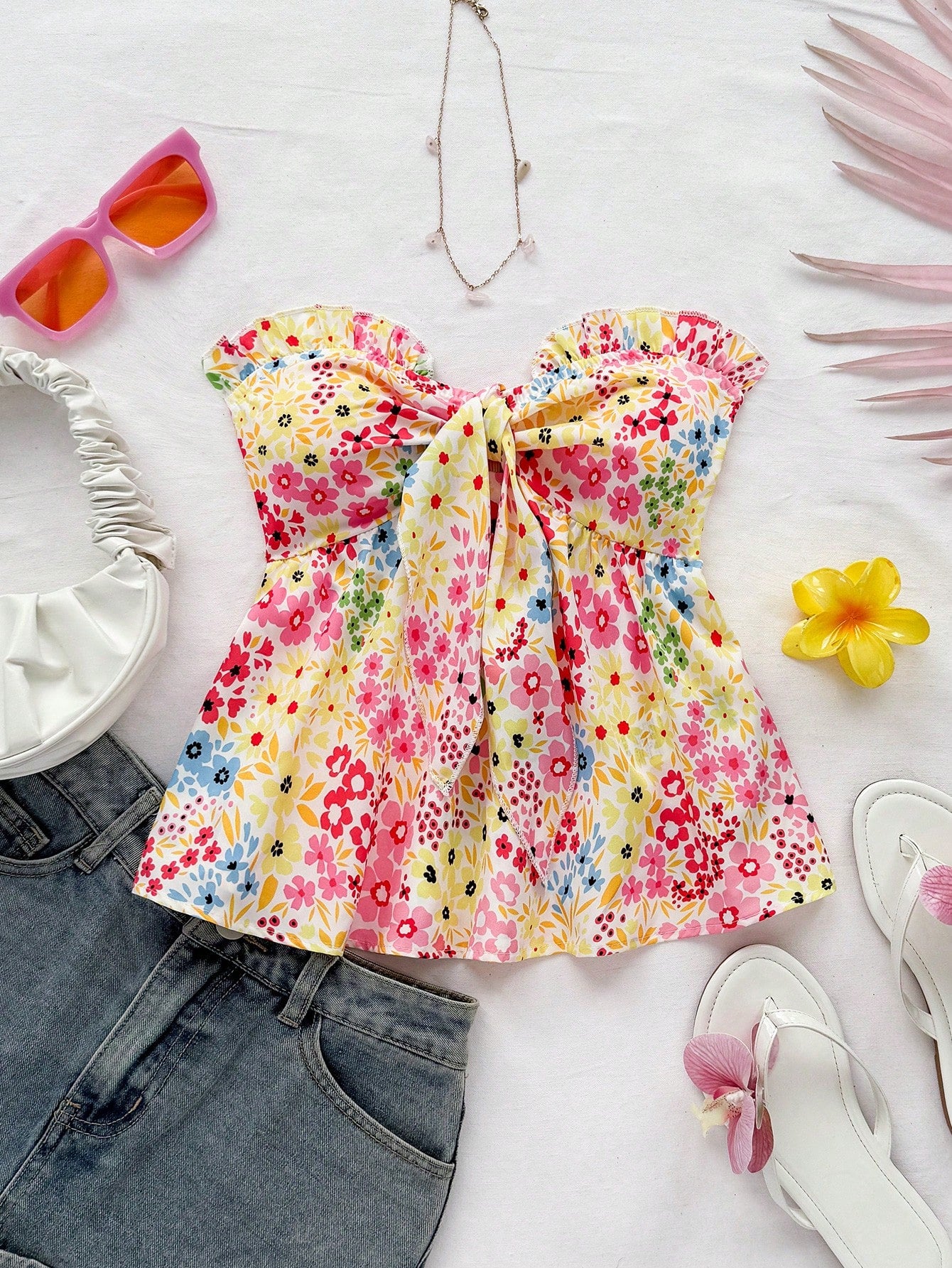 Soleia Plus Size Women Vacation Romantic Ditsy Floral Strapless Ruffle Patchwork Front Tie Bow Loose
