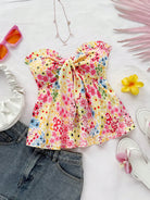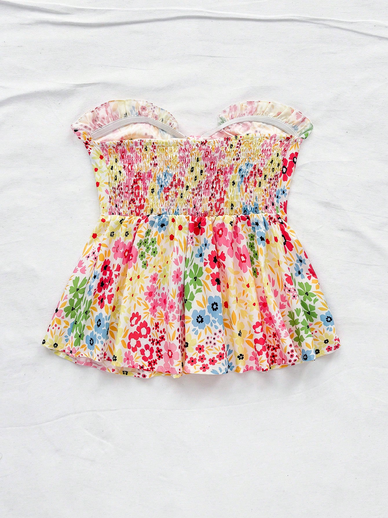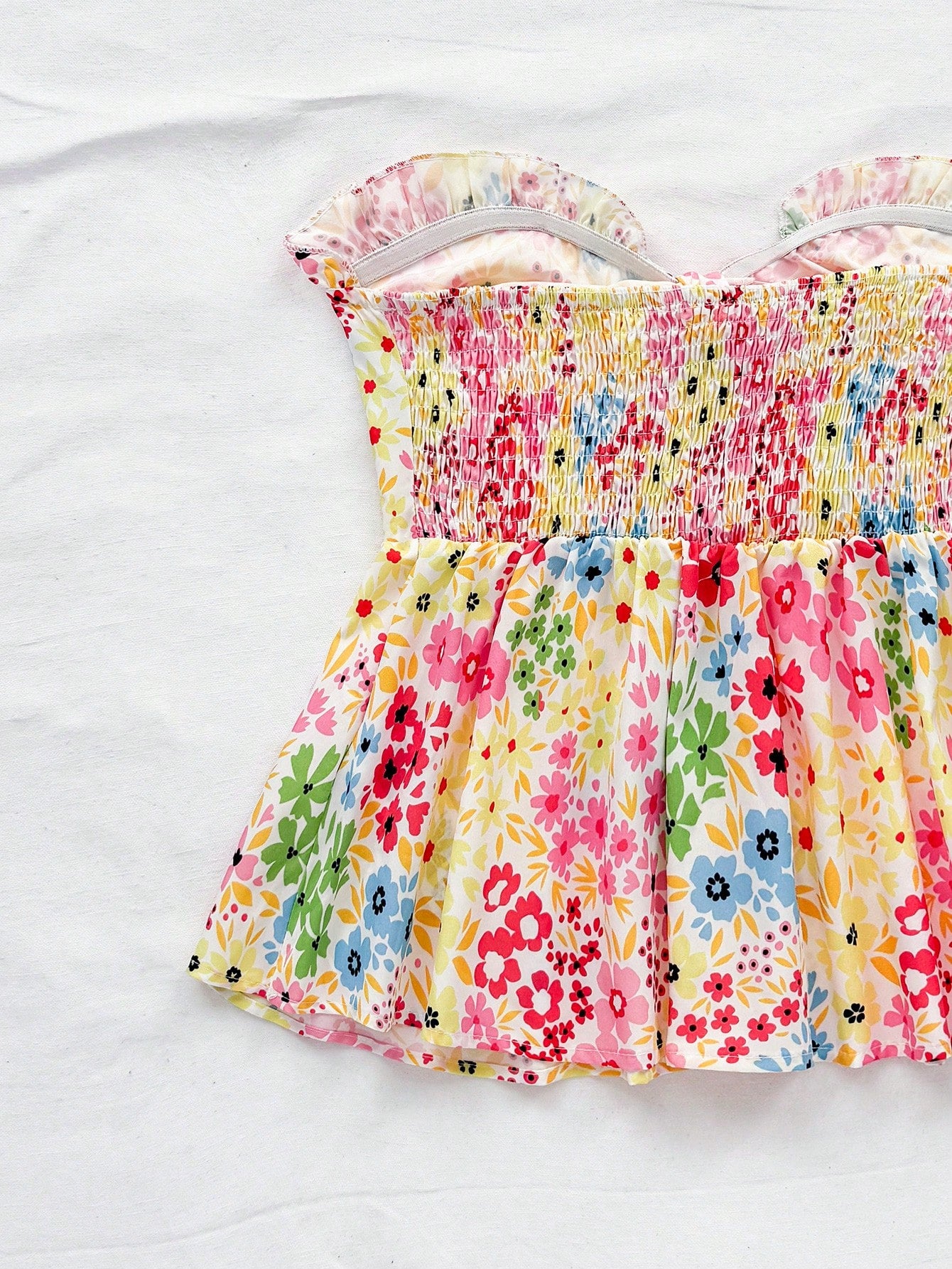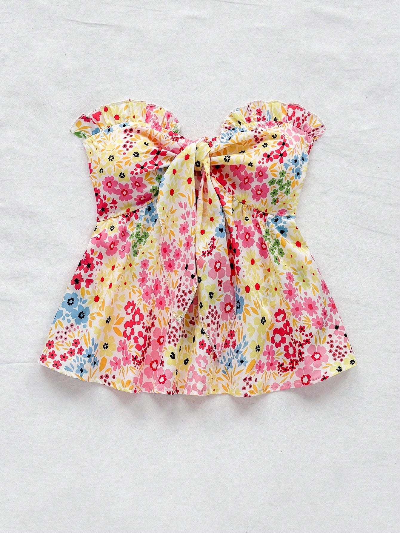 Soleia Plus Size Women Vacation Romantic Ditsy Floral Strapless Ruffle Patchwork Front Tie Bow Loose