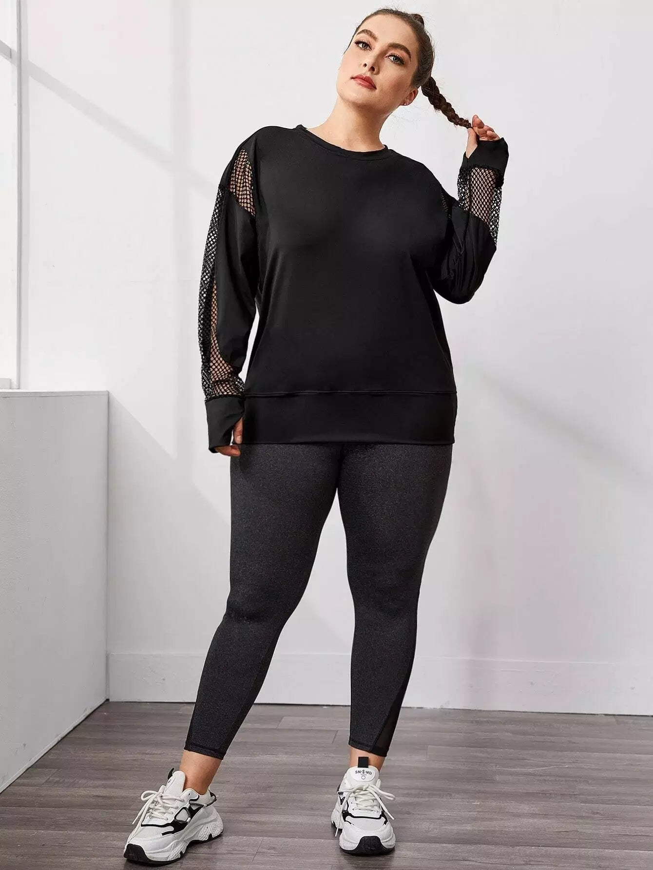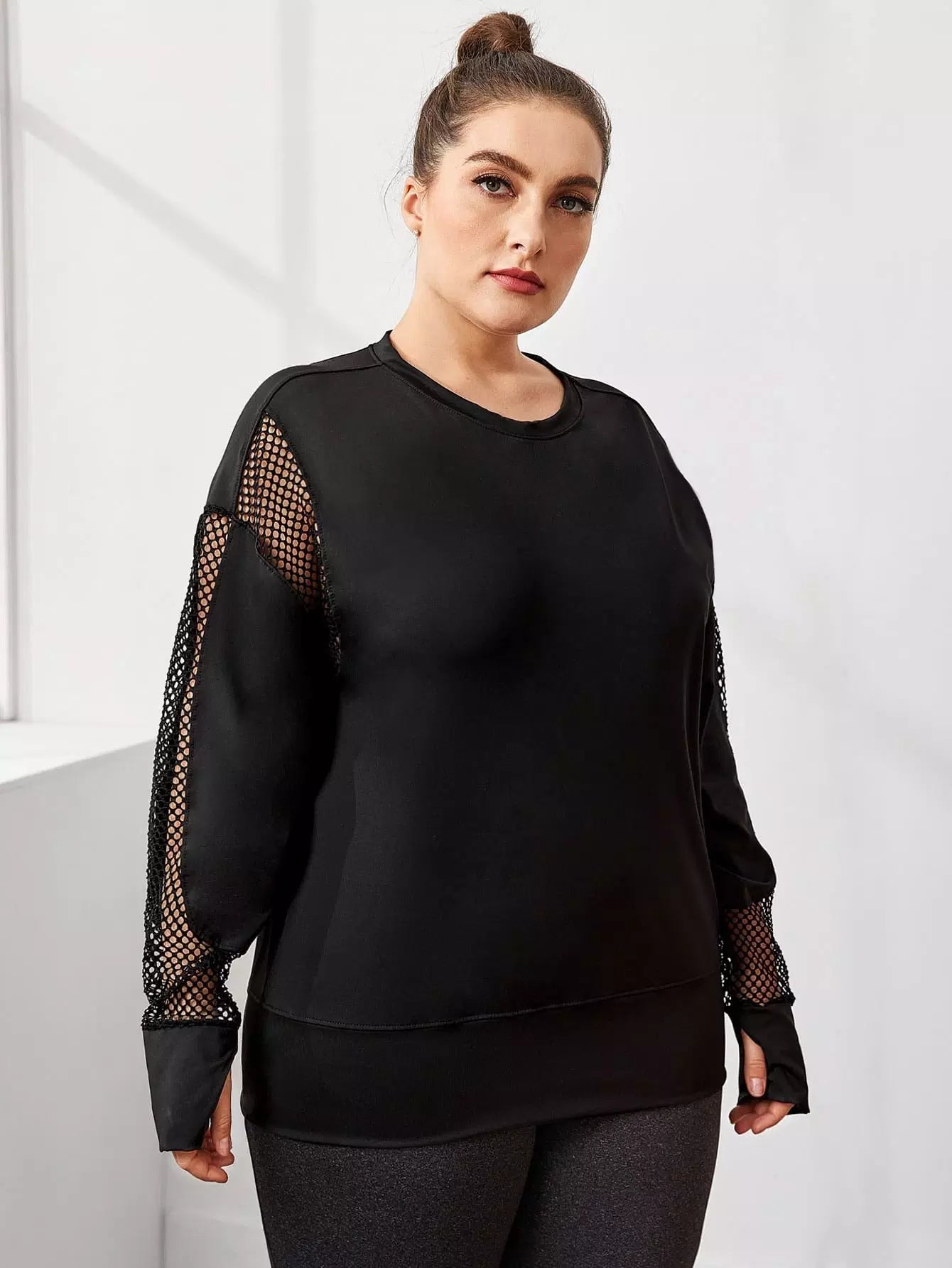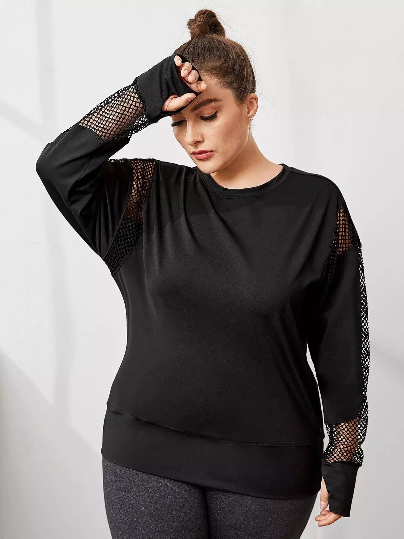نحيف - مقاس كبير سويت شيرت رياضي شبكي بفتحات إبهام متباينة