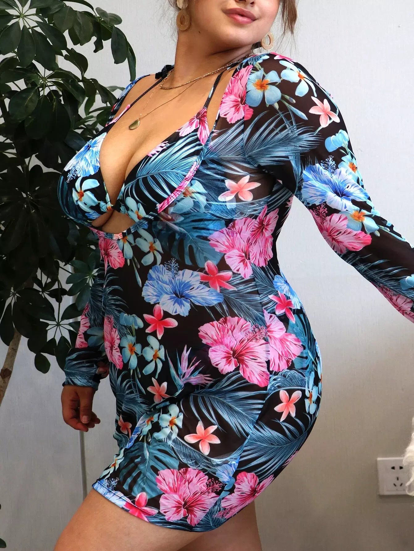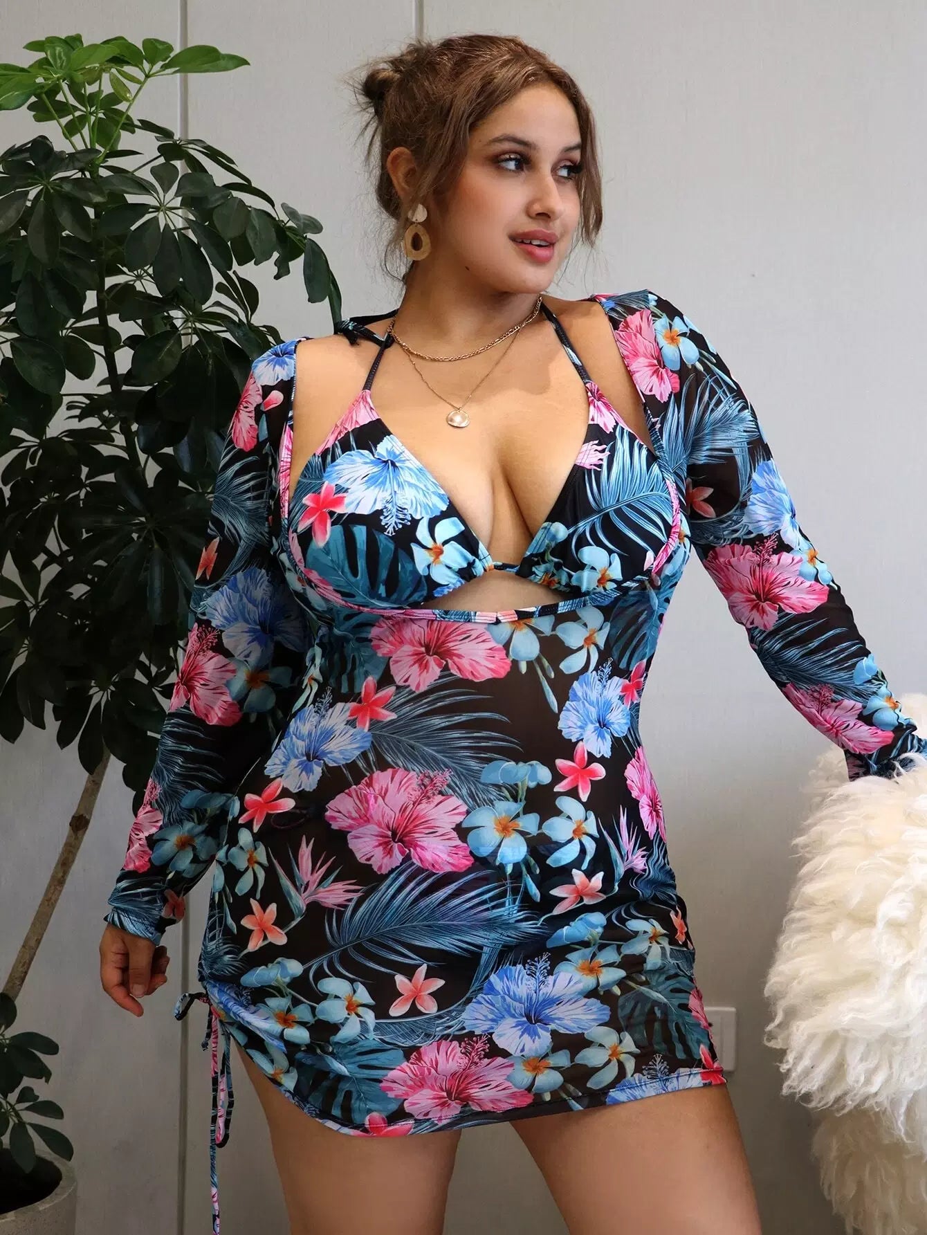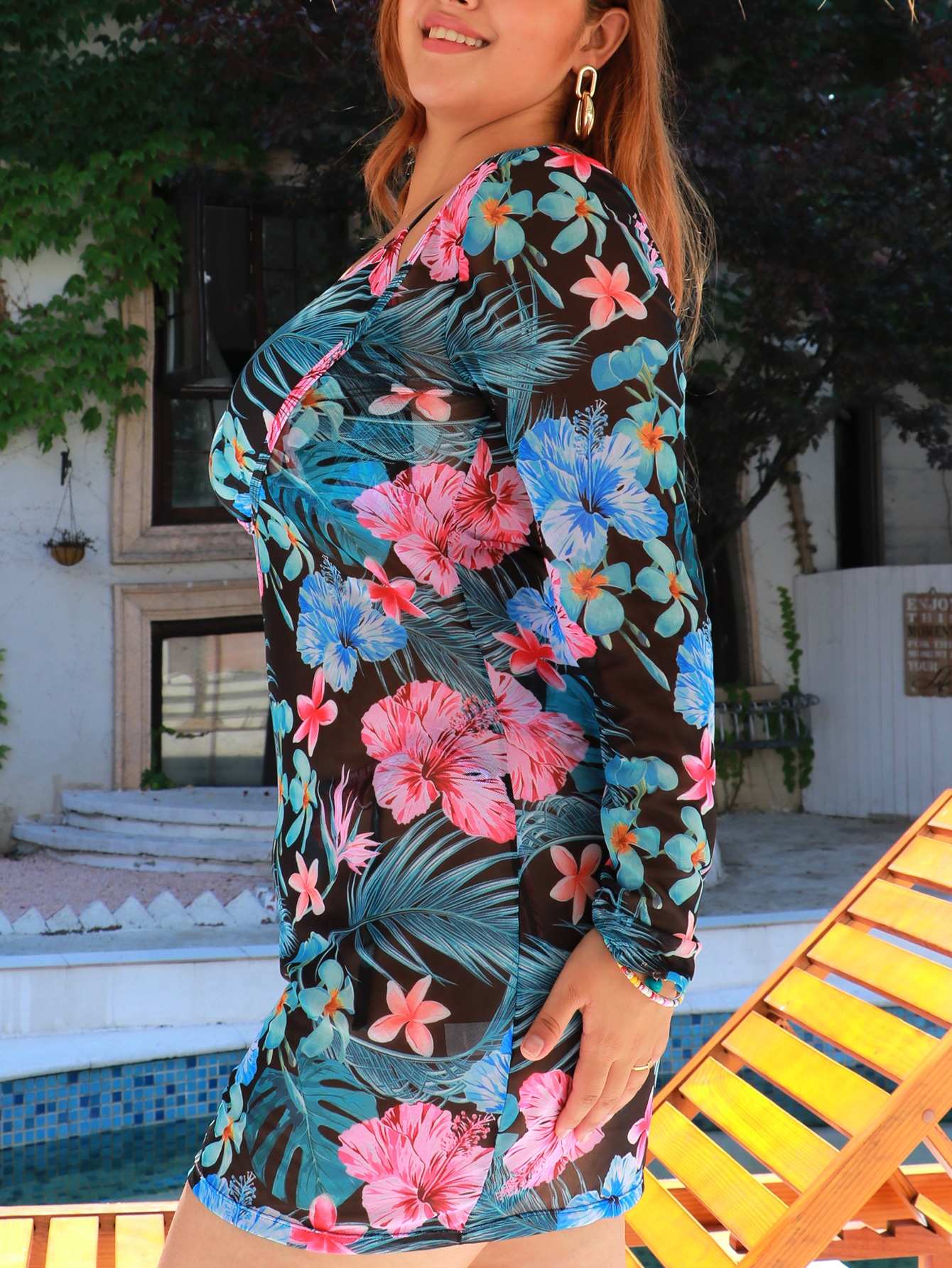 ملابس سباحة وغطاء سباحة بيكيني بطبعة زهور واستوائية 3 عبوات زائد