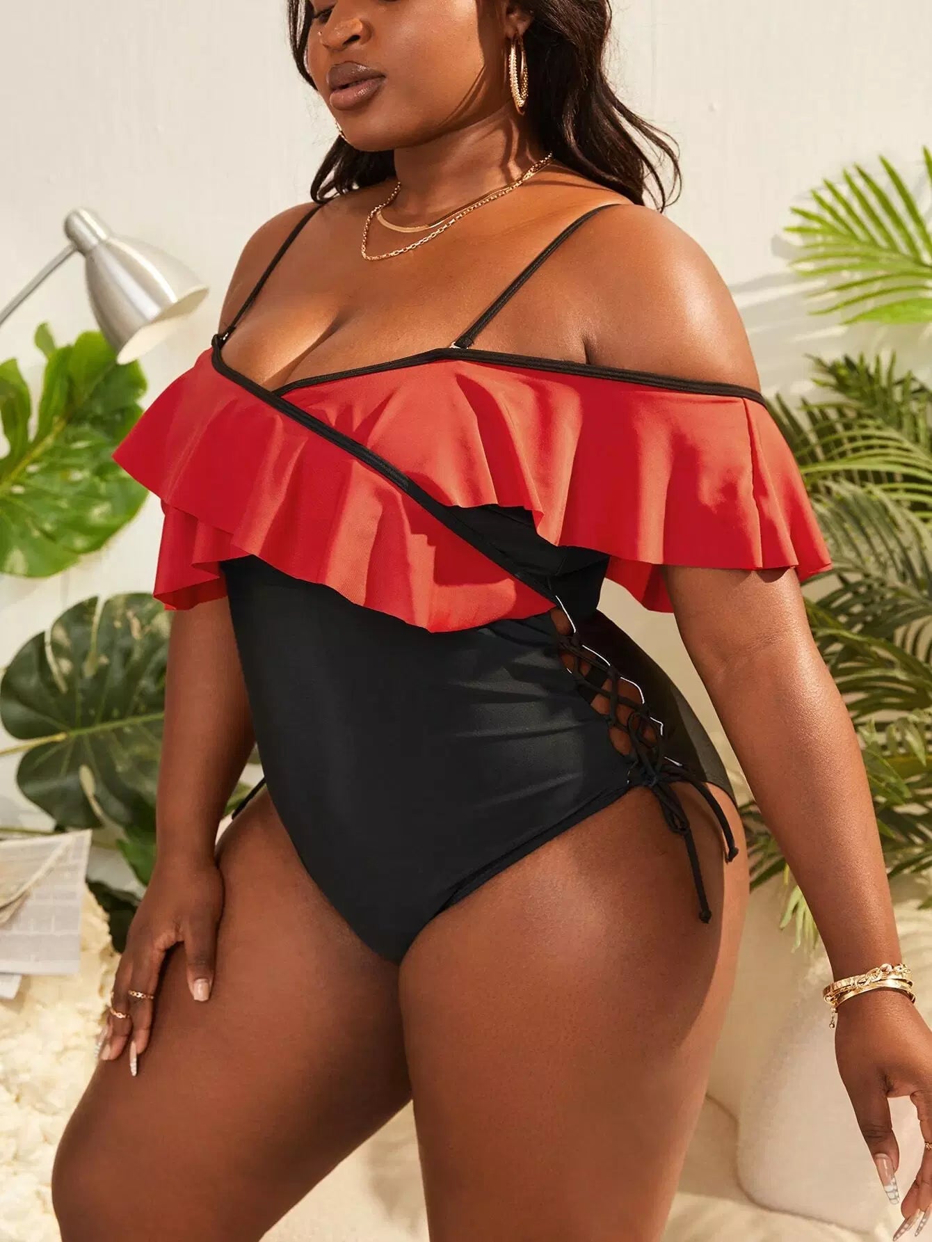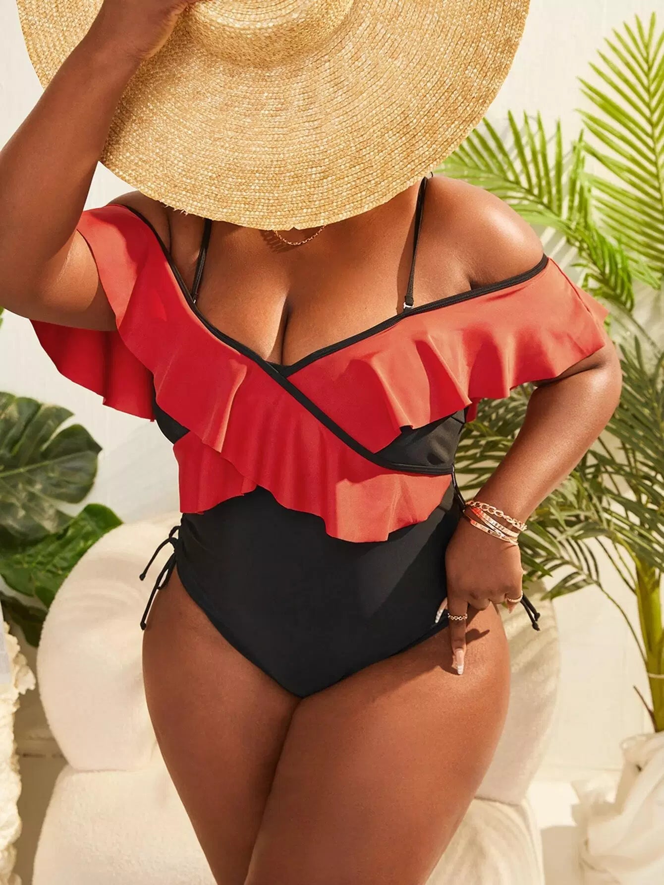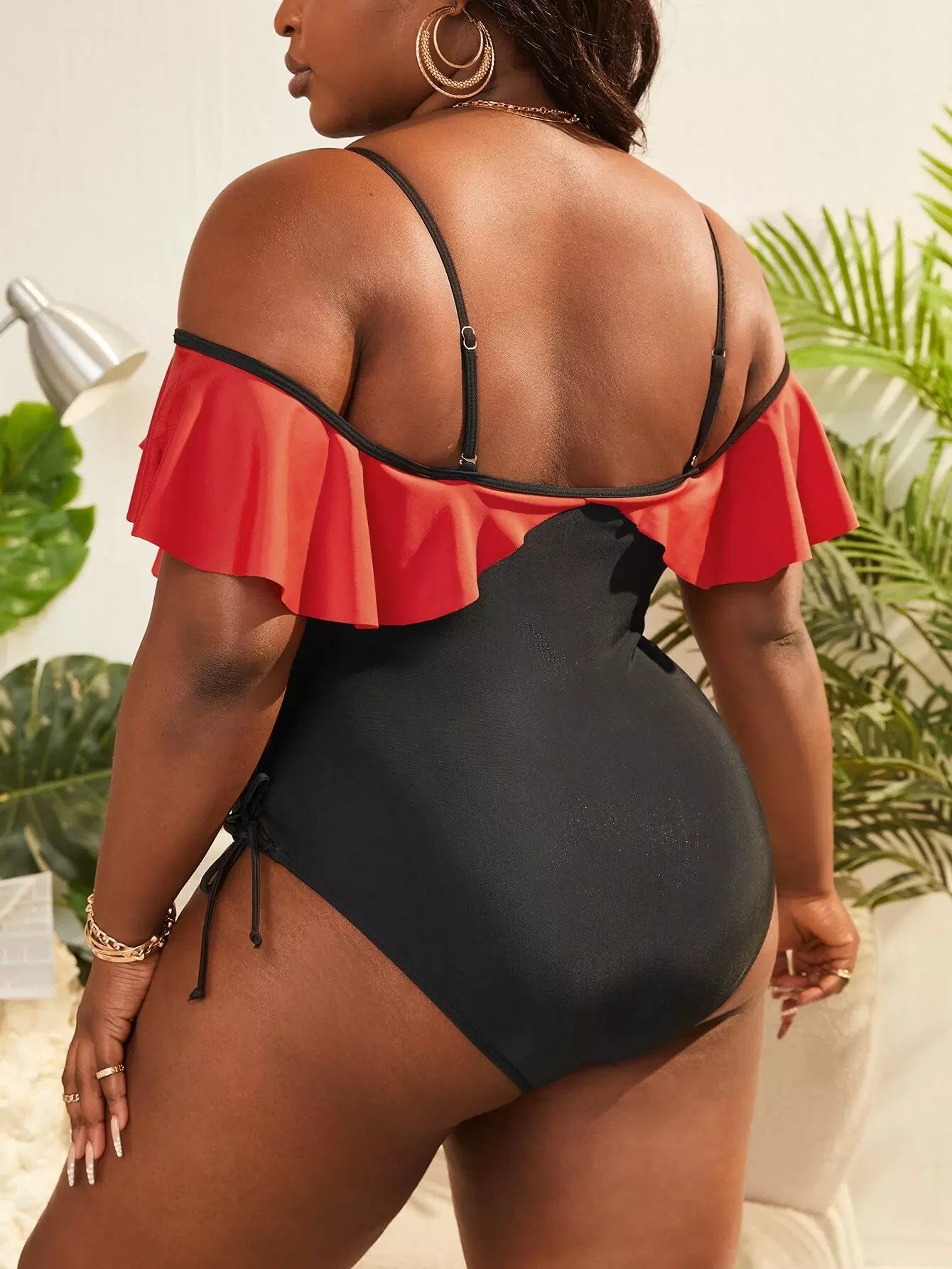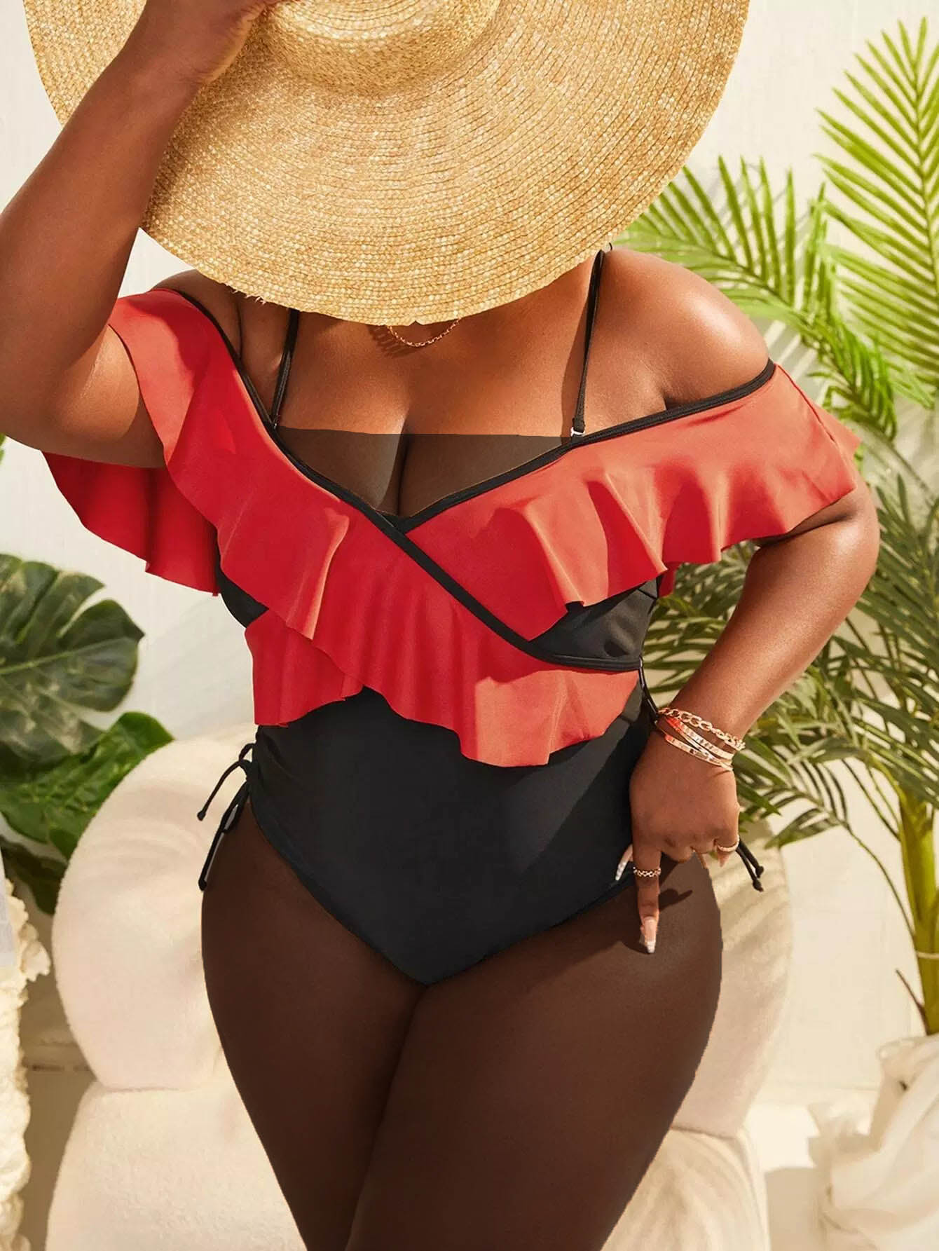 بدلة سباحة بقطعة واحدة من قطعة واحدة مكشكشة ذات حواف متقاطعة بلون مغاير