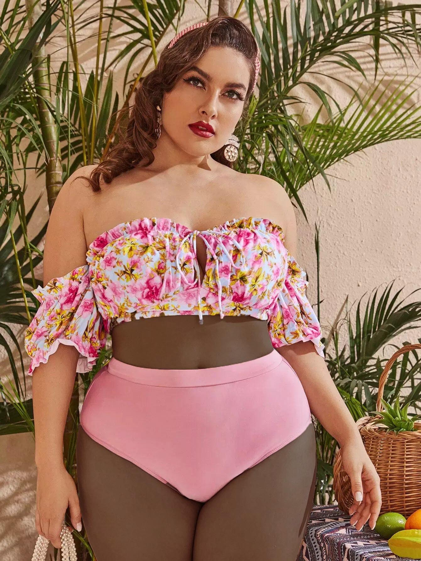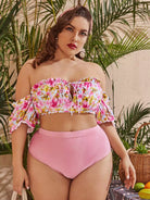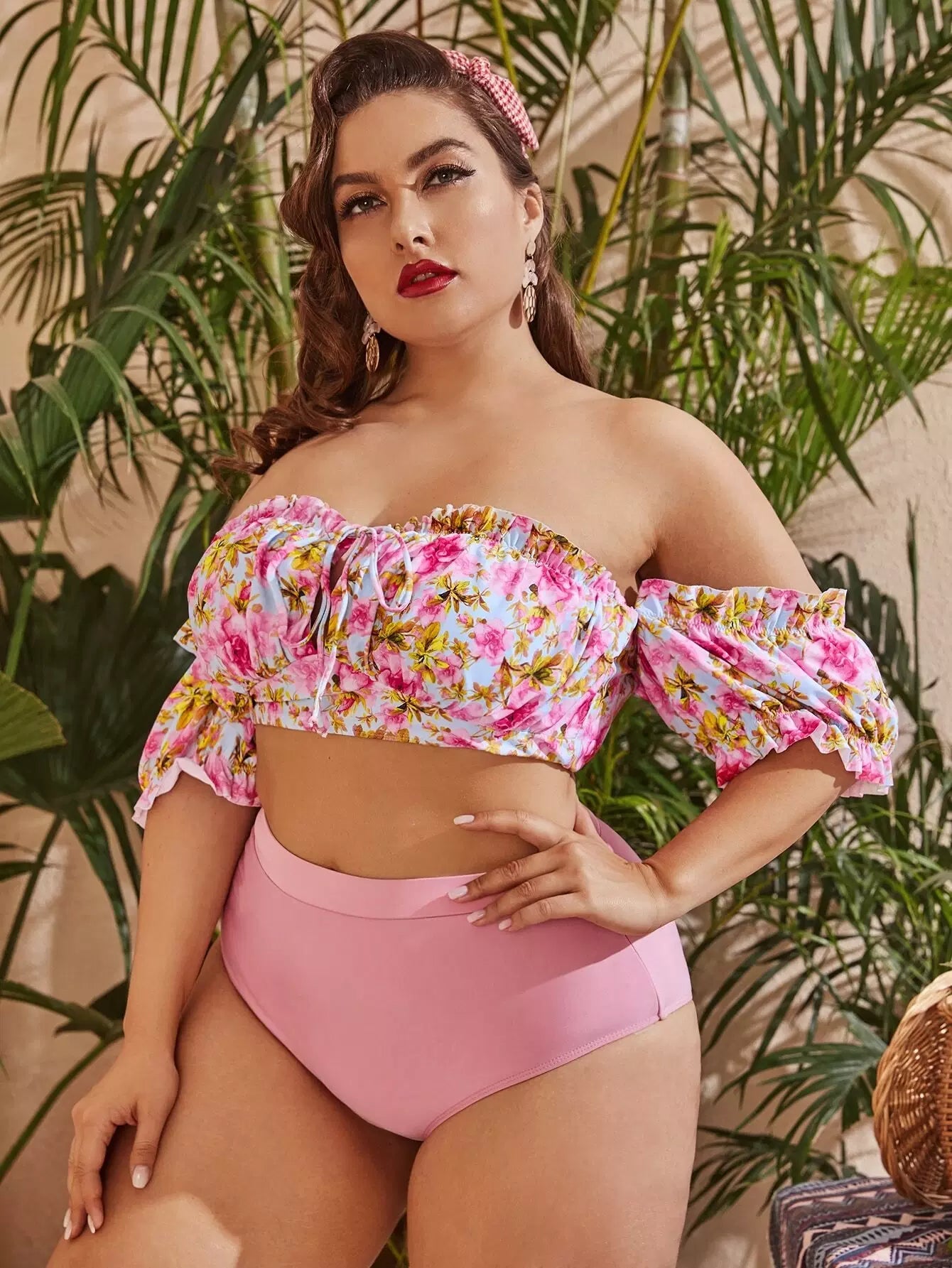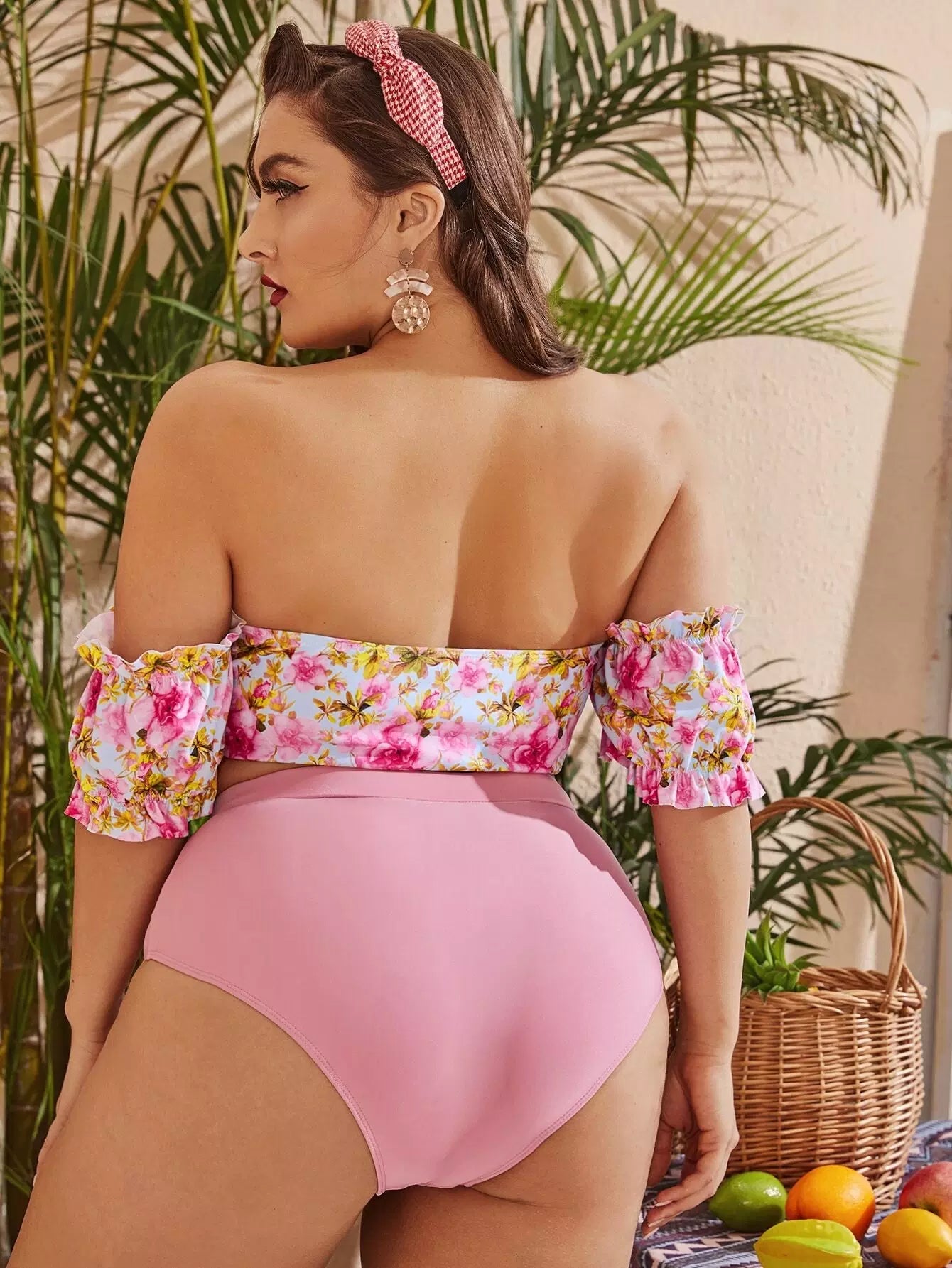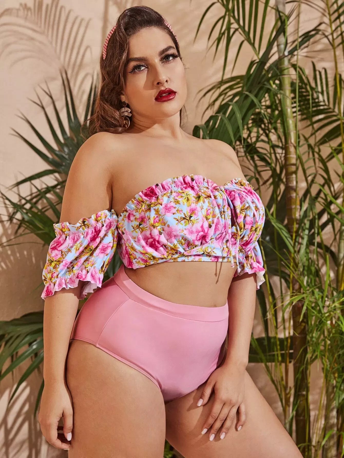 بدلة سباحة بيكيني عالية الخصر بكشكش زائد زهري باردوت
