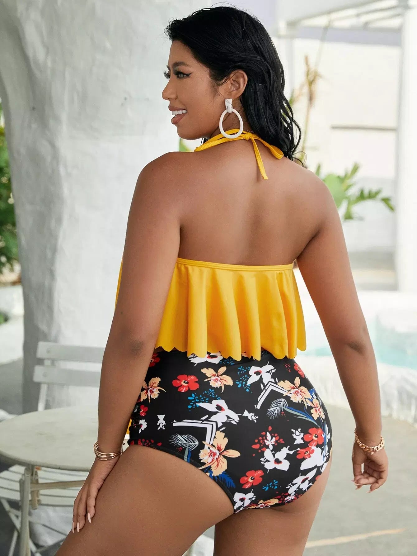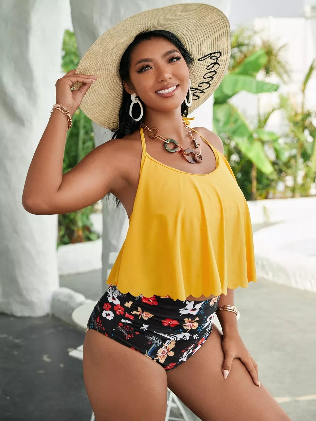 بيكيني سباحة بيكيني بطبعة زهور زائد مزين بحافة صدف