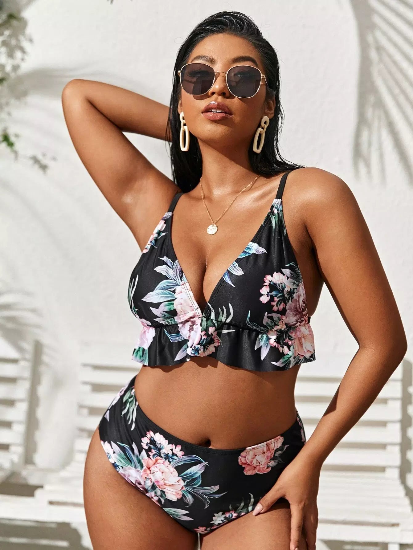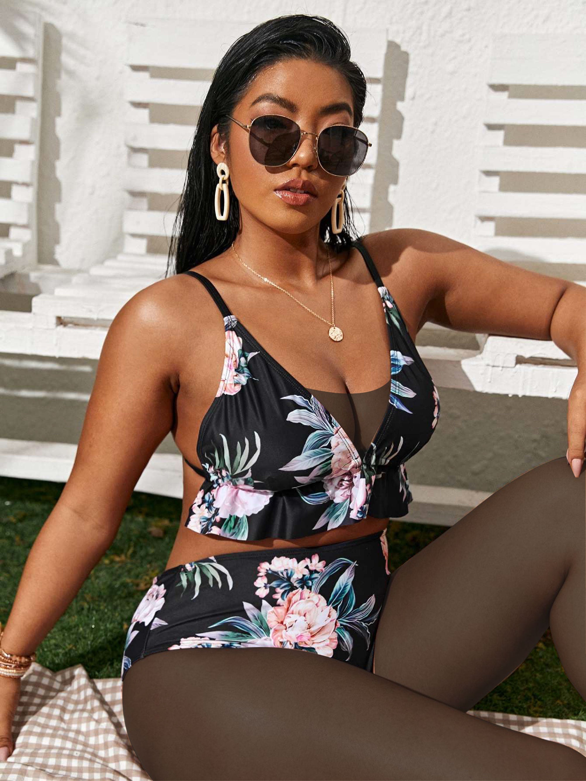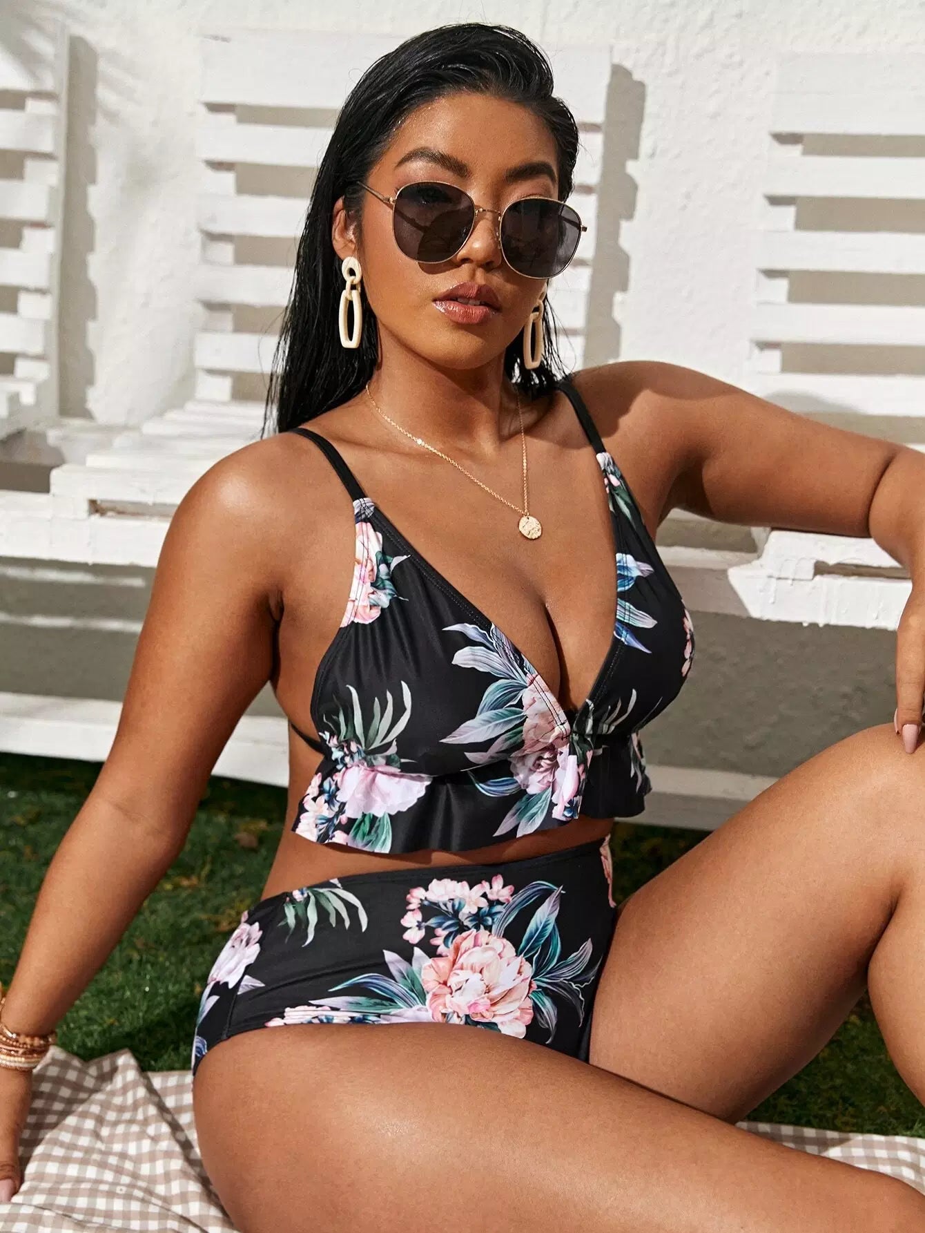 مايوه سباحة بيكيني بحافة كشكش زائد زهري