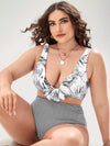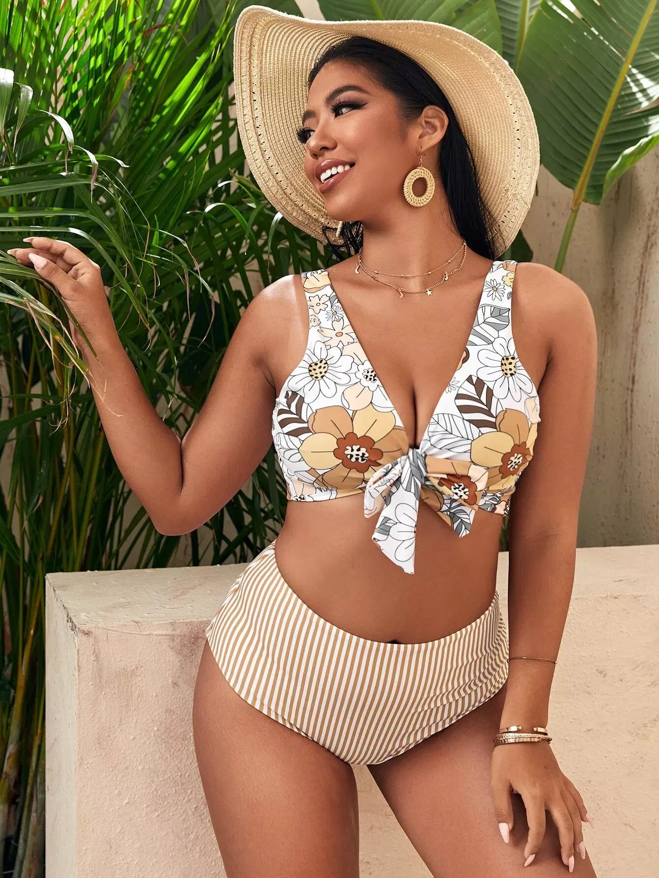 بدلة سباحة بيكيني مخطط ومزركش بعقدة أمامية زائد