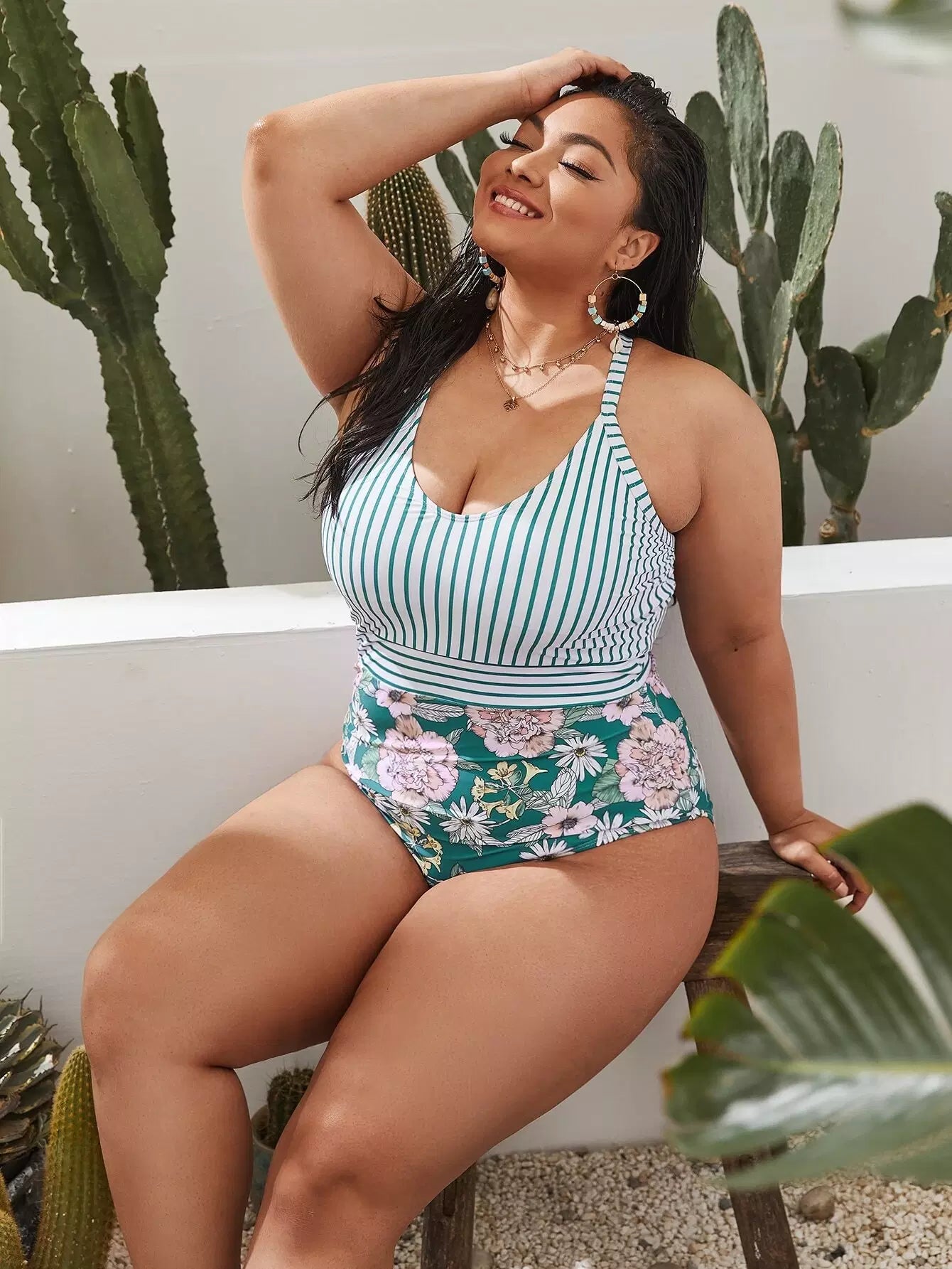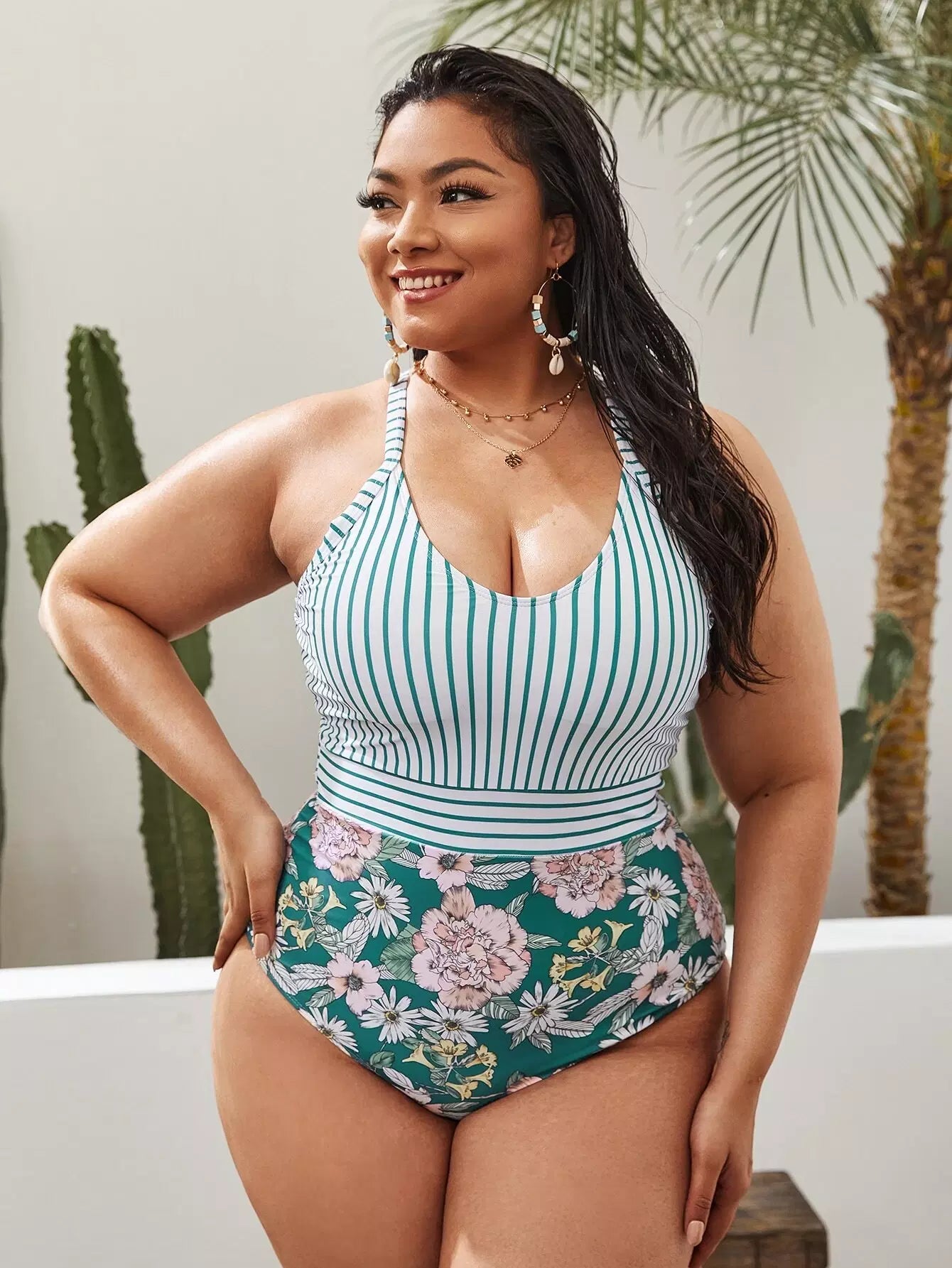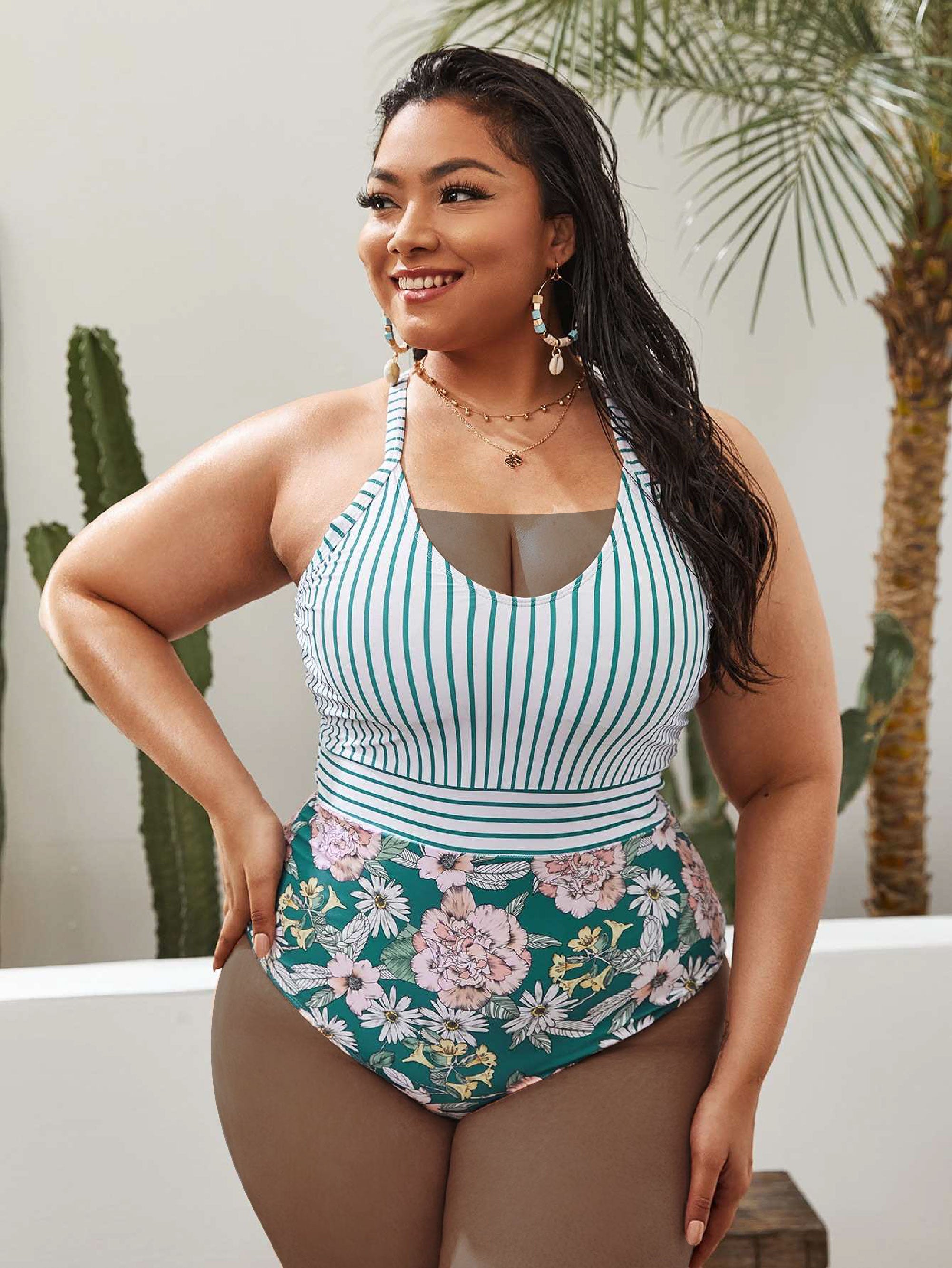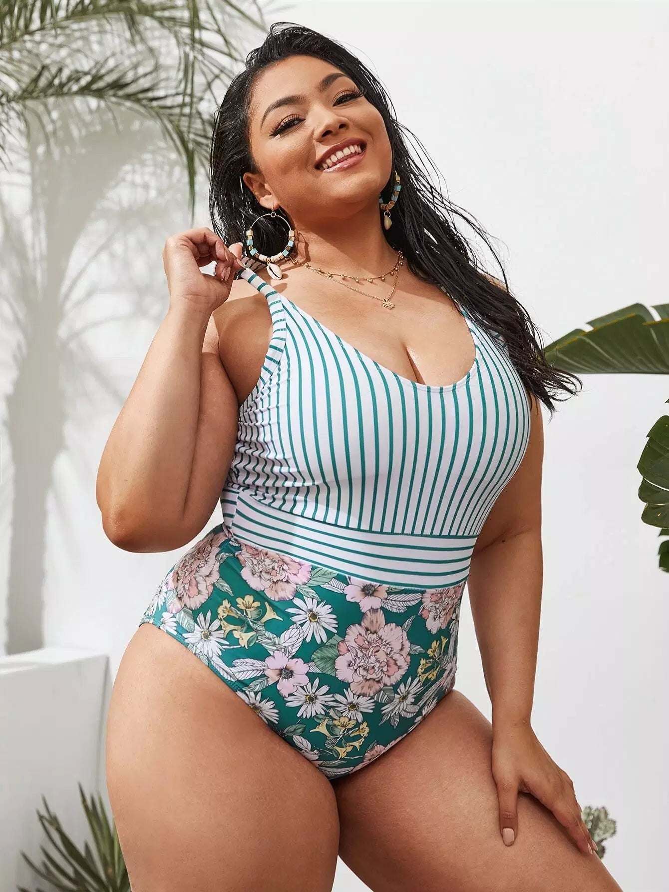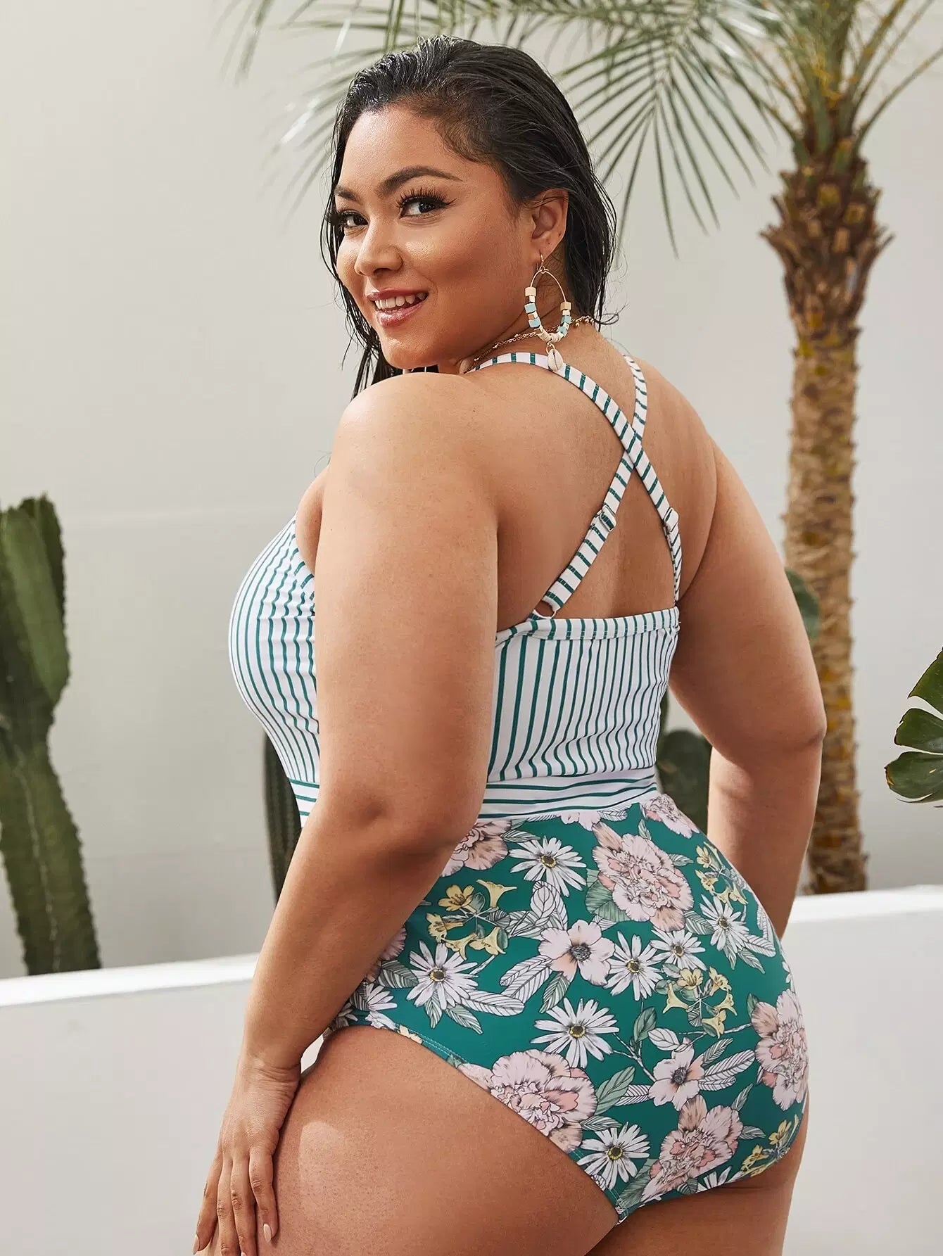 بدلة سباحة بقطعة واحدة مخططة ومزينة بالأزهار والزهور