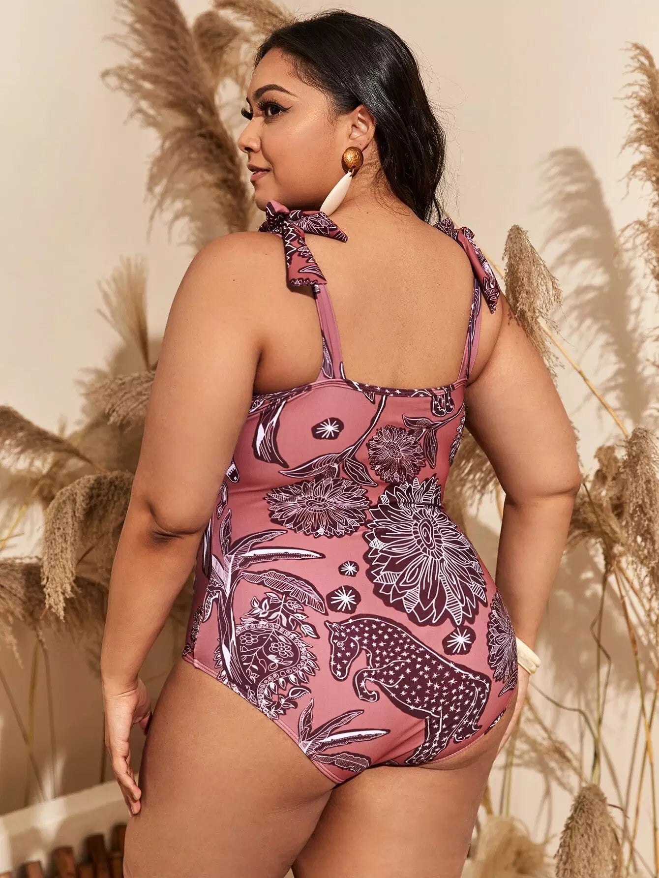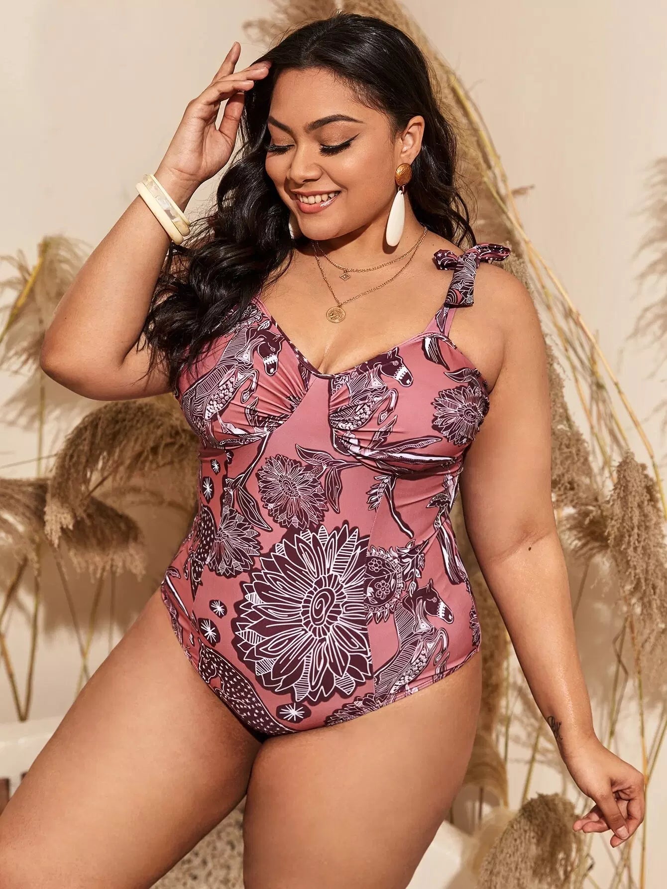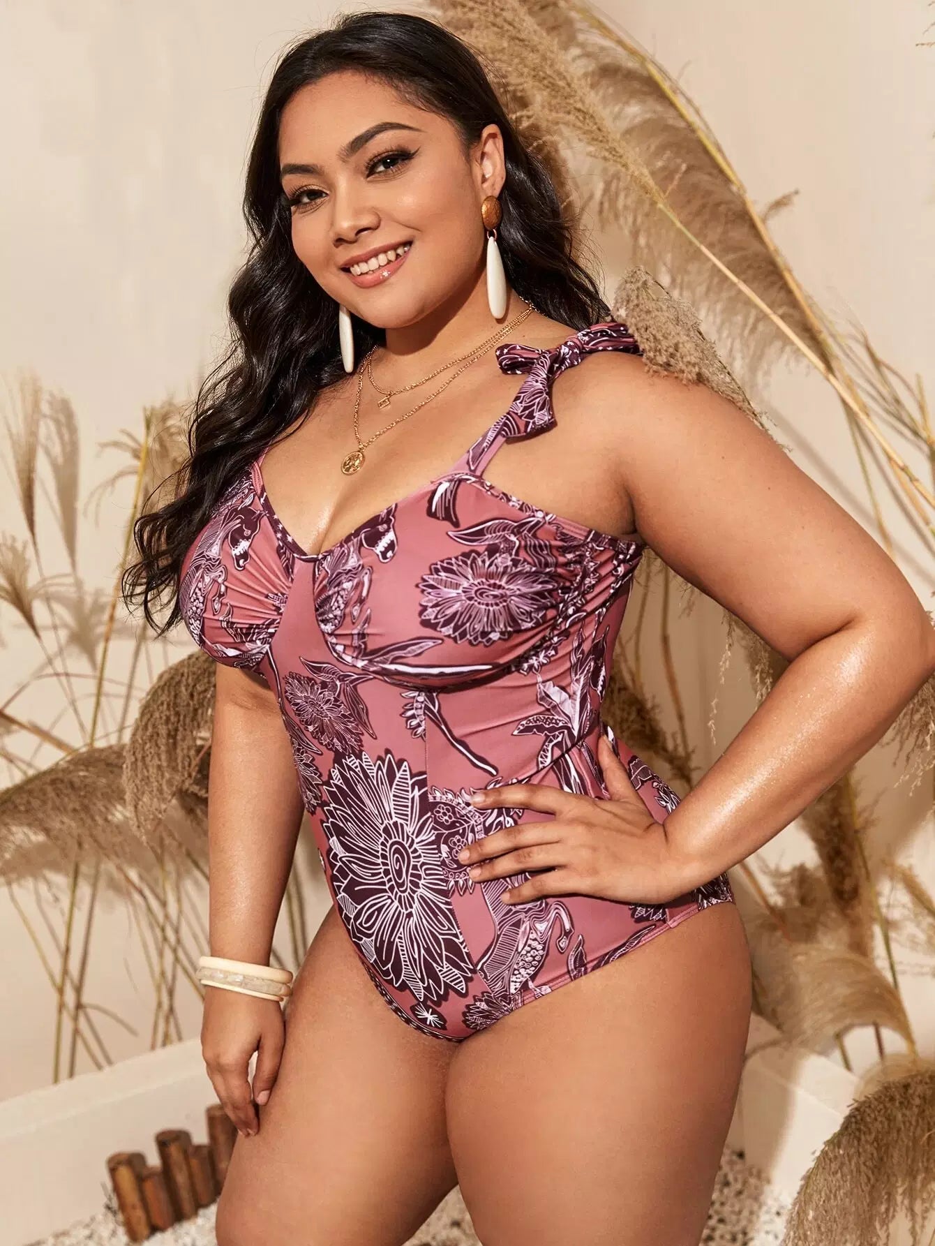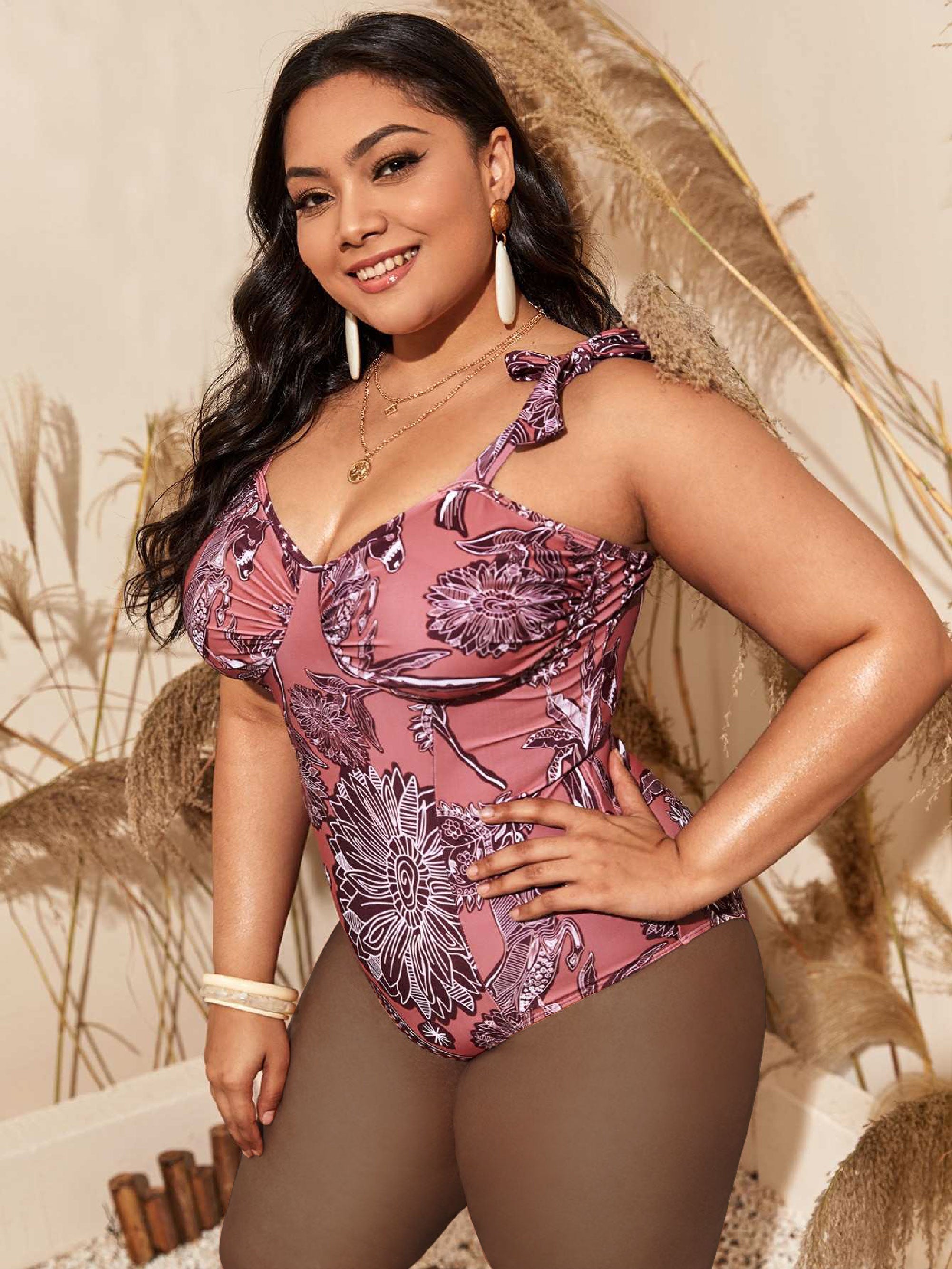 بدلة سباحة بقطعة واحدة بقطعة واحدة مزينة بربطة كتف زهرية زائد