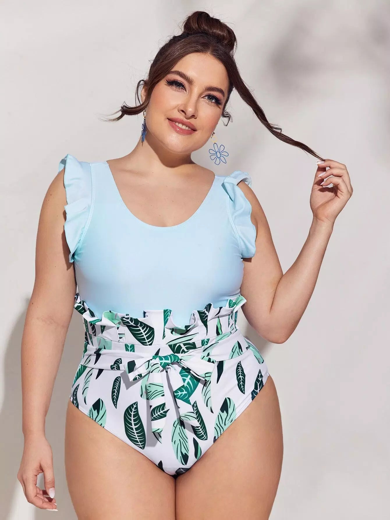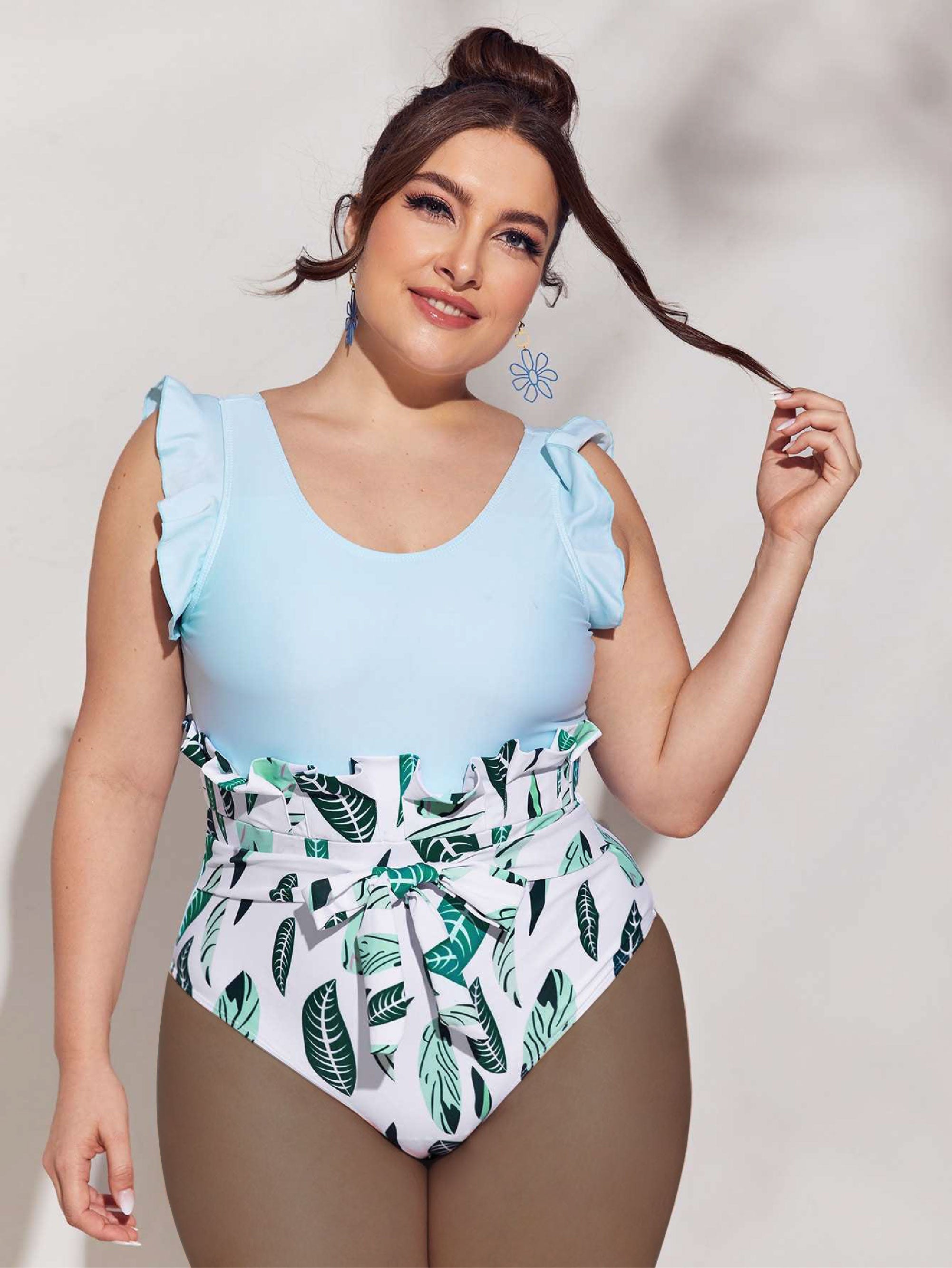 نحيف - مقاس كبير بدلة سباحة من قطعة واحدة بعقدة أمامية مكشكشة على شكل ورقة شجر