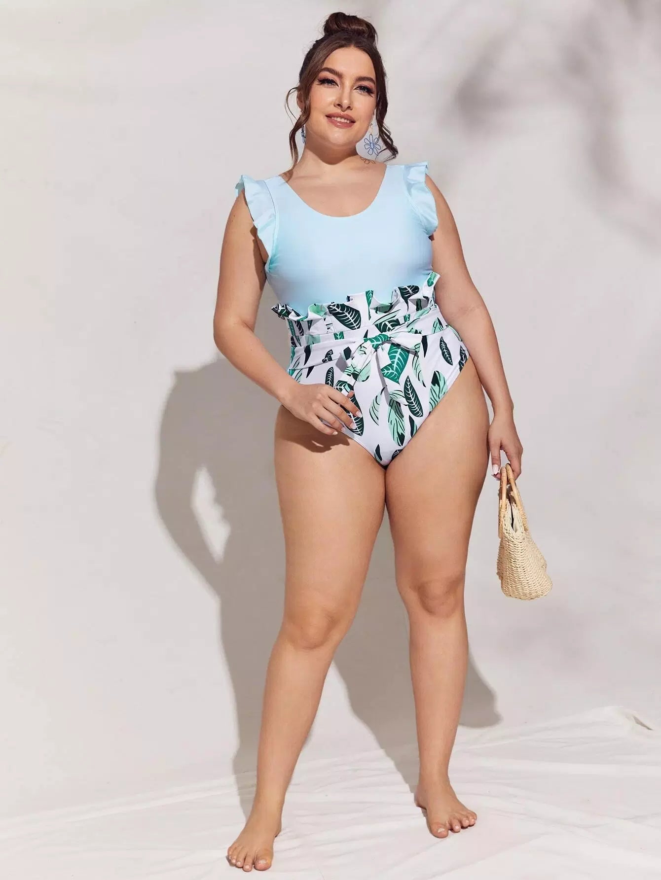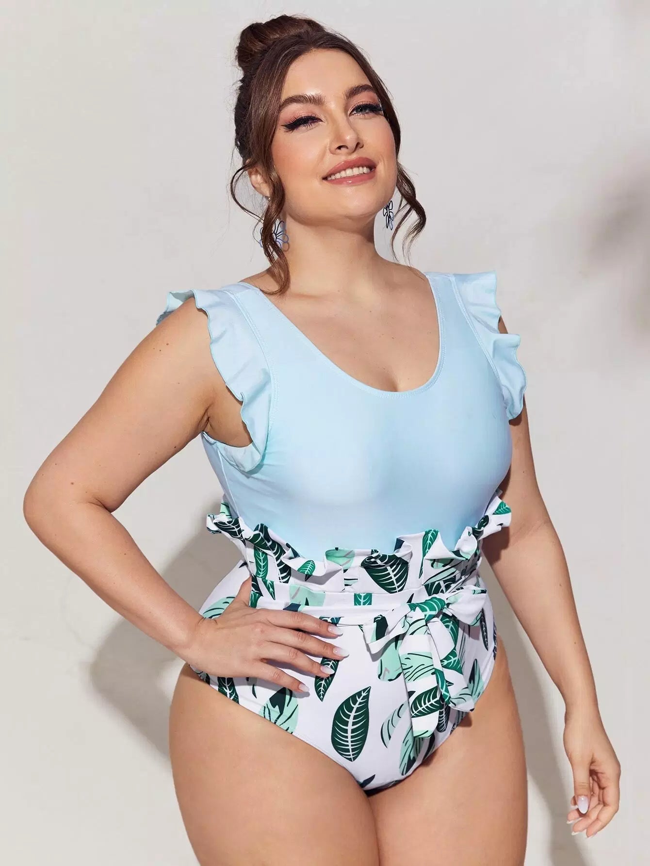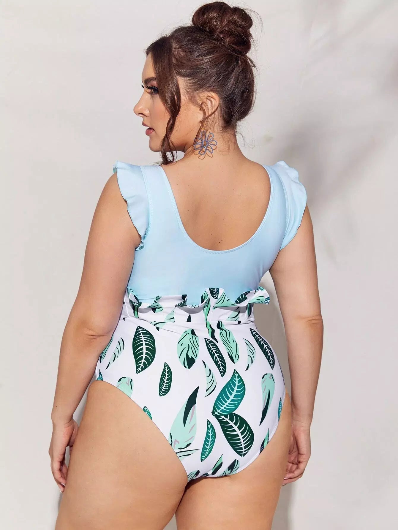 بدلة سباحة بقطعة واحدة من قطعة واحدة مطبوع عليها كشكش من الأمام بطبعة أوراق الشجر
