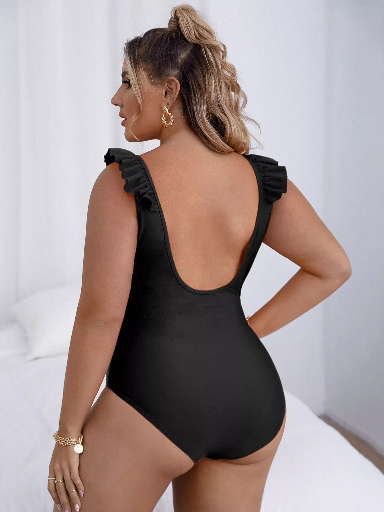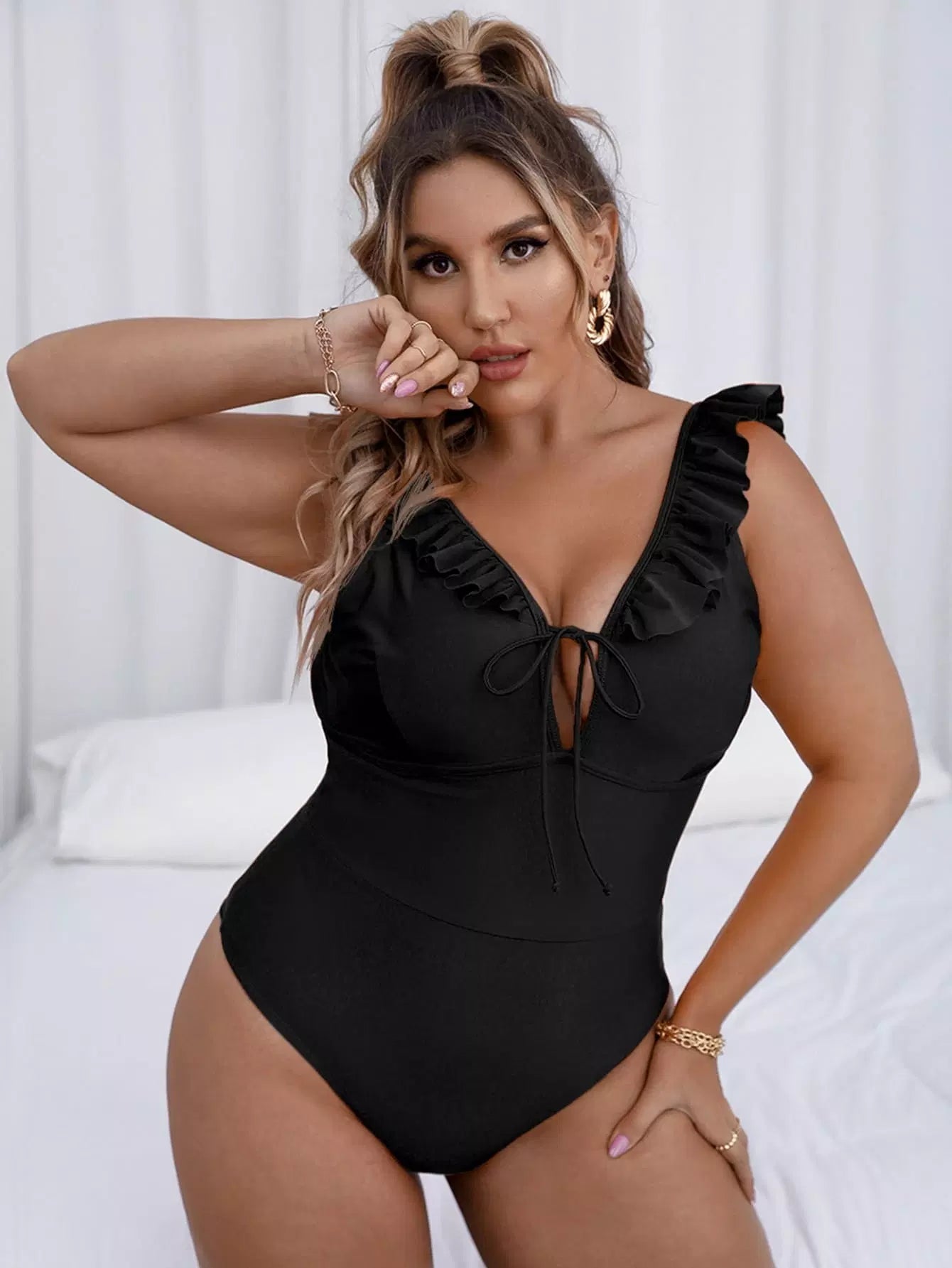 بدلة سباحة بقطعة واحدة من قطعة واحدة مكشكشة برباط أمامي زائد