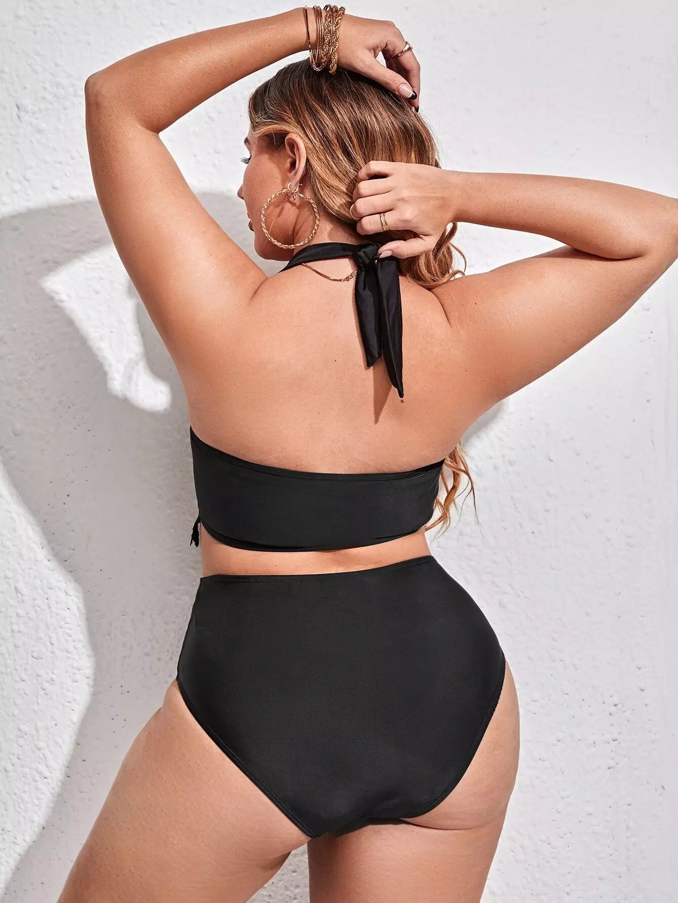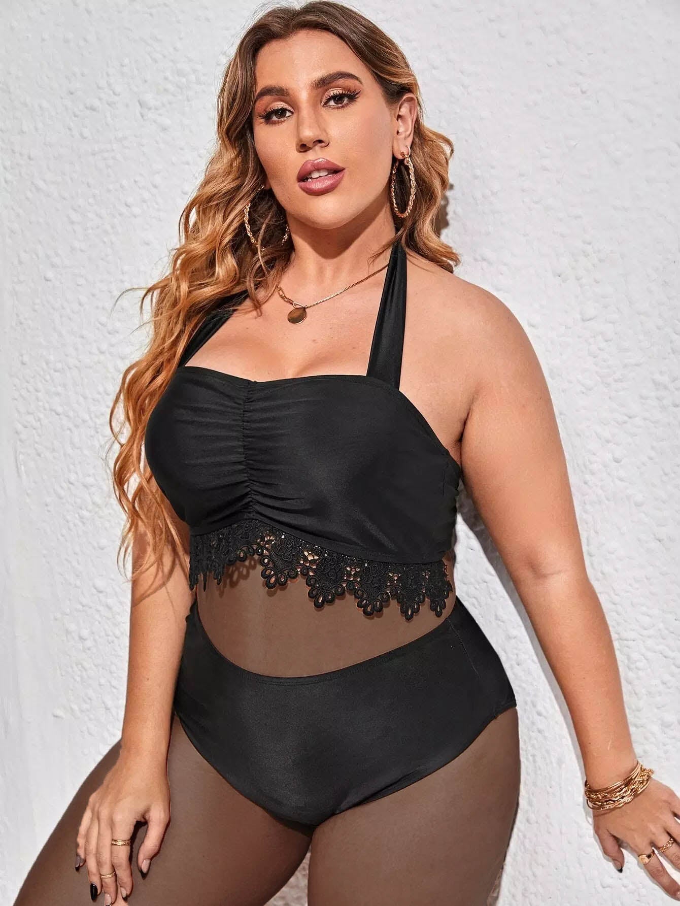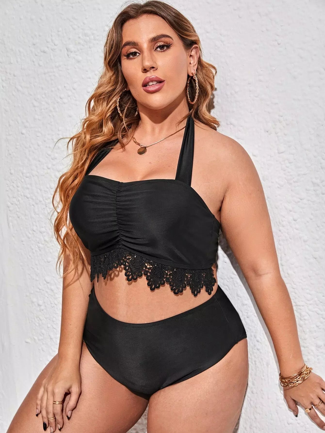 بدلة سباحة بيكيني دانتيل بلون مغاير من الدانتيل المكشكش على الصدر