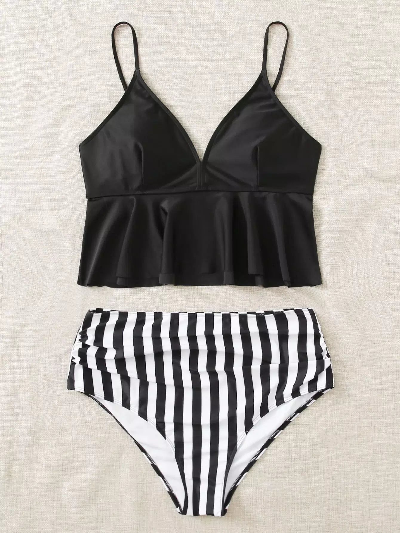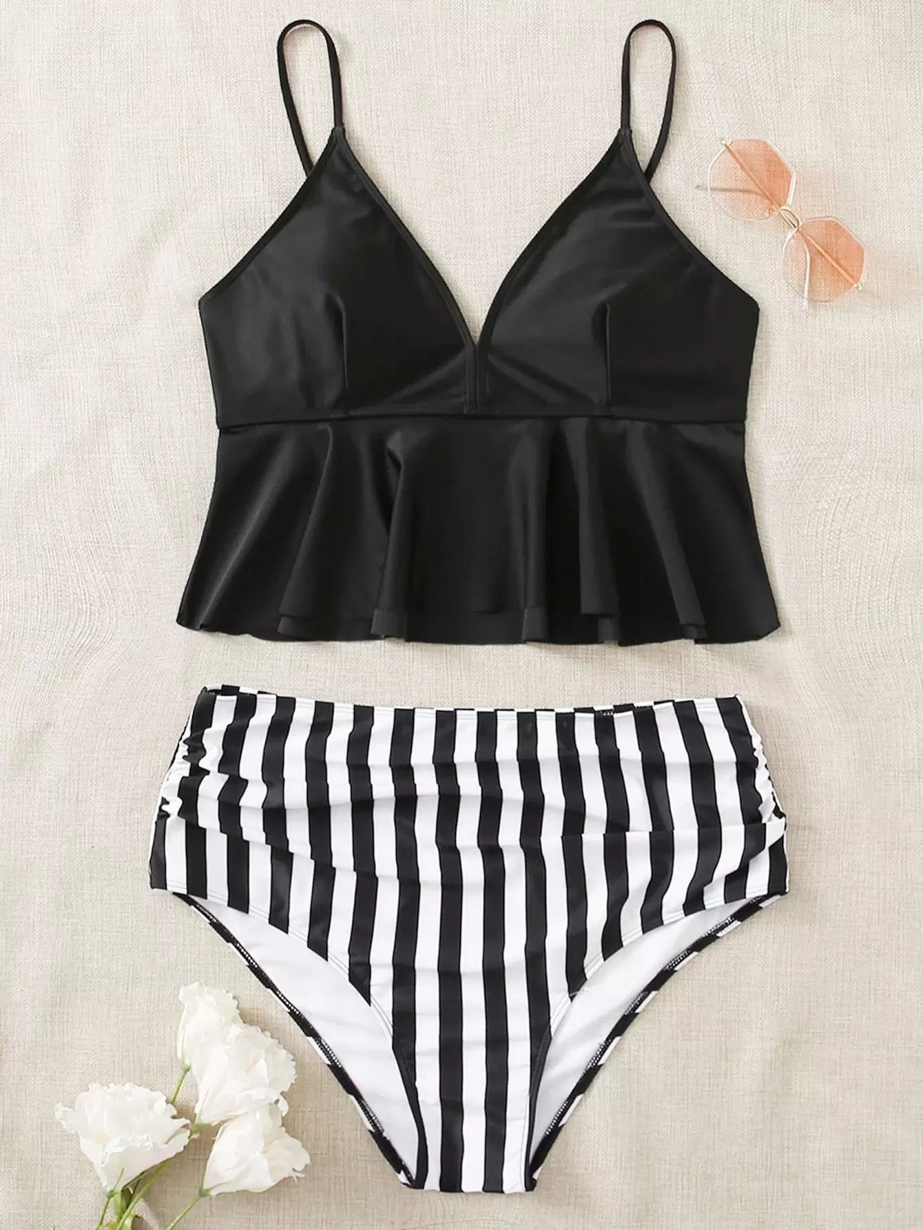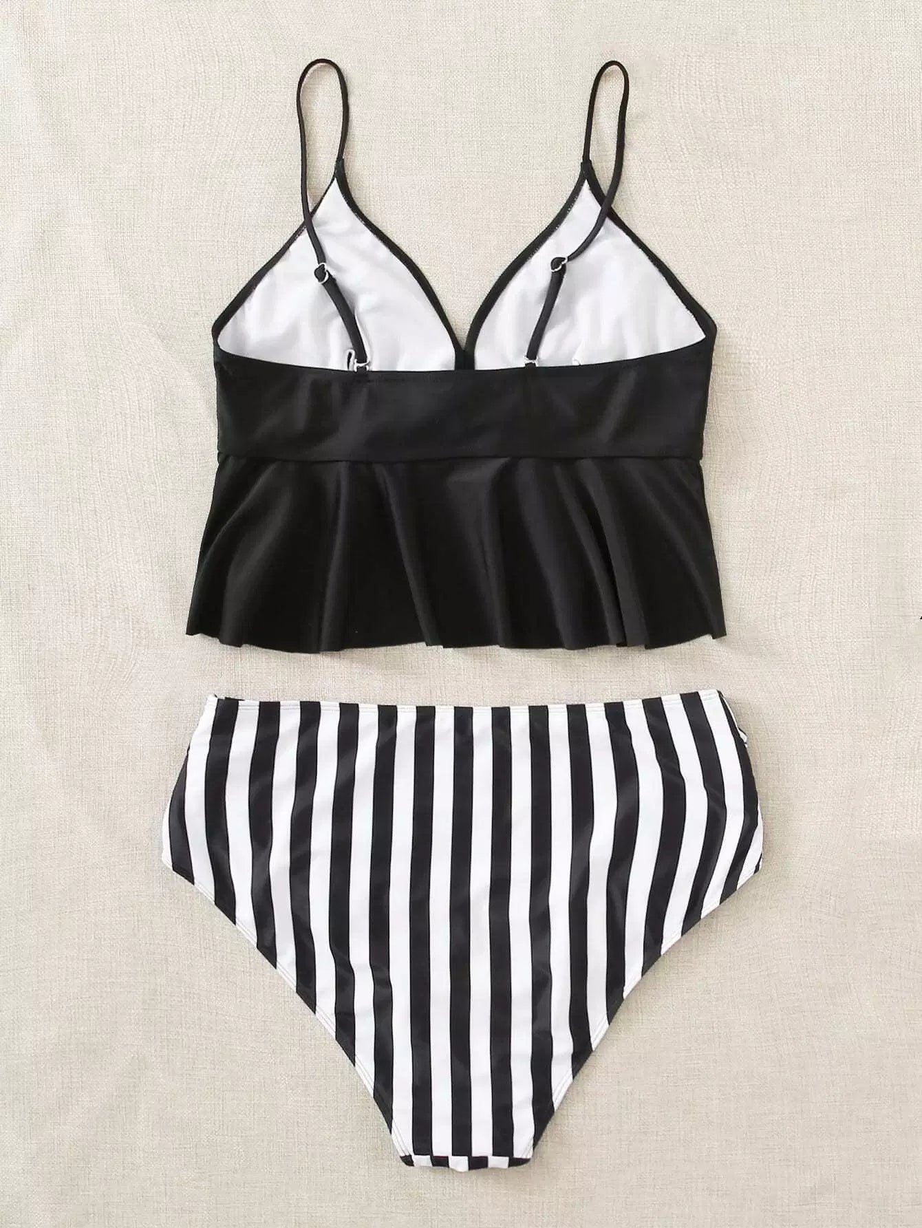 بدلة سباحة بيكيني بكيني مخطط بحافة مكشكشة عالية الخصر
