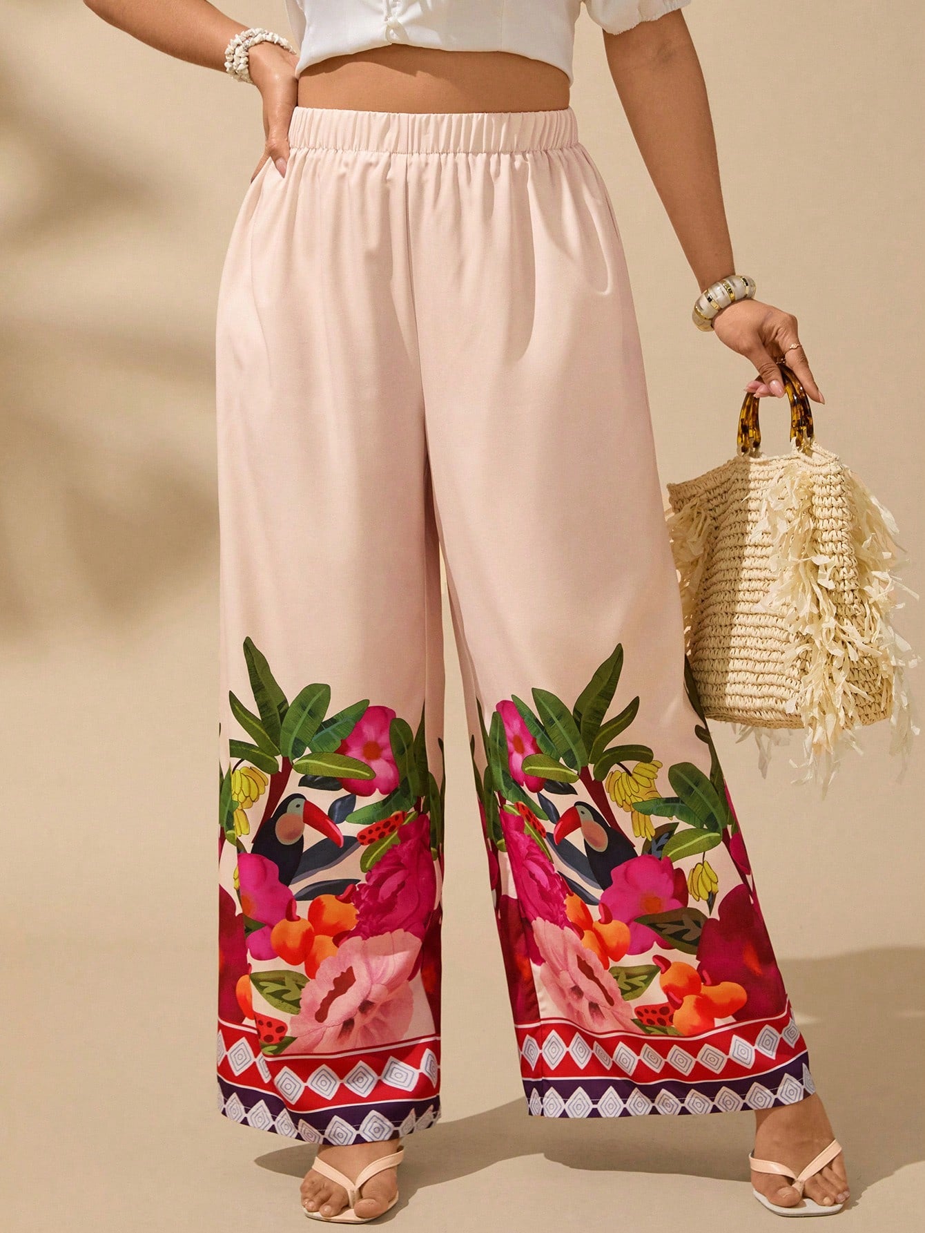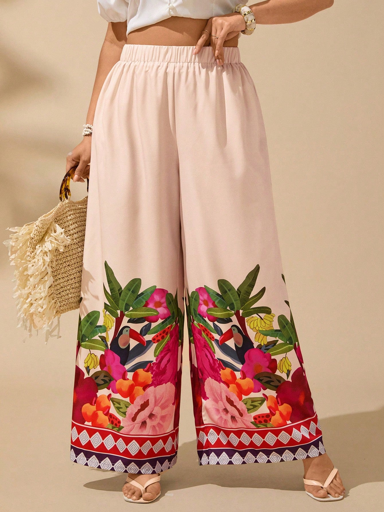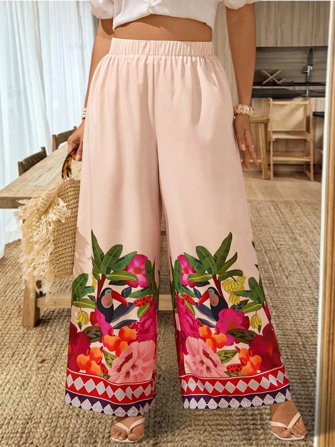 women Breezaya Flowers Birds Plus Size Wide Leg Pants