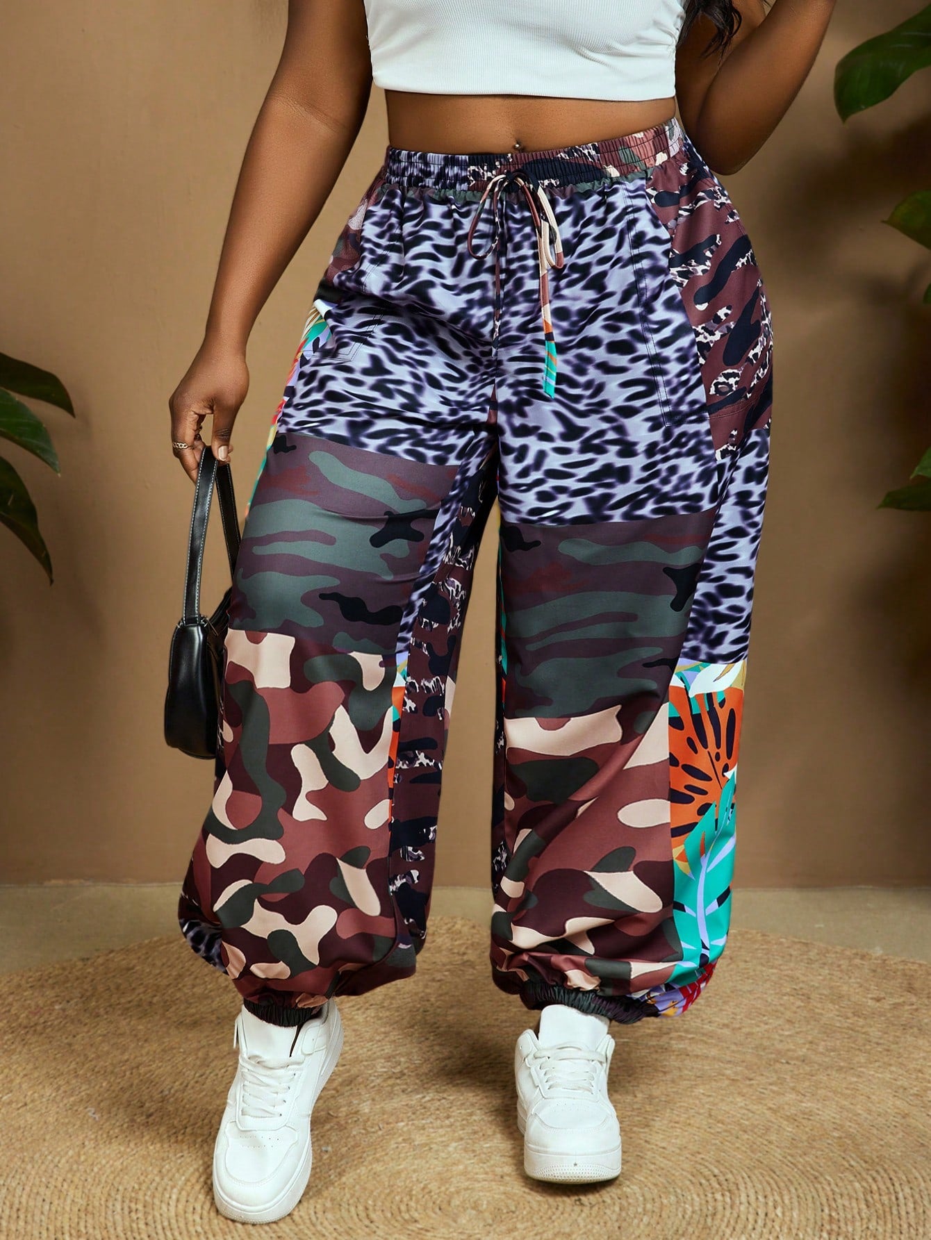 CURVE+ Plus Size Women Camouflage & Leopard Print Patchwork Casual Loose Pants, Curve Plus, Boho Vacation