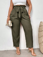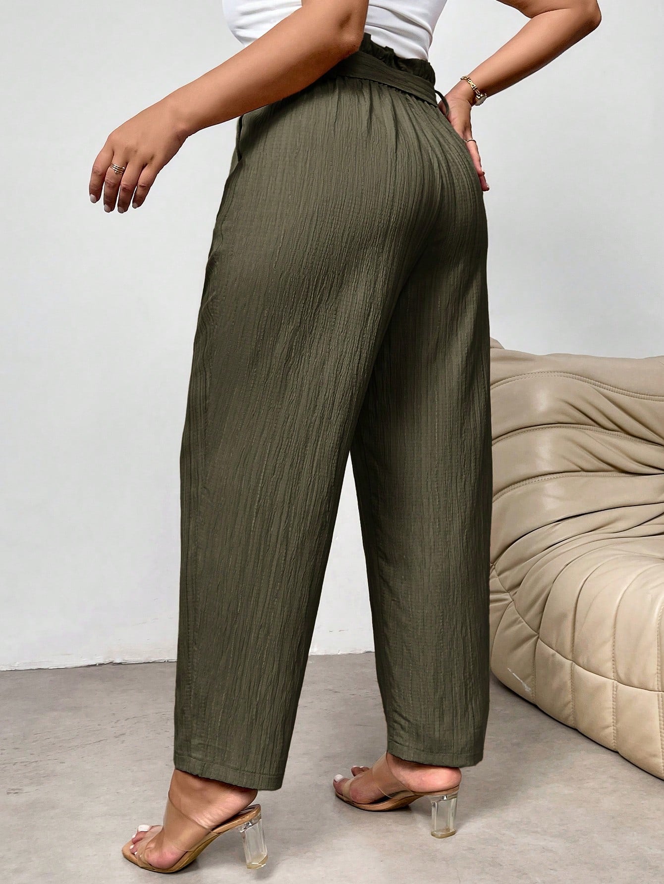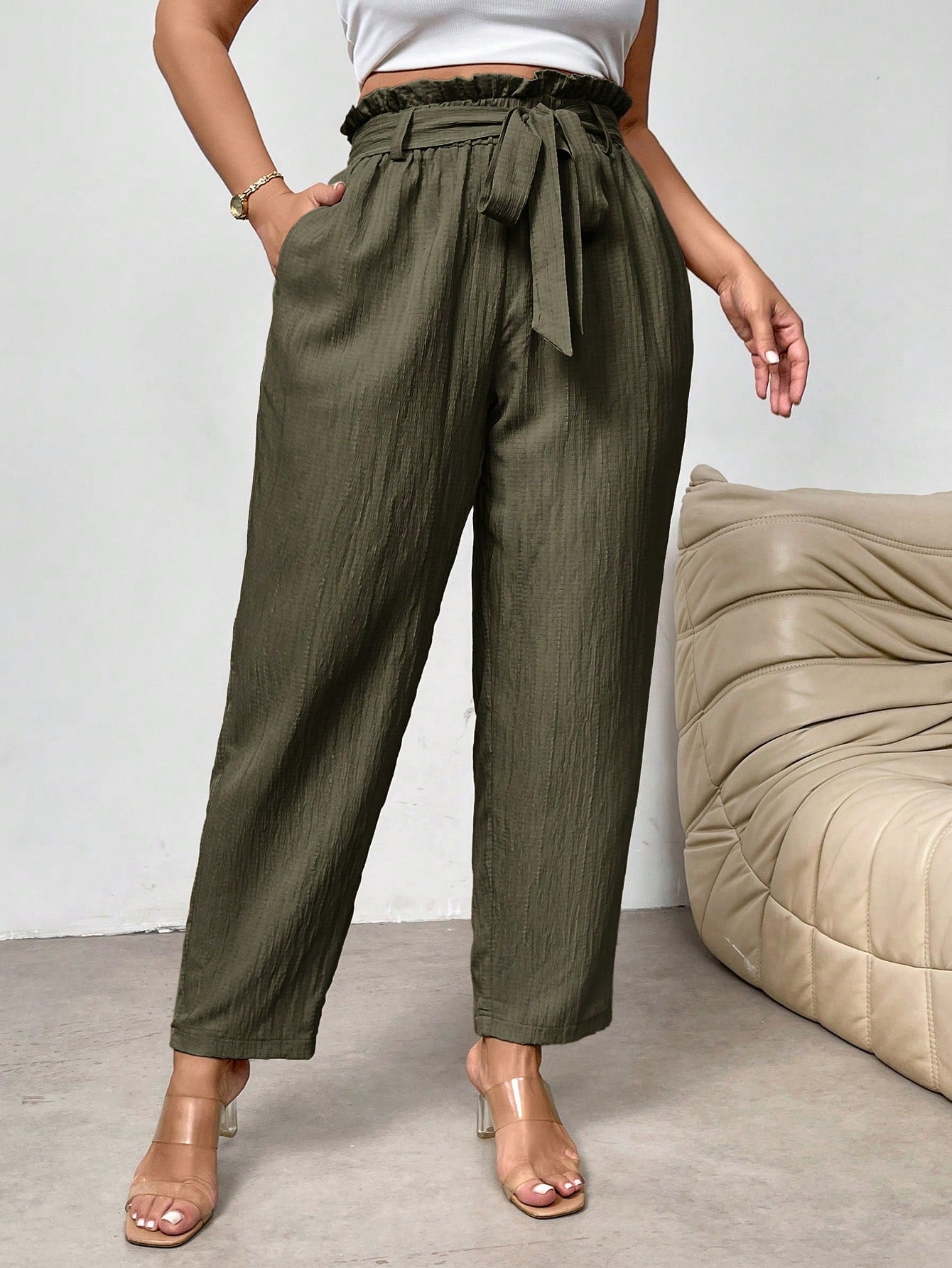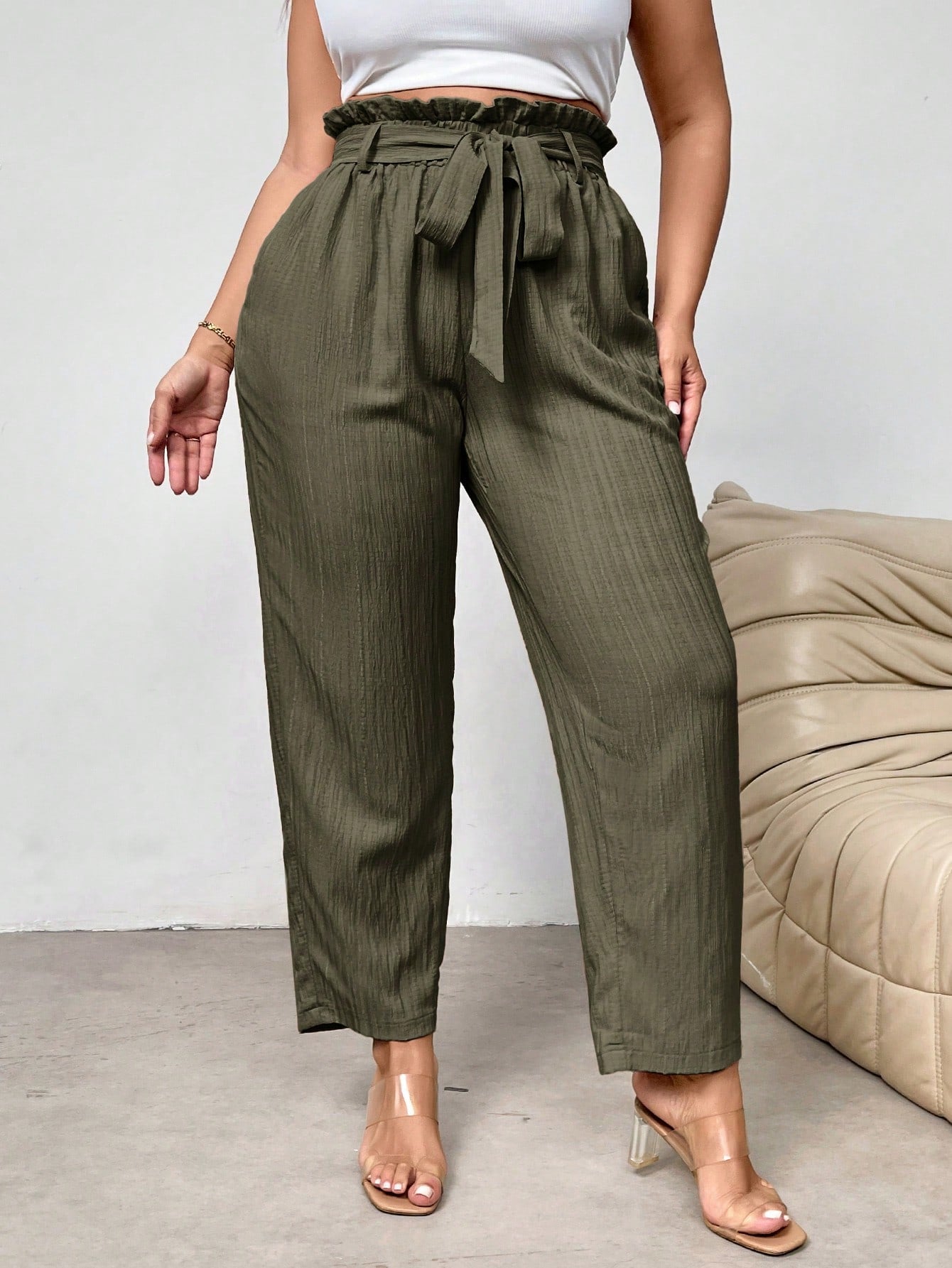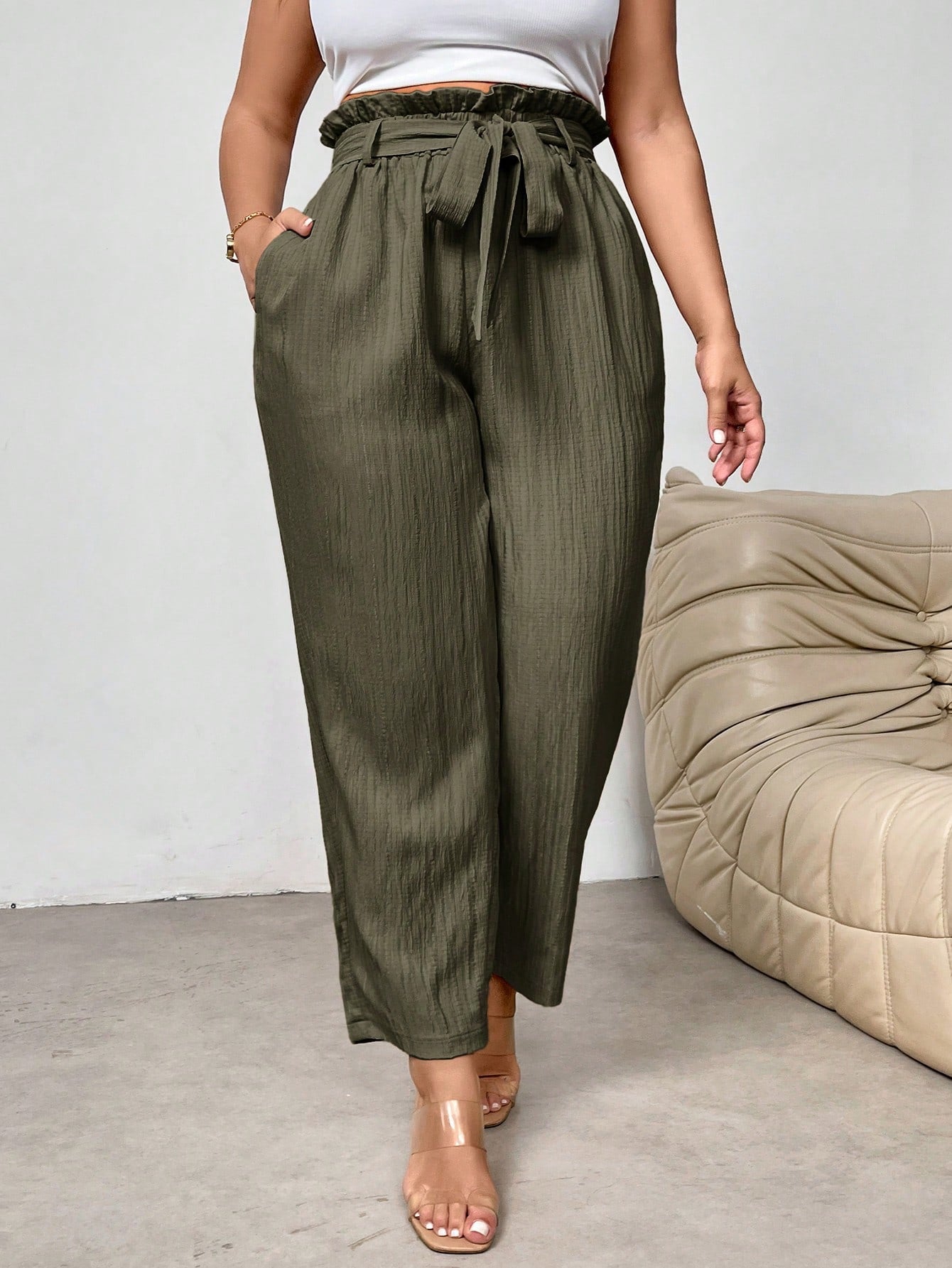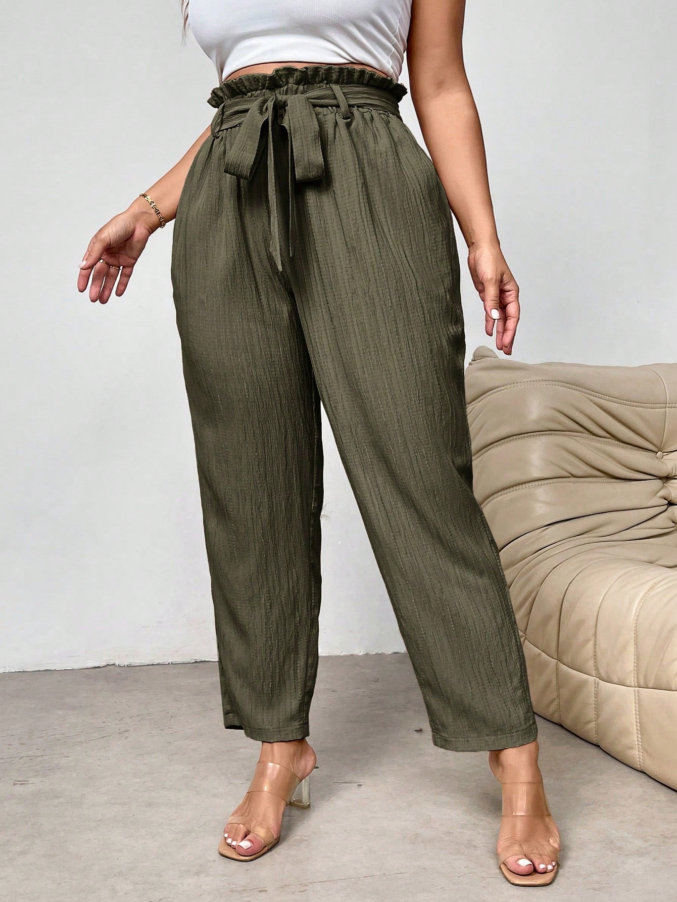 بنطلون رسمي أنيق بقصة ضيقة وخصر محدد وحافة مكشكشة من فايري، بمقاسات كبيرة، مزود بجيوب.